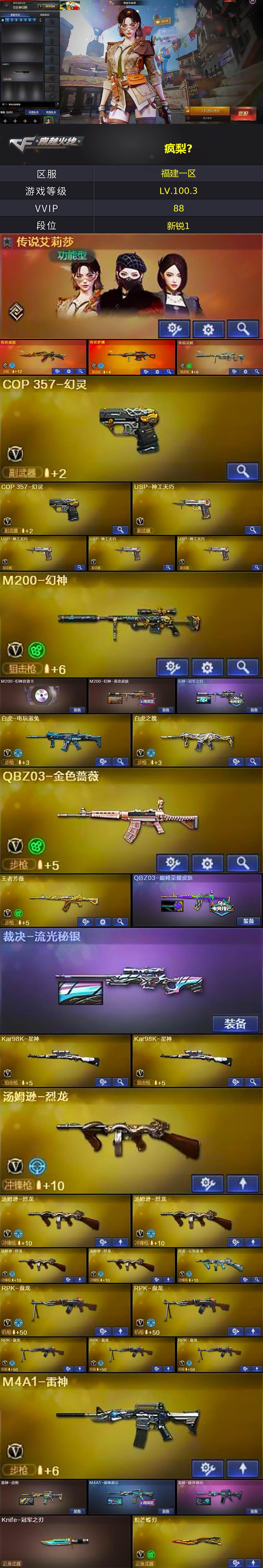 【热门武器】:传说梦魇,传说夜影,传说灵眸,QBZ03-金色蔷薇,M14EBR-玄武,M4A1-青龙,M200-幻神,死亡之眼,白虎-电玩蓝兔,Kar98K-星神*2,C.A.T,炼狱-迷你小钢,毒蜂,M4A1-黑骑士*2,汤姆逊-烈龙*5,RPK-盘龙*5,加特林-炼狱,COP 357-幻灵*2,沙鹰-修罗,柯尔特-赛博朋克*2,Knife-冠军之刃,炽芒蝶刃,金刚伞