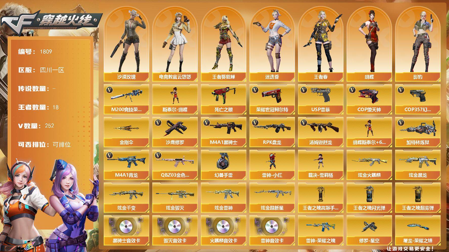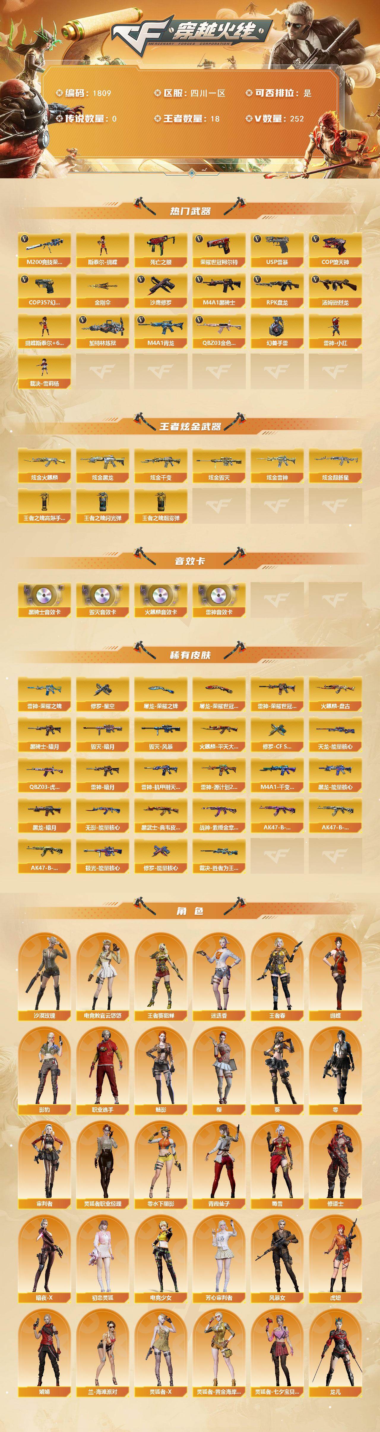 [16077793]四川一区-252V-18王者-9炫金 【热门武器】:QBZ03-金色蔷薇,M4A1-青龙,M200-竞技荣光,死亡之眼,荣耀世冠-柯尔特*3,M4A1-黑骑士,汤姆逊-烈龙*6,RPK-盘龙*6,加特林-炼狱*3,斯泰尔-蝴蝶,雷神-小红,裁决-雪莉杨,USP-雷暴,COP-堕天神*2,COP 357-幻灵*2,沙鹰-修罗*4,金刚伞,高爆手雷-幻兽*5 【王者炫金武器】:炫金火麒麟,炫金黑龙,炫金千变*3,炫金雷神,炫金超新星*2,炫金毁灭,王者之魄高爆手雷*2,王者之魄闪光弹,王者之魄烟雾弹 【音效卡】:AK47-火麒麟音效卡,M4A1-雷神音效卡,M4A1-黑骑士音效卡,Barrett-毁灭音效卡 【皮肤】:QBZ03-虎鱼 皮肤,裁决-胜者为王 皮肤,雷神-暗月*2,雷神-荣耀之魄,雷神-荣耀世冠AG,雷神-机甲刑天皮肤,雷神-源计划2.0专属 皮肤,火麒麟-平天大圣*3,火麒麟-盘古,毁灭-暗月,毁灭-风暴*2,M4A1-千变-孔明皮肤,黑龙-能量核心,黑龙-暗月,黑骑士-暗月,无影-能量核心,黑武士-典韦皮肤,战神-紫绶金章皮肤,AK47-B-常胜将军-曹操*2,AK47-B-常胜将军-刘备,AK47-B-常胜将军-孙权*2,天龙-能量核心,极光-能量核心*2,修罗-CF STAR,修罗-能量核心*4,修罗-星空*2,屠龙-荣耀之锋*2,屠龙-荣耀世冠AG 【角色】:零,葵,樱,蝴蝶,魅影,迷迭香,沙漠玫瑰,影豹,电竞教官-云悠悠,审判者,王者-葵-貂蝉,王者春,修道士,暗夜-X,初恋灵狐,电竞少女,芳心审判者,风暴女,虎妞,娟娟,兰-海滩派对,零-水下丽影,灵狐者-X,灵狐者-黄金海岸,灵狐者-七夕宝贝,灵狐者-职业经理,龙儿,龙儿-小淘气,麻雀,曼陀罗-X,曼陀罗-礼服,萌儿,女战神,潘多拉-X,潘多拉-甜心教官,潜龙队-X,青霞仙子,蛇姬,蜀雪,兔囡囡,新娜塔莎,雪莉杨-摸金校尉,夜玫瑰-宠粉,樱-战斗天使,樱-缤纷夏日,职业选手 【人偶武器】:雷神-小红,裁决-雪莉杨,斯泰尔-蝴蝶,巴雷特-零-水下丽影*2,迷你裂空之翼*2,迷你牛牛,迷你生化手雷,闪光弹-小乔,闪光弹-貂蝉,高爆手雷-大乔 【暴走生化】:死亡之眼,超级对讲机 【挑战大师】:冰龙粉碎者-白马银枪,激光毁灭者III-白马银枪,VEPR-12-金魔,机甲撕裂者III,KAC-圣炎切
