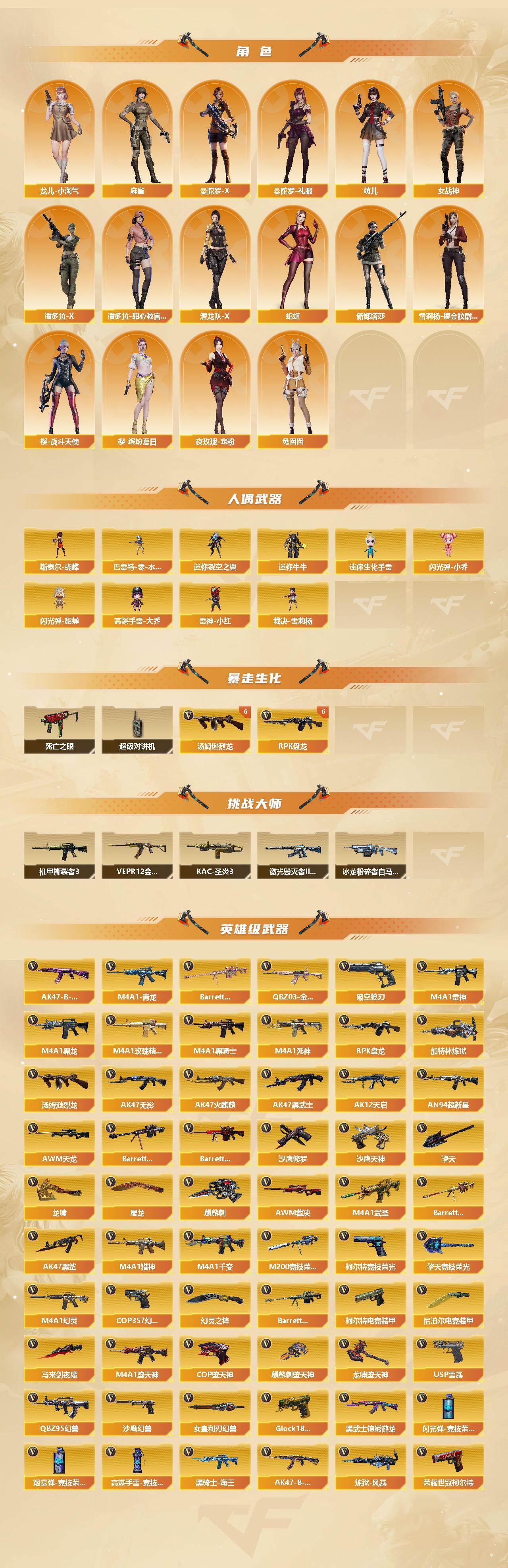 【角色】:零,葵,樱,蝴蝶,魅影,迷迭香,沙漠玫瑰,影豹,电竞教官-云悠悠,审判者,王者-葵-貂蝉,王者春,修道士,暗夜-X,初恋灵狐,电竞少女,芳心审判者,风暴女,虎妞,娟娟,兰-海滩派对,零-水下丽影,灵狐者-X,灵狐者-黄金海岸,灵狐者-七夕宝贝,灵狐者-职业经理,龙儿,龙儿-小淘气,麻雀,曼陀罗-X,曼陀罗-礼服,萌儿,女战神,潘多拉-X,潘多拉-甜心教官,潜龙队-X,青霞仙子,蛇姬,蜀雪,兔囡囡,新娜塔莎,雪莉杨-摸金校尉,夜玫瑰-宠粉,樱-战斗天使,樱-缤纷夏日,职业选手