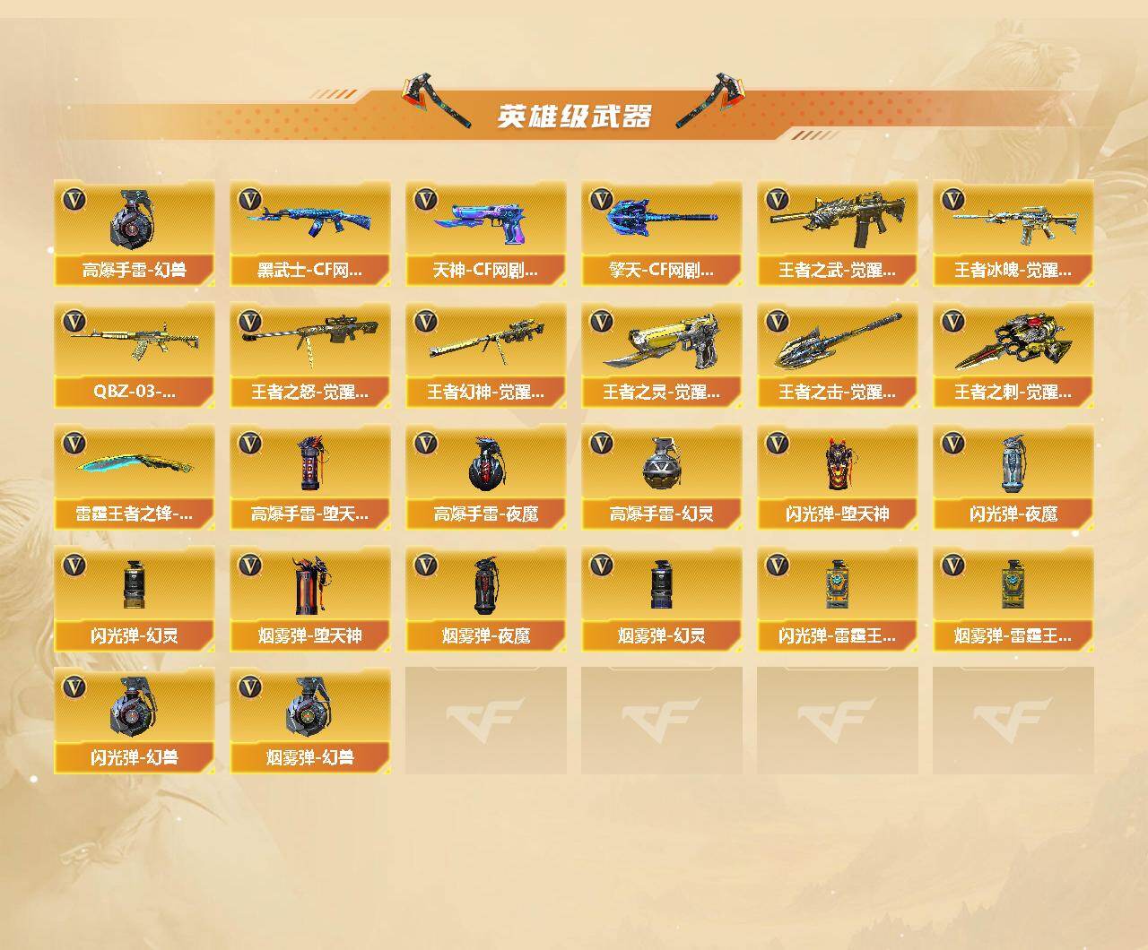 【王者炫金武器】:炫金火麒麟,炫金黑龙,炫金千变*3,炫金雷神,炫金超新星*2,炫金毁灭,王者之魄高爆手雷*2,王者之魄闪光弹,王者之魄烟雾弹
