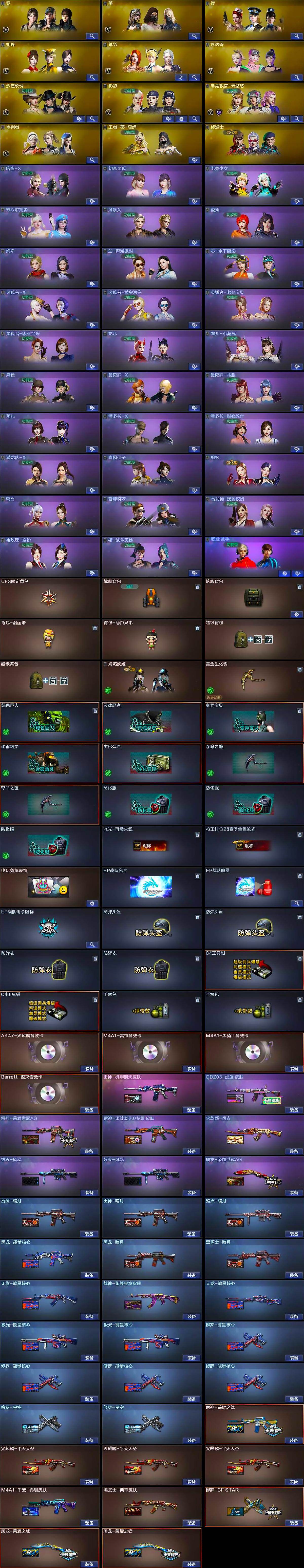 【皮肤】:QBZ03-虎鱼 皮肤,裁决-胜者为王 皮肤,雷神-暗月*2,雷神-荣耀之魄,雷神-荣耀世冠AG,雷神-机甲刑天皮肤,雷神-源计划2.0专属 皮肤,火麒麟-平天大圣*3,火麒麟-盘古,毁灭-暗月,毁灭-风暴*2,M4A1-千变-孔明皮肤,黑龙-能量核心,黑龙-暗月,黑骑士-暗月,无影-能量核心,黑武士-典韦皮肤,战神-紫绶金章皮肤,AK47-B-常胜将军-曹操*2,AK47-B-常胜将军-刘备,AK47-B-常胜将军-孙权*2,天龙-能量核心,极光-能量核心*2,修罗-CF STAR,修罗-能量核心*4,修罗-星空*2,屠龙-荣耀之锋*2,屠龙-荣耀世冠AG