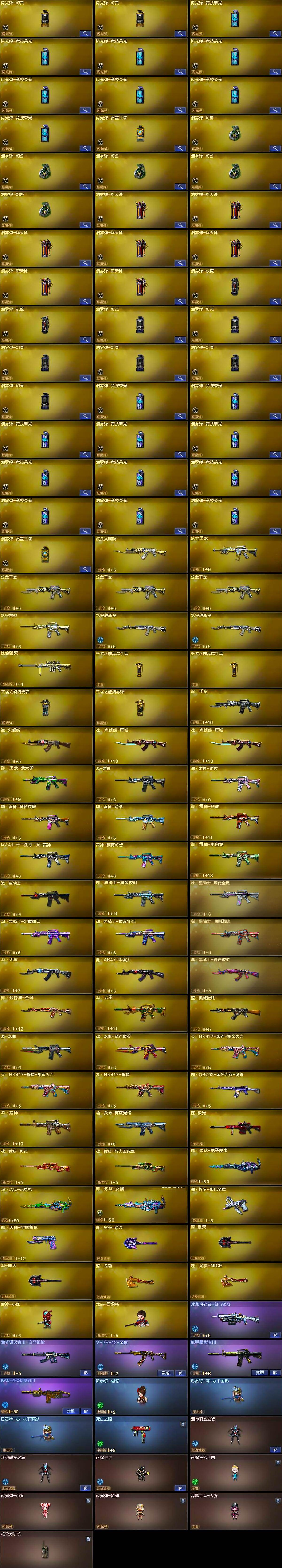 【热门武器】:QBZ03-金色蔷薇,M4A1-青龙,M200-竞技荣光,死亡之眼,荣耀世冠-柯尔特*3,M4A1-黑骑士,汤姆逊-烈龙*6,RPK-盘龙*6,加特林-炼狱*3,斯泰尔-蝴蝶,雷神-小红,裁决-雪莉杨,USP-雷暴,COP-堕天神*2,COP 357-幻灵*2,沙鹰-修罗*4,金刚伞,高爆手雷-幻兽*5