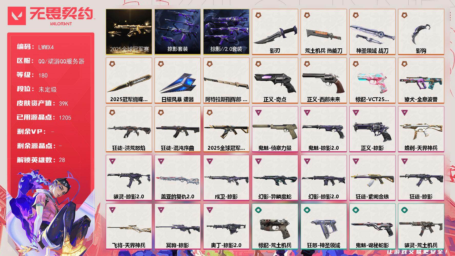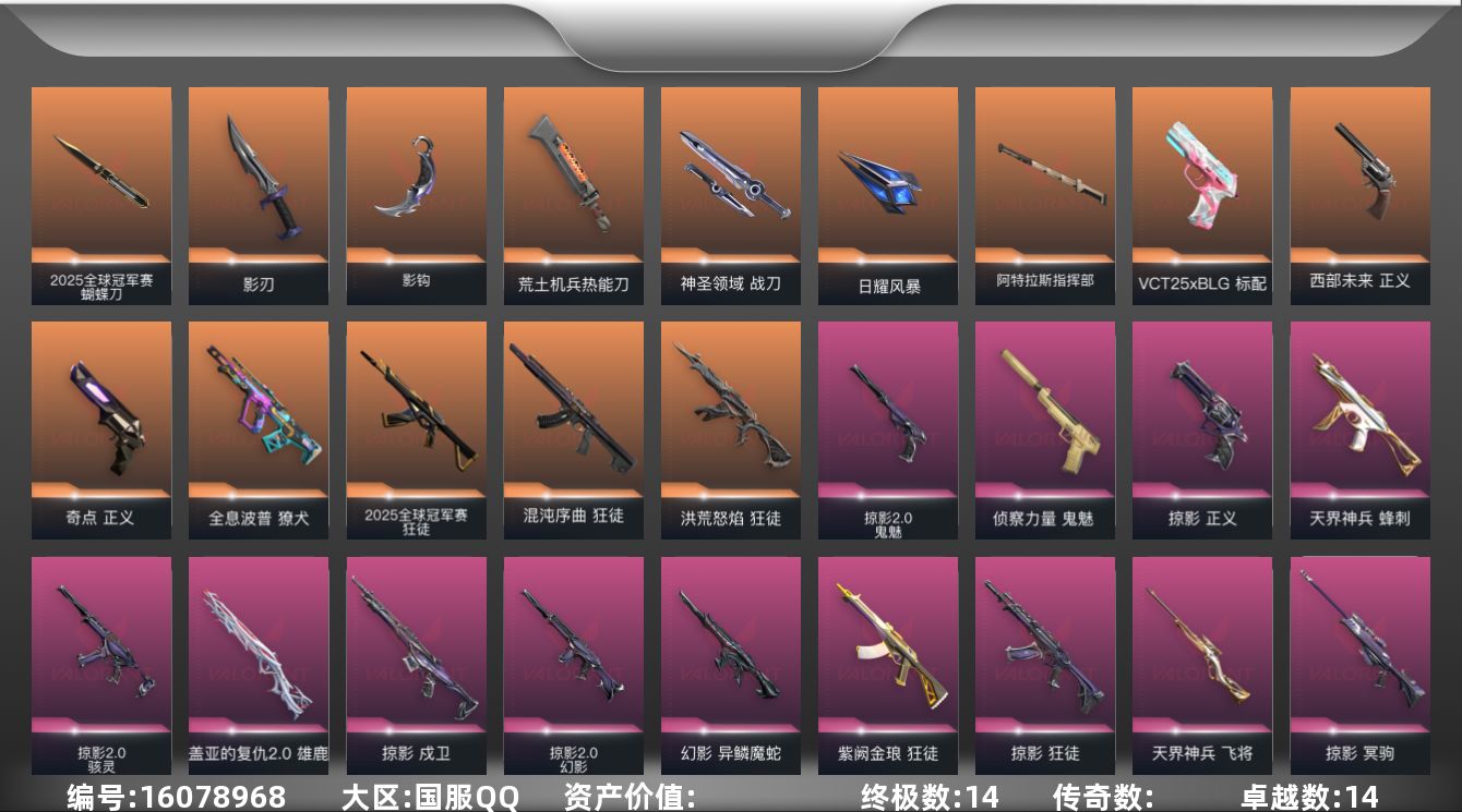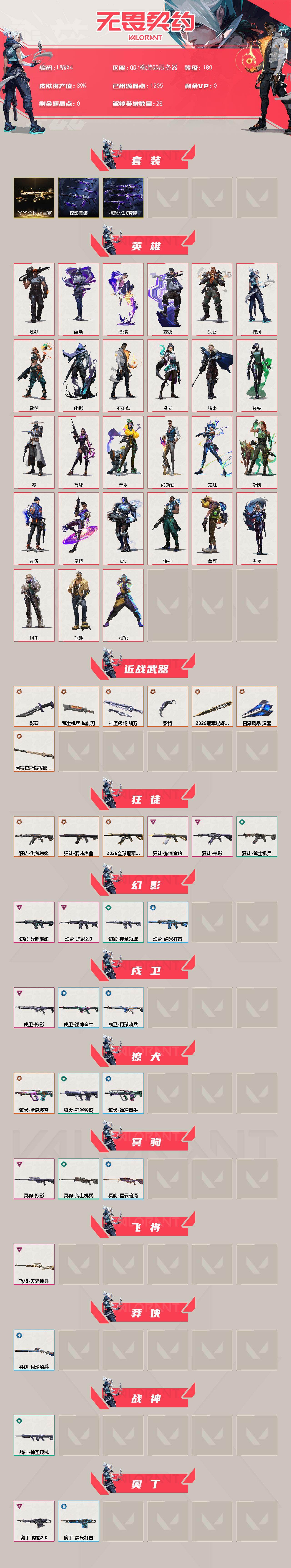 [16078968]【特价出售/店主推荐】【套装】:2025全球冠军赛套装,掠影套装,掠影//2.0套装 【英雄】:幻棱,炼狱,维斯,暮蝶,钛狐,壹决,铁臂,捷风,雷兹,幽影,不死鸟,贤者,猎枭,蝰蛇,零,芮娜,奇乐,尚勃勒,霓虹,斯凯,夜露,星礈,K/O,海神,盖可,黑梦,钢锁 【近战武器】:近战武器-2025全球冠军赛 蝴蝶刀,近战武器-影钩,近战武器-荒土机兵 热能刀,近战武器-影刃,近战武器-神圣领域 战刀,近战武器-日耀风暴 遗器,近战武器-阿特拉斯指挥部 甩棍 【狂徒】:狂徒-2025全球冠军赛,狂徒-洪荒怒焰,狂徒-混沌序曲,狂徒-掠影,狂徒-紫阙金琅,狂徒-荒土机兵 【幻影】:幻影-异鳞魔蛇,幻影-掠影//2.0,幻影-神圣领域,幻影-纳米打击 【戍卫】:戍卫-掠影,戍卫-逆冲蛮牛,戍卫-月球哨兵 【獠犬】:獠犬-全息波普,獠犬-神圣领域,獠犬-逆冲蛮牛 【冥驹】:冥驹-掠影,冥驹-荒土机兵,冥驹-星云暗涌 【飞将】:飞将-天界神兵 【莽侠】:莽侠-月球哨兵 【战神】:战神-神圣领域 【奥丁】:奥丁-掠影//2.0,奥丁-纳米打击 【判官】:判官-纳米打击x 【雄鹿】:雄鹿-盖亚的复仇//2.0,雄鹿-逆冲蛮牛,雄鹿-月球哨兵 【骇灵】:骇灵-掠影//2.0,骇灵-荒土机兵,骇灵-星云暗涌 【蜂刺】:蜂刺-天界神兵,蜂刺-星云暗涌 【标配】:标配-荒土机兵 【VCT手枪】:标配-VCT25 x BLG 【正义】:正义-奇点,正义-西部未来,正义-掠影,正义-纳米打击,正义-月球哨兵 【鬼魅】:鬼魅-侦察力量,鬼魅-掠影//2.0,鬼魅-诡秘蛇影,鬼魅-光导纤维,鬼魅-星云暗涌 【狂怒】:狂怒-神圣领域,狂怒-逆冲蛮牛 【卡面】:终章:激斗汉堡 卡面,进入射程 卡面,分崩离析 卡面,纳米打击 卡面,抑制技术 卡面,激斗汉堡 卡面,瓦娃脸雪糕 P2 卡面,从黄昏到黎明 卡面,荒土机兵 卡面,银弹猎手 卡面,逆冲蛮牛 卡面,《双城之战》拥抱 卡面,精灵大战 卡面,欢迎来到底城 卡面,南瓜盛典 卡面,修车达人 卡面,正义的化身 卡面,Clutch 卡面,零点嗅探设计图 卡面,沙雕爆能器 卡面,无畏契约GO!第一卷:芮娜 卡面,清除名单 卡面,无畏契约GO!第一卷:零 卡面,终章:同步耍酷 卡面,龍记 卡面,化茧成蝶 卡面,无垠星环 卡面,完美调谐 卡面 ,暗枪 卡面,代号红色