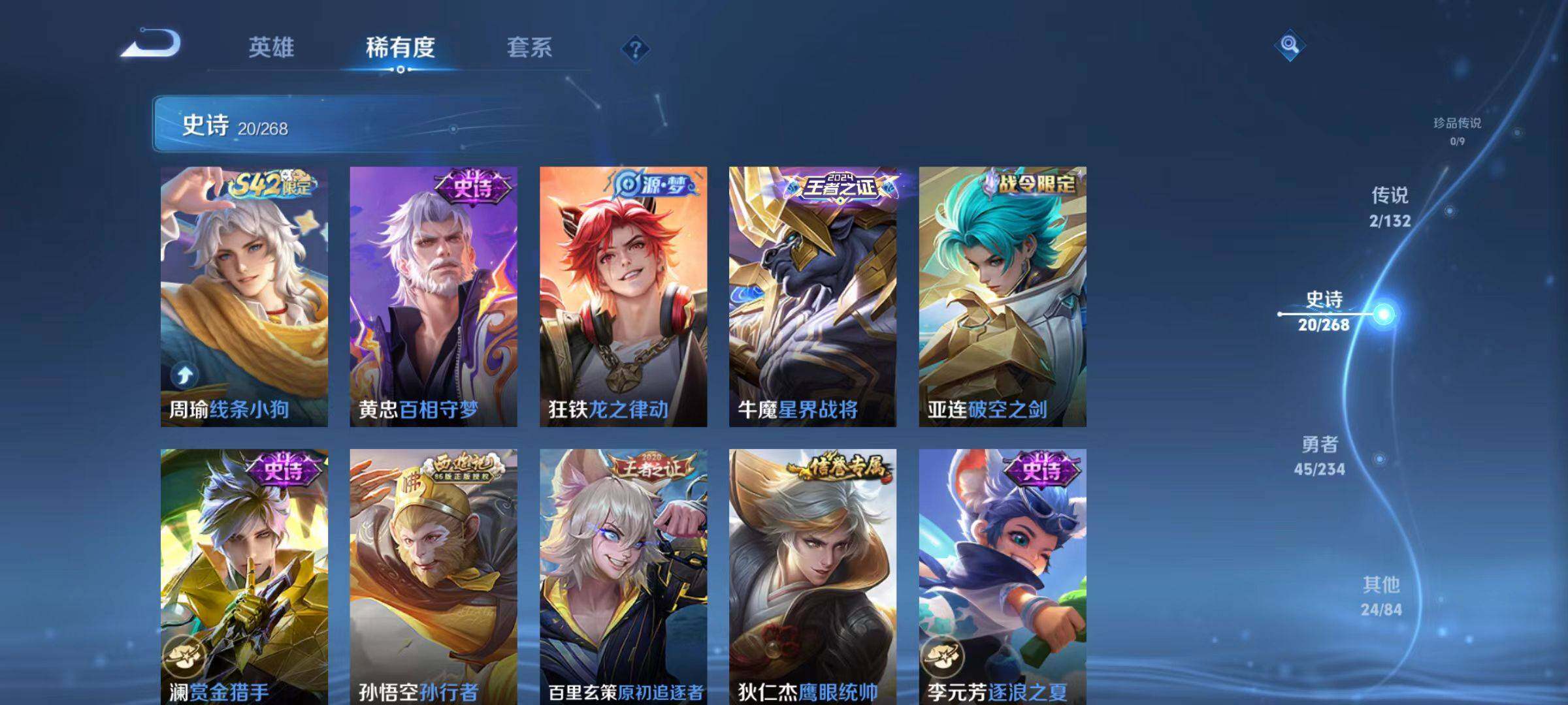 【史诗皮肤】:露娜紫霞仙子,赵云皇家上将,廉颇地狱岩魂,宫本武藏鬼剑武藏,孙尚香水果甜心,嬴政摇滚巨星,墨子金属风暴,李白千年之狐,刘邦德古拉伯爵,安琪拉心灵骇客,李元芳逐浪之夏,狄仁杰鹰眼统帅,百里玄策原初追逐者,孙悟空孙行者,澜赏金猎手,亚连破空之剑,牛魔星界战将,狂铁龙之律动,黄忠百相守梦,周瑜线条小狗