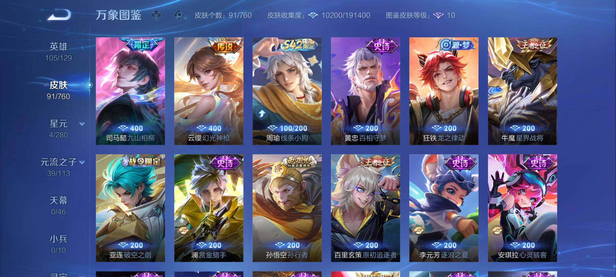 【赛季限定】:沈梦溪大漠名商,李元芳云中旅人,桑启海盐诗旅,裴擒虎擒涛扼浪,鲁班大师探海日志,鬼谷子天穹祈灯,刘邦剑破天穹,姜子牙天穹之誓,东皇太一噬灭天穹,太乙真人谧流熔炉,钟馗虚灵犬护,甄姬逆浪荇歌,亚瑟荣光之誓,百里玄策原初追逐者,牛魔星界战将