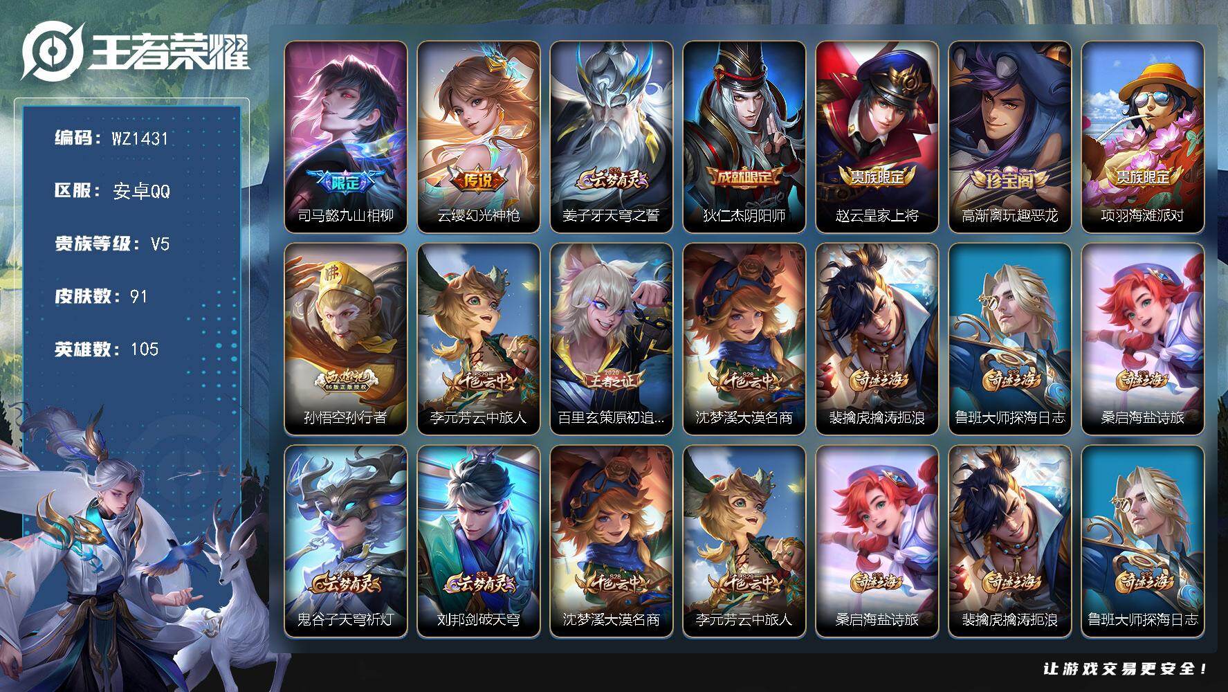 [16080502]安卓Q--91皮肤-2传说-19史诗 【传说皮肤】:司马懿九山相柳,云缨幻光神枪 【限定皮肤】:姜子牙天穹之誓,狄仁杰阴阳师,赵云皇家上将,高渐离玩趣恶龙,项羽海滩派对,孙悟空孙行者,李元芳云中旅人,百里玄策原初追逐者,沈梦溪大漠名商,裴擒虎擒涛扼浪,鲁班大师探海日志,桑启海盐诗旅,鬼谷子天穹祈灯,刘邦剑破天穹 【赛季限定】:沈梦溪大漠名商,李元芳云中旅人,桑启海盐诗旅,裴擒虎擒涛扼浪,鲁班大师探海日志,鬼谷子天穹祈灯,刘邦剑破天穹,姜子牙天穹之誓,东皇太一噬灭天穹,太乙真人谧流熔炉,钟馗虚灵犬护,甄姬逆浪荇歌,亚瑟荣光之誓,百里玄策原初追逐者,牛魔星界战将 【战令限定】:亚连破空之剑,孙悟空神迹守卫,周瑜线条小狗 【史诗皮肤】:露娜紫霞仙子,赵云皇家上将,廉颇地狱岩魂,宫本武藏鬼剑武藏,孙尚香水果甜心,嬴政摇滚巨星,墨子金属风暴,李白千年之狐,刘邦德古拉伯爵,安琪拉心灵骇客,李元芳逐浪之夏,狄仁杰鹰眼统帅,百里玄策原初追逐者,孙悟空孙行者,澜赏金猎手,亚连破空之剑,牛魔星界战将,狂铁龙之律动,黄忠百相守梦,周瑜线条小狗 【其他皮肤】:项羽海滩派对,韩信教廷特使,达摩大发明家,赵云忍炎影,白起白色死神,孙膑天使之翼,典韦黄金武士,花木兰兔女郎,刘备万事如意,宫本武藏万象初新,狄仁杰阴阳师,关羽龙腾万里,诸葛亮掌控之力,吕布野性能量,高渐离玩趣恶龙,狂铁特工战影,鲁班大师乓乓大师,沈梦溪大漠名商,蒙恬蔚蓝守将,李元芳云中旅人,桑启海盐诗旅,裴擒虎擒涛扼浪,鲁班大师探海日志,李元芳妄想特派,后羿完美运算,鬼谷子天穹祈灯,廉颇功夫炙烤,刘邦剑破天穹,姜子牙天穹之誓,孙悟空神迹守卫,盘古敬我三分,东皇太一噬灭天穹,干将莫邪雾都夜雨,吕布逐霄战戟,苍苍林狼骑,太乙真人谧流熔炉,典韦铁骨偃魂,戈娅玫蓝誓约,钟馗虚灵犬护,张良灵野札记,阿古朵布丁狗之约,甄姬逆浪荇歌,莱西奥踏浪烽翎,亚瑟荣光之誓,虞姬溯影追猎,露娜绯红之刃,钟无艳生化警戒,狄仁杰锦衣卫,曹操超能战警,孙悟空西部大镖客,刘禅英喵野望,李白范海辛,关羽天启骑士,马可波罗激情绿茵,干将莫邪第七人偶,铠龙域领主,百里守约绝影神枪,百里玄策威尼斯狂欢,公孙离花间舞,杨玉环霓裳曲,弈星踏雪寻梅,元歌午夜歌剧院,司马懿魇语军师,李信灼热之刃,盘古创世神祝,云中君荷鲁斯之眼,司空震启蛰,云缨赤焰之缨,暃碧珀绯影 【内测皮肤】:
