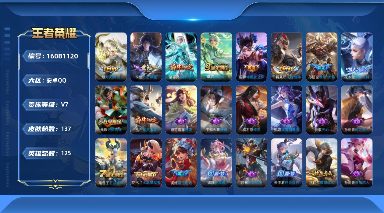 - [11680952]V9 4典藏 4珍品传说 13传说 125英雄 390皮肤 可修改实名 优质装备:无限飓风号(高达),银白咏叹调(倪克斯侍卫),神鉴启示录,最初的交响(伽罗典藏),江户川柯南,怪盗基德,黑崎一护,绛天战甲(鸡嘴战神),零号·赤焰,胖达荣荣,花朝如约(花篮子),神器·狴犴令,山海·炽霜斩(李信年限),妄想实况,牧神诗旅 珍品传说:兔狲·蓬尾 传说皮:典韦战鼓燎原,幻光神枪 珍宝阁皮:妄想食味,女武神,玩趣恶龙 限定皮:逐霄战戟,鸣野蒿,傲雪梅枪,时之彼端,怒海麟威,降魔,五谷丰年,冰锋战神,御风骁将(吕布年限),龙胆,烈魂,岱宗(典韦年限),天狼溯光者,天狼征服者,奔雷神使(牛魔年限),李小龙,辉光之辰,如梦令-后羿,霸王别姬-项羽,霸王别姬-虞姬,引擎之心,冰霜恋舞曲,寅虎·御盾(廉颇年限),百木心枪,梦圆繁星,山海·玄木吟(马可年限) 史诗皮:鸭鸭历险记-刘禅,苍鳞隐世,器灵·浮梦炉,化蝶舞,星界特工,灵蛊蚀心,龙之律动,藏狐·褐绒,小牛鸭,石田雨龙,茶境仙,撼地雄心,破空之剑,芈月浮光幕影,谪仙醉月,蔬乡物语(鲁班七号),琥珀纪元伽罗,百相守梦-百里守约,百相守梦-黄忠,遇见神鹿,紫霞仙子,苍穹之光,电玩小子(小书包),白龙吟,黄金分割率,特工魅影,千年之狐,永昼,电玩·爆裂旋风,江河有灵,雪夜绮愿(周瑜),百解令(蒙犽),高渐离燃音魔法,蒙恬荣光圣徽,偶像歌手,无限星赏官,晚萤,冰冠公主,青蛇,末日机甲-吕布,猫狗日记-孙策,猫狗日记-大乔,时之恋人-孙尚香,乱世虎臣,节奏热浪,修罗,女仆咖啡,摇滚巨星,水果甜心,绅士熊喵,天才门将,星夜王子,心灵骇客,时之奇旅-安琪拉,功夫厨神,德古拉伯爵,暗隐猎兽者,幽灵船长,鬼剑武藏,心灵战警,天秀·启明,舞动绿茵,地狱岩魂,诗语江南,纤云弄巧,拒霜思,缤纷独角兽,乘风破浪,逐浪之夏,月团寄思,水晶猎龙者,曙光守护者,箭羽风息,金属风暴,圣诞狂欢,圣诞恋歌,鹰眼统帅,暗夜贵公子,魅力维加斯,寅虎·御盾,无心,未来纪元-赵云