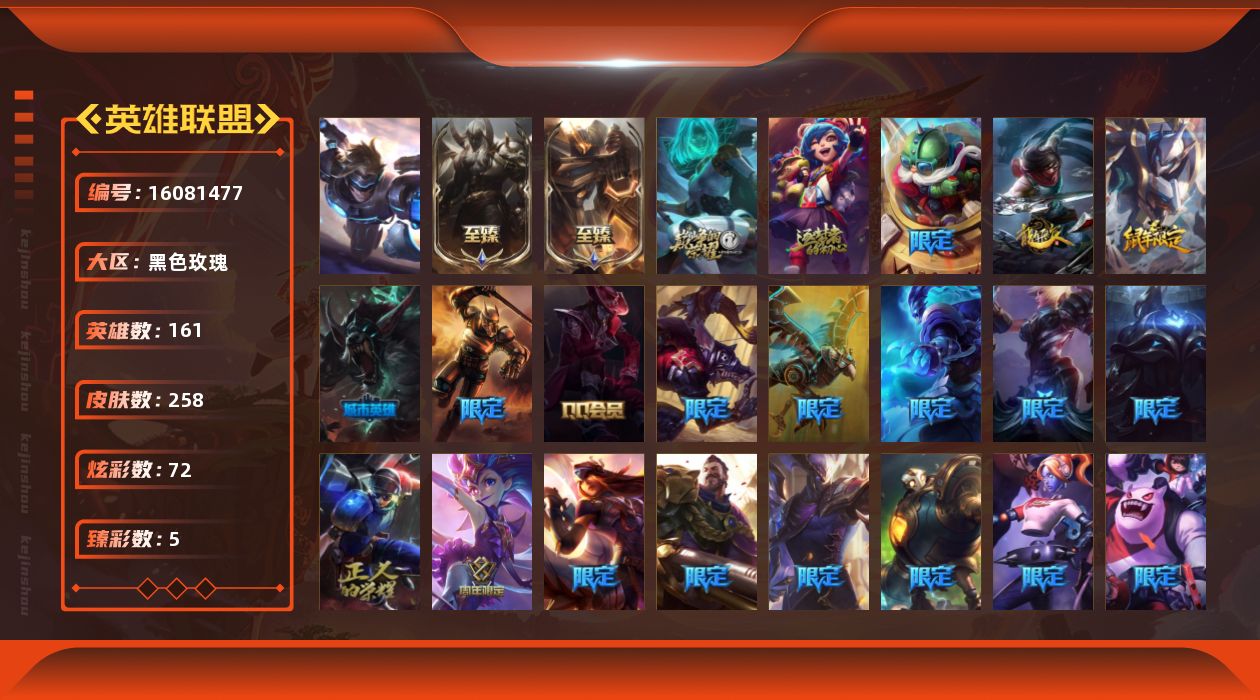 [16081477]【特价出售/店主推荐】未定级段位-161英雄-258皮肤-72炫彩-1终极-4神话-37限定-35传说-67史诗