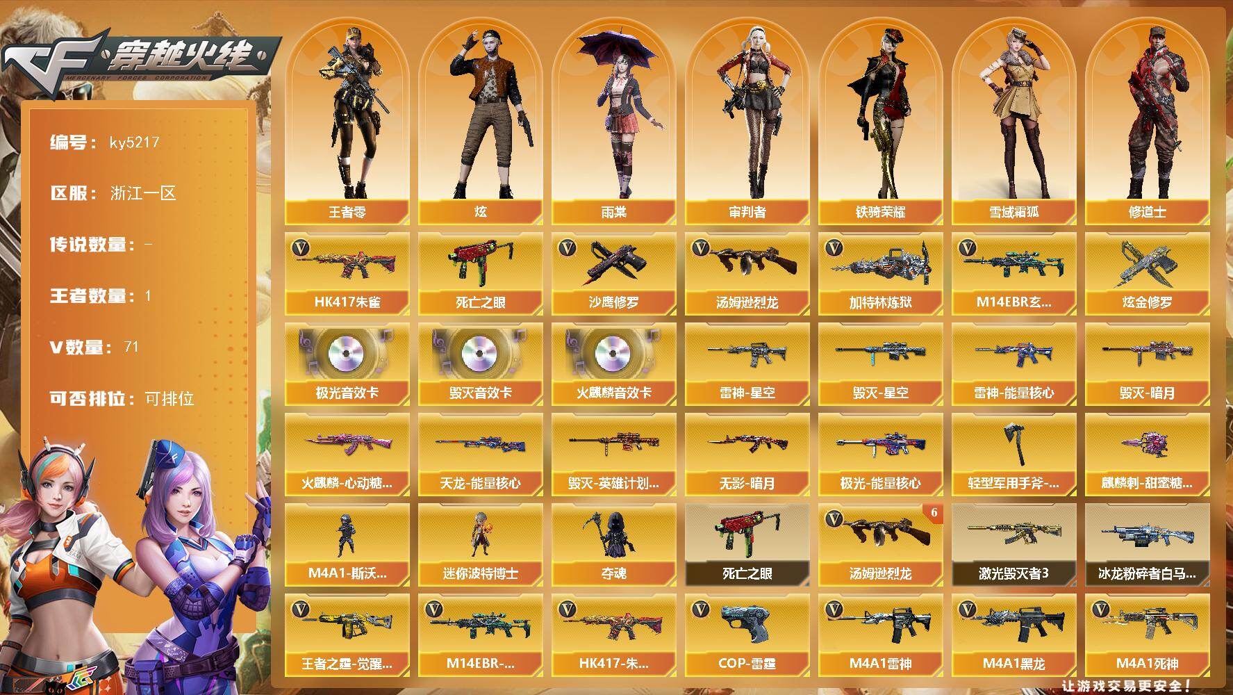 [16082438]浙江一区-71V-1王者-1炫金 【热门武器】:M14EBR-玄武,HK417-朱雀,死亡之眼,汤姆逊-烈龙*6,加特林-炼狱*2,沙鹰-修罗*6 【王者炫金武器】:炫金修罗 【音效卡】:AK47-火麒麟音效卡,Barrett-毁灭音效卡,Barrett-极光音效卡 【皮肤】:雷神-能量核心*2,雷神-星空,火麒麟-心动糖果,毁灭-暗月*2,毁灭-星空,毁灭-英雄计划 皮肤,无影-暗月,天龙-能量核心,极光-能量核心,轻型军用手斧-再燃火线,麒麟刺-甜蜜糖果 皮肤 【角色】:炫,雨棠,审判者,王者-零,雪域霜狐,修道士,空,暗夜-X,风暴女,嘉年华灵狐,兰-海滩派对,兰-新年限定,灵狐者-X,麻雀,女战神,潘多拉-X,潘多拉-甜心教官,斯沃特-X,铁骑荣耀,兔囡囡,影武者-X 【人偶武器】:迷你波特博士,夺魂,M4A1-斯沃特 【暴走生化】:死亡之眼 【挑战大师】:冰龙粉碎者-白马银枪,激光毁灭者III 【英雄级武器】:AK47-火麒麟*3,M4A1-黑龙,M4A1-雷神,M4A1-死神,M4A1-雷霆,HK417-朱雀,M14EBR-玄武,无影-神兵利器,AK47-B-战神,AWM-天龙,Barrett-毁灭,Barrett-极光*2,Barrett-朱雀,加特林-炼狱*2,汤姆逊-烈龙*6,王者之霆-觉醒版,沙鹰-修罗*6,COP-雷霆,屠龙*4,龙啸*2,擎天*3,麒麟刺,麒麟刺-百战金芒,高爆手雷-雷霆*7,闪光弹-雷霆*7,烟雾弹-雷霆*7,M4A1-赤狱骑士 【道具】:CFS限定背包,云山科技背包,亚洲杯纪念炫彩背包,全能枪王背包,战舰背包,机械魔影背包-红色,炫彩背包,雪域霜狐炫彩背包,女皇终结者-魔龙之吻,救世主-黑桃战神,绿色巨人,灵魂忍者*2,变异宝贝,迷雾幽灵*2,夺命之镰,防化服*3,金色流光-枪王排位,星辰流光-枪王排位,流光-鎏金之域,流光-再燃火线,枪王排位29赛季金色流光,语音特效-生化,雪域霜狐表情,电玩兔兔表情,斯沃特表情,循环实验表情,EP战队名片,EP战队喷图,防弹头盔*4,防弹衣*4,C4工具钳*4,手雷包*4 【特殊枪械】:6烈龙,2炼狱