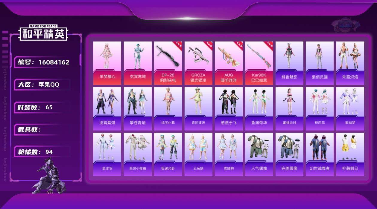 [16084162]【1702】苹果 手Q-2粉装-4特效枪-0载具-0粉色飞行器-22406热力值-5王牌印记-65套装-94枪皮