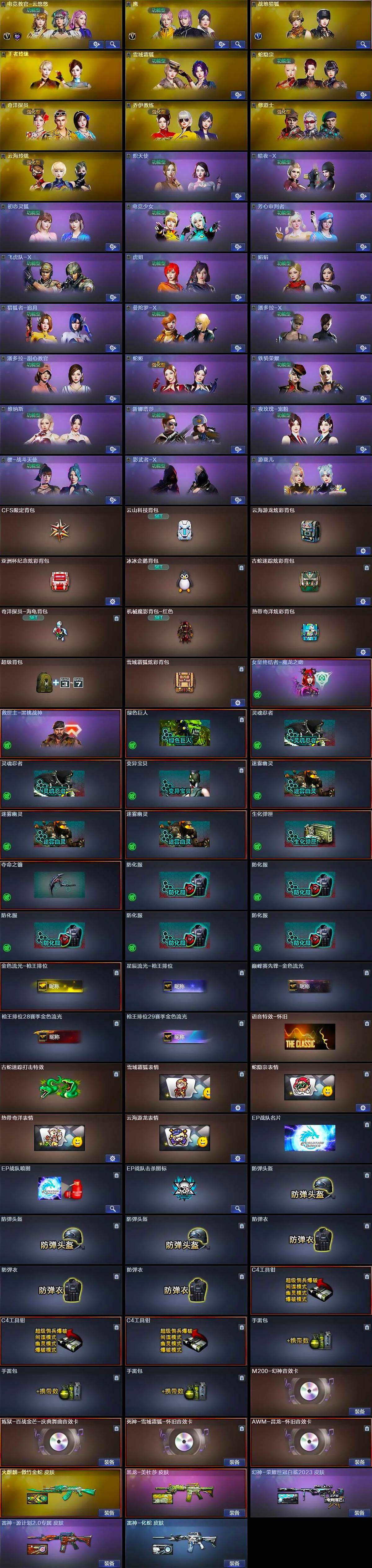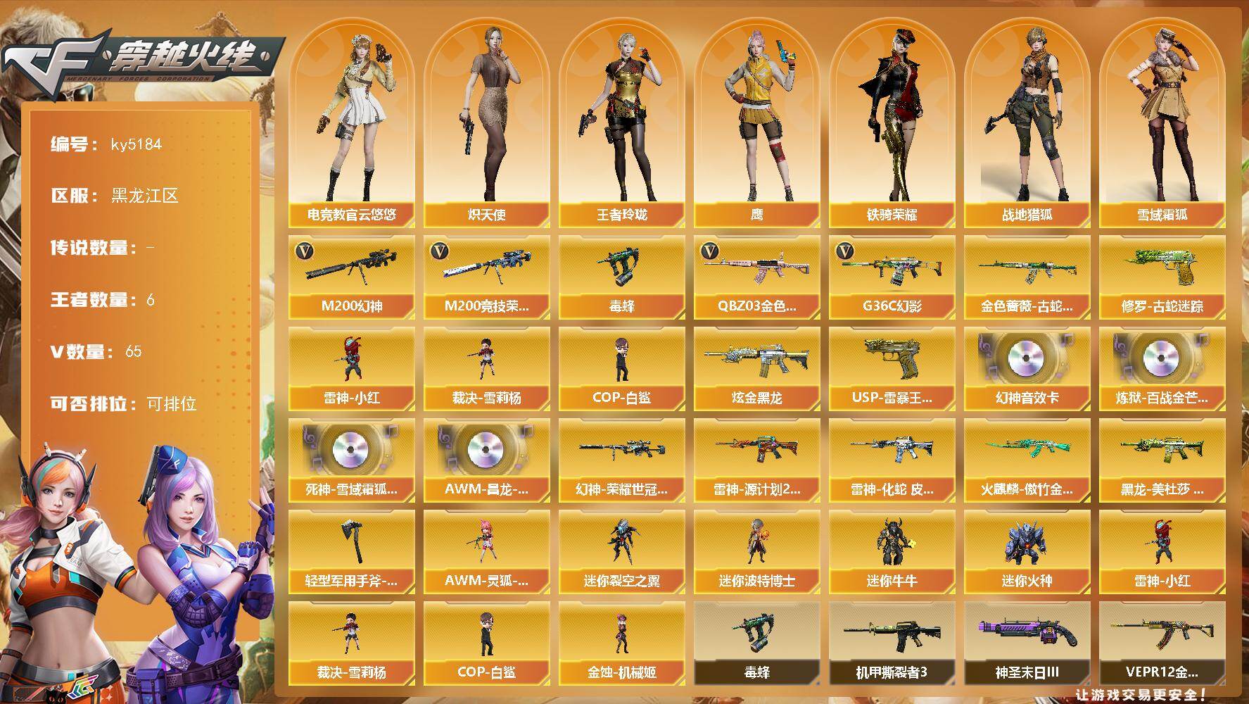 [16085335]黑龙江区-65V-6王者-1炫金 【热门武器】:G36C-幻影,QBZ03-金色蔷薇,M200-幻神,金色蔷薇-古蛇迷踪,修罗-古蛇迷踪,M200-竞技荣光,毒蜂,雷神-小红,裁决-雪莉杨,COP-白鲨 【王者炫金武器】:USP-雷暴王者,炫金黑龙 【音效卡】:M200-幻神音效卡,炼狱-百战金芒-庆典舞曲音效卡,死神-雪域霜狐-怀旧音效卡,AWM-昌龙-怀旧音效卡 【皮肤】:幻神-荣耀世冠白鲨2023 皮肤,雷神-源计划2.0专属 皮肤,雷神-化蛇 皮肤,火麒麟-傲竹金蛇 皮肤,黑龙-美杜莎 皮肤,轻型军用手斧-再燃火线 【角色】:电竞教官-云悠悠,鹰,战地猎狐,王者玲珑,雪域霜狐,蛇隐宗,奇洋探员,乔伊教练,修道士,云海玲珑,炽天使,暗夜-X,初恋灵狐,电竞少女,芳心审判者,飞虎队-X,虎妞,娟娟,猎狐者-追月,0号玩家,曼陀罗-X,潘多拉-X,潘多拉-甜心教官,蛇姬,铁骑荣耀,兔囡囡,维纳斯,新娜塔莎,夜玫瑰-宠粉,樱-战斗天使,影武者-X,游珑儿 【人偶武器】:雷神-小红,COP-白鲨,裁决-雪莉杨,金蚀-机械姬,AWM-灵狐-15周年嘉年华,迷你裂空之翼,迷你波特博士,迷你牛牛,迷你火种 【暴走生化】:毒蜂 【挑战大师】:激光毁灭者III-白马银枪,VEPR-12-金魔,激光毁灭者III*4,机甲撕裂者III,试炼破坏者III,神圣爆裂者-末日III,阐释者III 【英雄级武器】:M4A1-雷神*2,G36C-幻影,黑武士-锦绣游龙,超新星-热带奇洋,金色蔷薇-古蛇迷踪,死神-雪域霜狐,九霄圣角,QBZ03-金色蔷薇,加利尔ACE-天袭,M200-幻神,M200-竞技荣光,烈龙-云海游龙,沙鹰-天神,柯尔特-竞技荣光*2,修罗-云海游龙,修罗-古蛇迷踪,擎天-竞技荣光*2,擎天-云海游龙,龙啸-热带奇洋,斩神刀-雷暴,麒麟刺-百战金芒,高爆手雷-雷暴,高爆手雷-幻灵,高爆手雷-竞技荣光*8,手雷-云海游龙,手雷-热带奇洋,高爆手雷-古蛇迷踪,闪光弹-雷暴,闪光弹-竞技荣光*9,闪光弹-雷霆王者-觉醒版,烟雾弹-雷暴*2,烟雾弹-竞技荣光*9,烟雾弹-古蛇迷踪,M4A1-赤狱骑士,AWM-昌龙 【道具】:CFS限定背包,云山科技背包,云海游龙炫彩背包,亚洲杯纪念炫彩背包,冰冰企鹅背包,古蛇迷踪炫彩背包,奇洋探员-海龟背包,机械魔影背包-红色,热带奇洋炫彩背