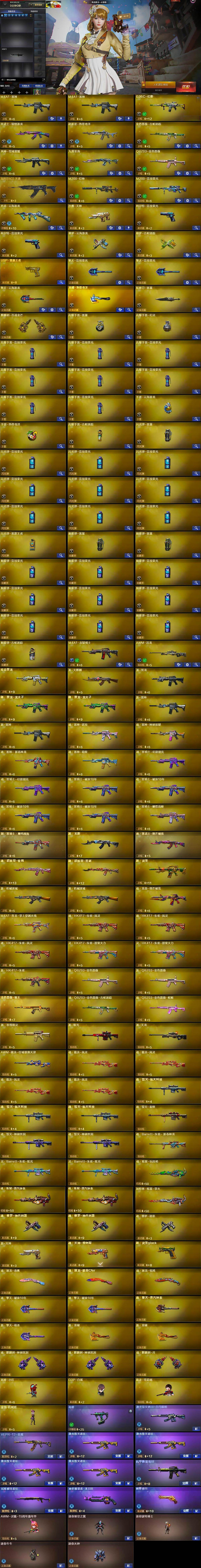 【英雄级武器】:M4A1-雷神*2,G36C-幻影,黑武士-锦绣游龙,超新星-热带奇洋,金色蔷薇-古蛇迷踪,死神-雪域霜狐,九霄圣角,QBZ03-金色蔷薇,加利尔ACE-天袭,M200-幻神,M200-竞技荣光,烈龙-云海游龙,沙鹰-天神,柯尔特-竞技荣光*2,修罗-云海游龙,修罗-古蛇迷踪,擎天-竞技荣光*2,擎天-云海游龙,龙啸-热带奇洋,斩神刀-雷暴,麒麟刺-百战金芒,高爆手雷-雷暴,高爆手雷-幻灵,高爆手雷-竞技荣光*8,手雷-云海游龙,手雷-热带奇洋,高爆手雷-古蛇迷踪,闪光弹-雷暴,闪光弹-竞技荣光*9,闪光弹-雷霆王者-觉醒版,烟雾弹-雷暴*2,烟雾弹-竞技荣光*9,烟雾弹-古蛇迷踪,M4A1-赤狱骑士,AWM-昌龙