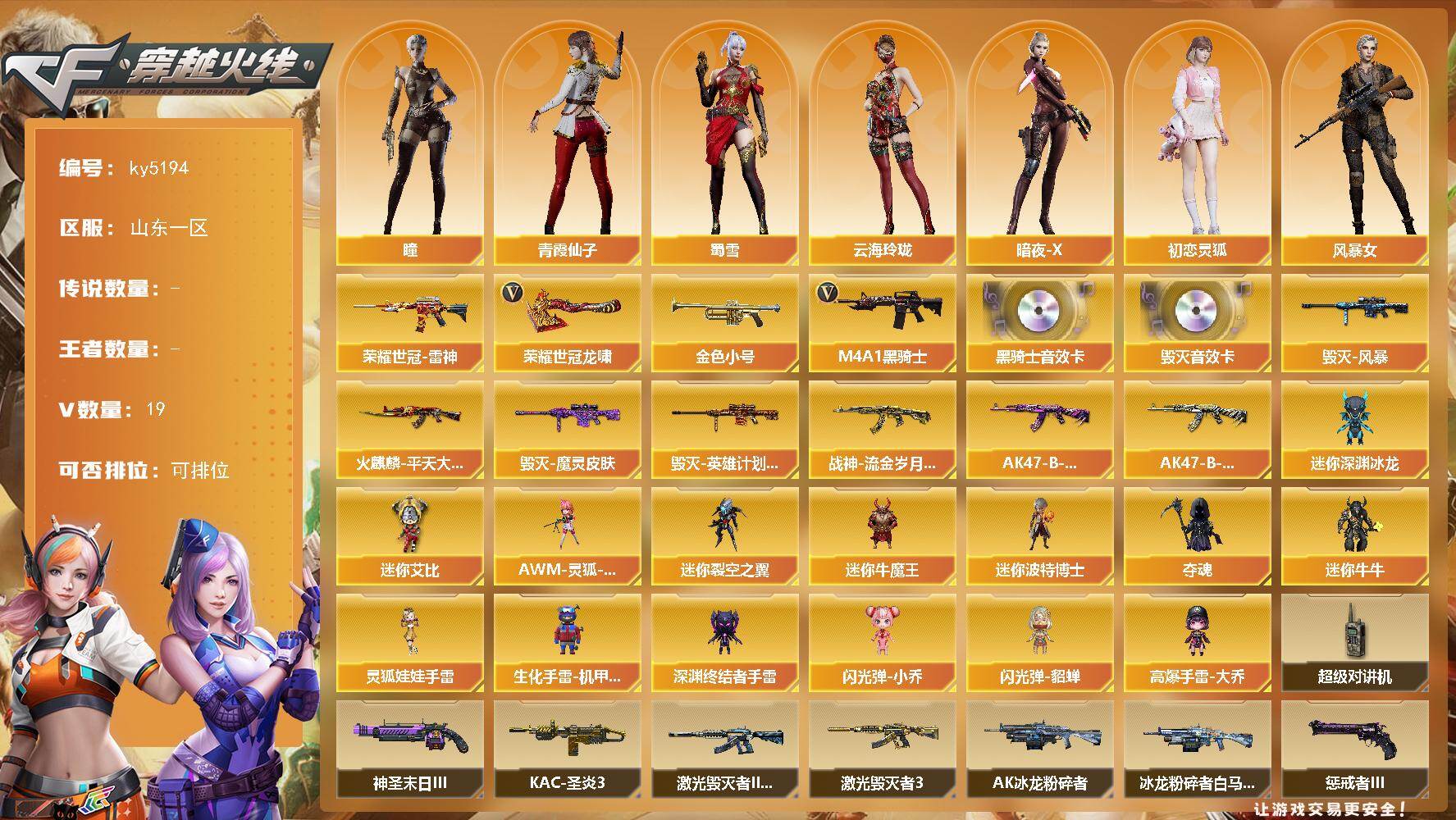 [16086050]山东一区-19V-0王者-0炫金 【热门武器】:荣耀世冠-雷神,金色小号,M4A1-黑骑士,荣耀世冠-龙啸 【音效卡】:M4A1-黑骑士音效卡,Barrett-毁灭音效卡 【皮肤】:火麒麟-平天大圣,毁灭-风暴,毁灭-魔灵皮肤,毁灭-英雄计划 皮肤,战神-流金岁月皮肤,AK47-B-常胜将军-曹操,AK47-B-常胜将军-刘备*2 【角色】:瞳,云海玲珑,暗夜-X,初恋灵狐,风暴女,虎妞,嘉年华灵狐,娟娟,灵狐者-黄金海岸,龙儿,龙儿-小淘气,麻雀,潜龙队-X,青霞仙子,斯沃特-X,蜀雪,雪莉杨-摸金校尉,夜玫瑰-幻能朋克,影武者-X 【人偶武器】:AWM-灵狐-15周年嘉年华,迷你深渊冰龙*2,迷你裂空之翼,迷你牛魔王,迷你波特博士,夺魂*2,迷你牛牛,生化手雷-机甲核心,深渊终结者手雷*4,闪光弹-小乔,闪光弹-貂蝉,高爆手雷-大乔,迷你艾比,灵狐娃娃手雷*2 【暴走生化】:超级对讲机 【挑战大师】:AK47-冰龙粉碎者*2,冰龙粉碎者-白马银枪*2,激光毁灭者III-白马银枪,激光毁灭者III,KAC-圣炎切割者III,神圣爆裂者-末日III*2,惩戒者III 【英雄级武器】:AK47-火麒麟,M4A1-黑骑士,M4A1-武圣,M4A1-幻灵,无影-神兵利器,黑骑士-海王,AK47-B-常胜将军,荣耀世冠-雷神,Barrett-毁灭,Glock18-武圣,龙啸,麒麟刺,荣耀世冠-龙啸 【道具】:超级背包,绿色巨人,灵魂忍者,妖姬*2,迷雾幽灵,生化弹匣,夺命之镰,防化服*2,金色流光-枪王排位,C4-红龙,防弹头盔*6,防弹衣*6,C4工具钳*4,手雷包*4 【特殊枪械】:1黑骑士
