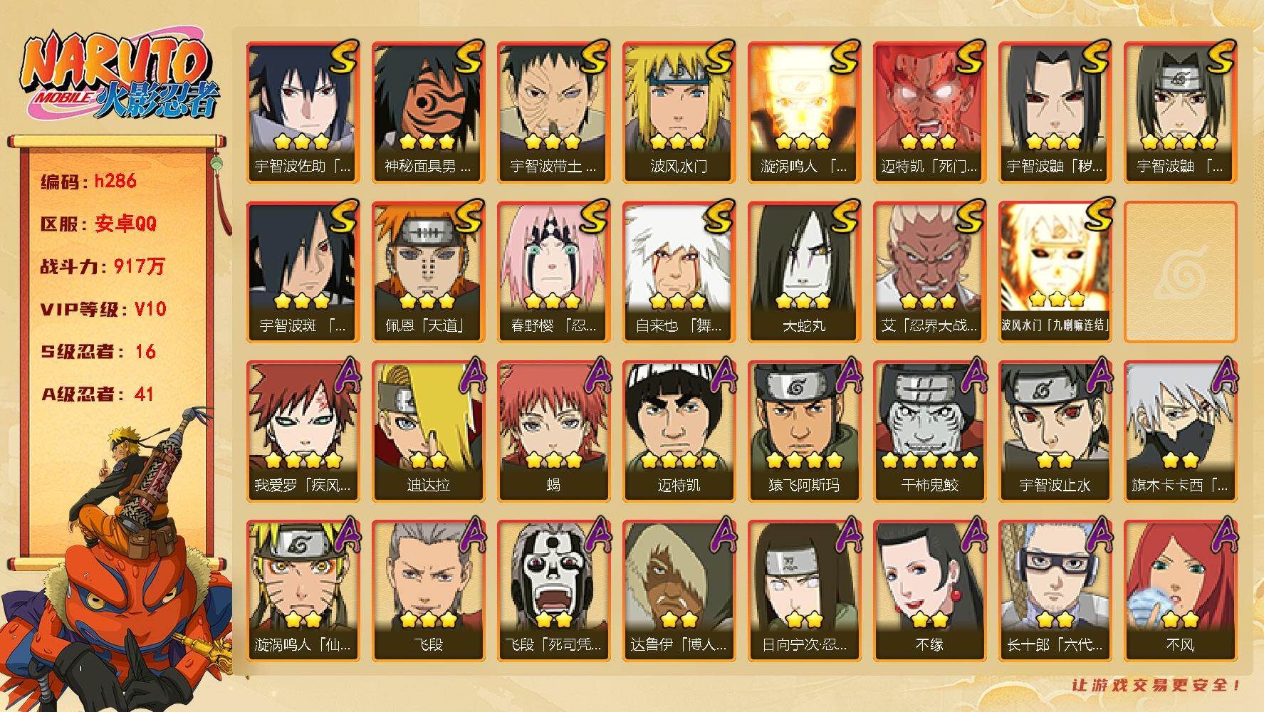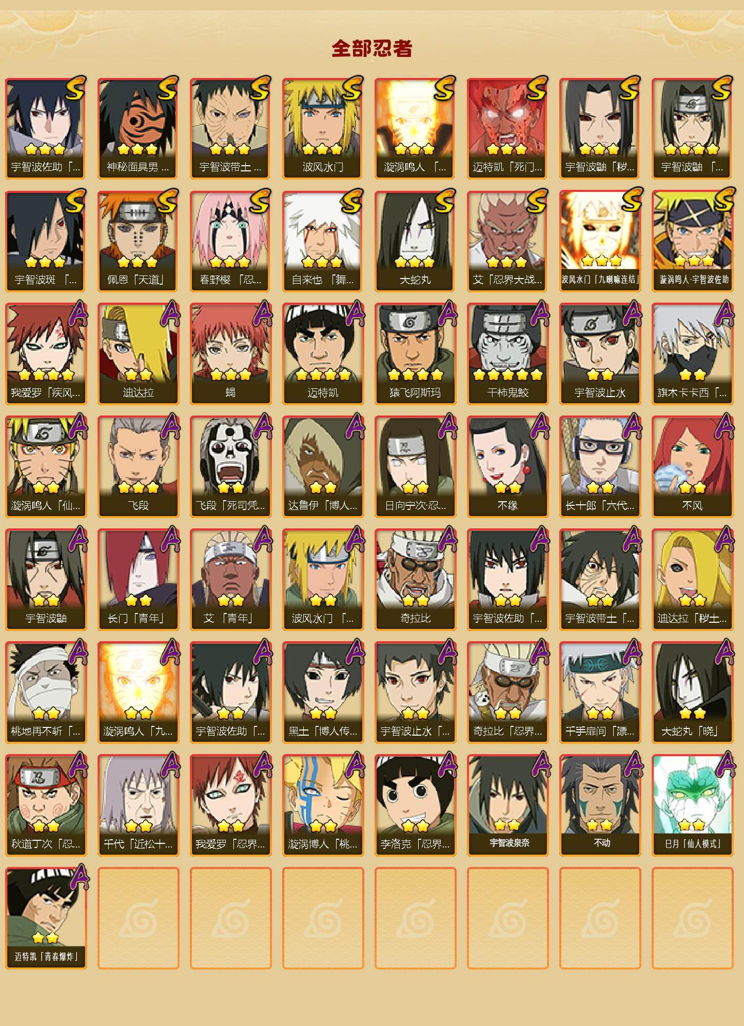 【A级忍者】:艾「青年」(2星),长门「青年」(2星),波风水门「青年」(2星),达鲁伊「博人传」(2星),迪达拉(2星),迪达拉「秽土转生」(2星),大蛇丸「晓」(2星),奇拉比(2星),奇拉比「忍界大战」(2星),飞段(3星),飞段「死司凭血」(2星),干柿鬼鲛(5星),漩涡博人「桃式显现」(2星),漩涡鸣人「仙人模式」(2星),漩涡鸣人「九尾查克拉」(2星),迈特凯(4星),旗木卡卡西「万花筒写轮眼」(2星),桃地再不斩「漂泊武士」(2星),我爱罗「疾风传」(4星),我爱罗「忍界大战」(2星),蝎(3星),猿飞阿斯玛(4星),宇智波止水(2星),宇智波止水「新春限定」(2星),宇智波鼬(2星),宇智波佐助「须佐能乎」(2星),宇智波佐助「万花筒写轮眼」(2星),日向宁次「忍界大战」(2星),宇智波带土「暴怒」(2星),长十郎「六代目水影」(2星),李洛克「忍界大战」(2星),黑土「博人传」(2星),千手扉间「漂泊武士」(2星),秋道丁次「忍界大战」(2星),千代「近松十人卫」(2星),不缘(2星),不风(2星),宇智波泉奈(2星),不动(2星),巳月「仙人模式」(2星),迈特凯「青春爆炸」(2星)