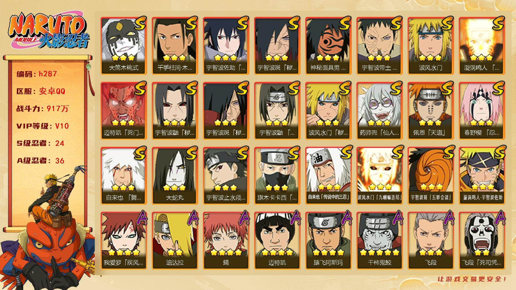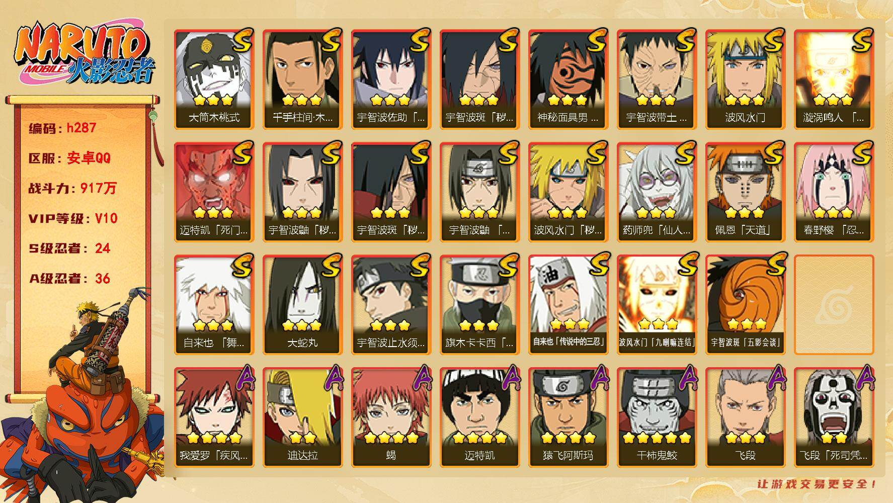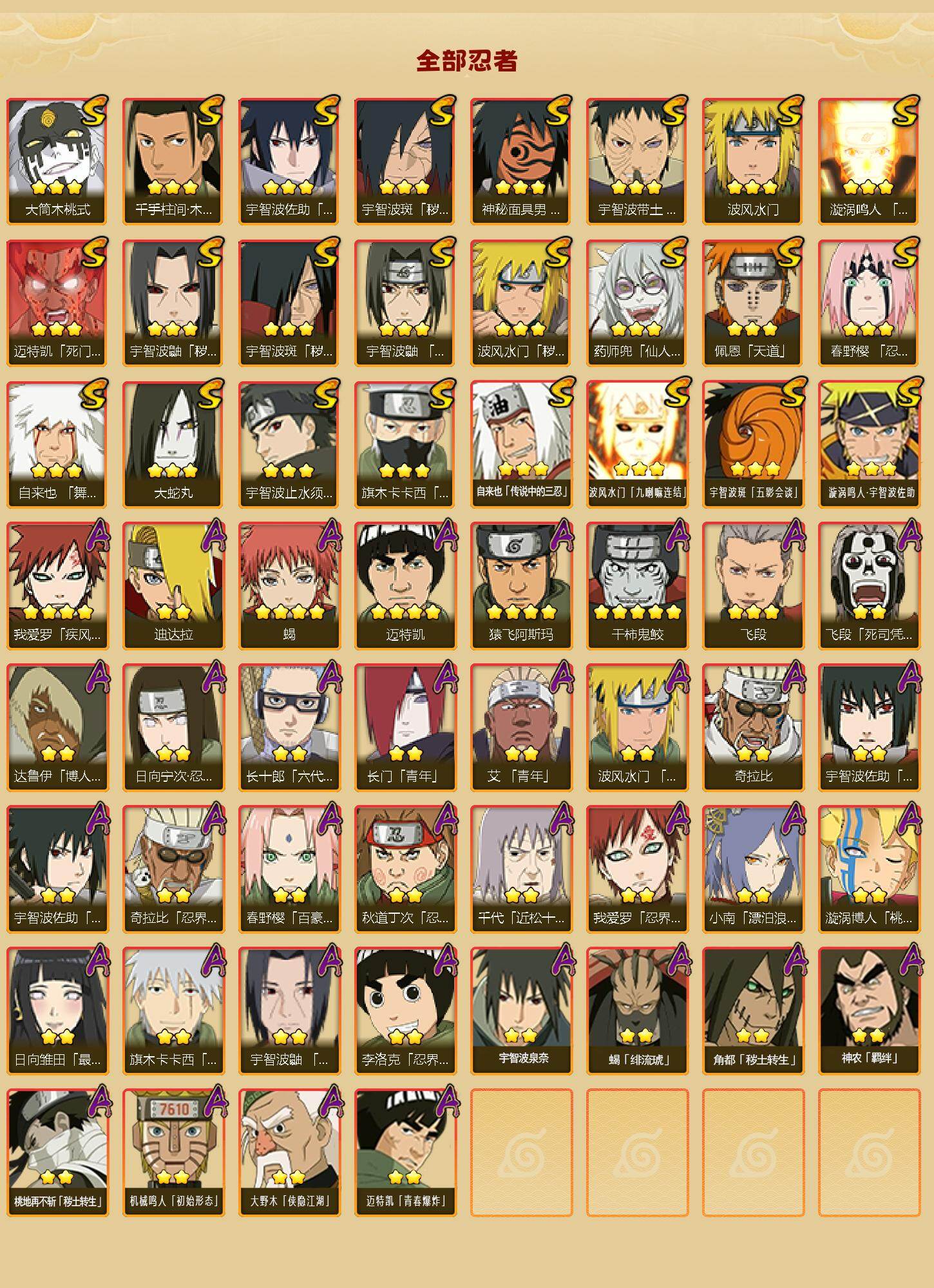 【A级忍者】:艾「青年」(2星),长门「青年」(2星),波风水门「青年」(2星),达鲁伊「博人传」(2星),迪达拉(2星),奇拉比(2星),奇拉比「忍界大战」(2星),飞段(3星),飞段「死司凭血」(2星),干柿鬼鲛(5星),漩涡博人「桃式显现」(2星),机械鸣人「初始形态」(2星),迈特凯(4星),旗木卡卡西「幻之真容」(2星),桃地再不斩「秽土转生」(2星),我爱罗「疾风传」(4星),我爱罗「忍界大战」(2星),蝎(4星),蝎「绯流琥」(2星),小南「漂泊浪客」(2星),角都「秽土转生」(2星),猿飞阿斯玛(4星),宇智波鼬「夏日限定」(2星),宇智波佐助「须佐能乎」(2星),宇智波佐助「万花筒写轮眼」(2星),日向宁次「忍界大战」(2星),日向雏田「最终章」(2星),长十郎「六代目水影」(2星),李洛克「忍界大战」(2星),春野樱「百豪」(2星),秋道丁次「忍界大战」(2星),千代「近松十人卫」(2星),神农「羁绊」(2星),宇智波泉奈(2星),大野木「侠隐江湖」(2星),迈特凯「青春爆炸」(2星)