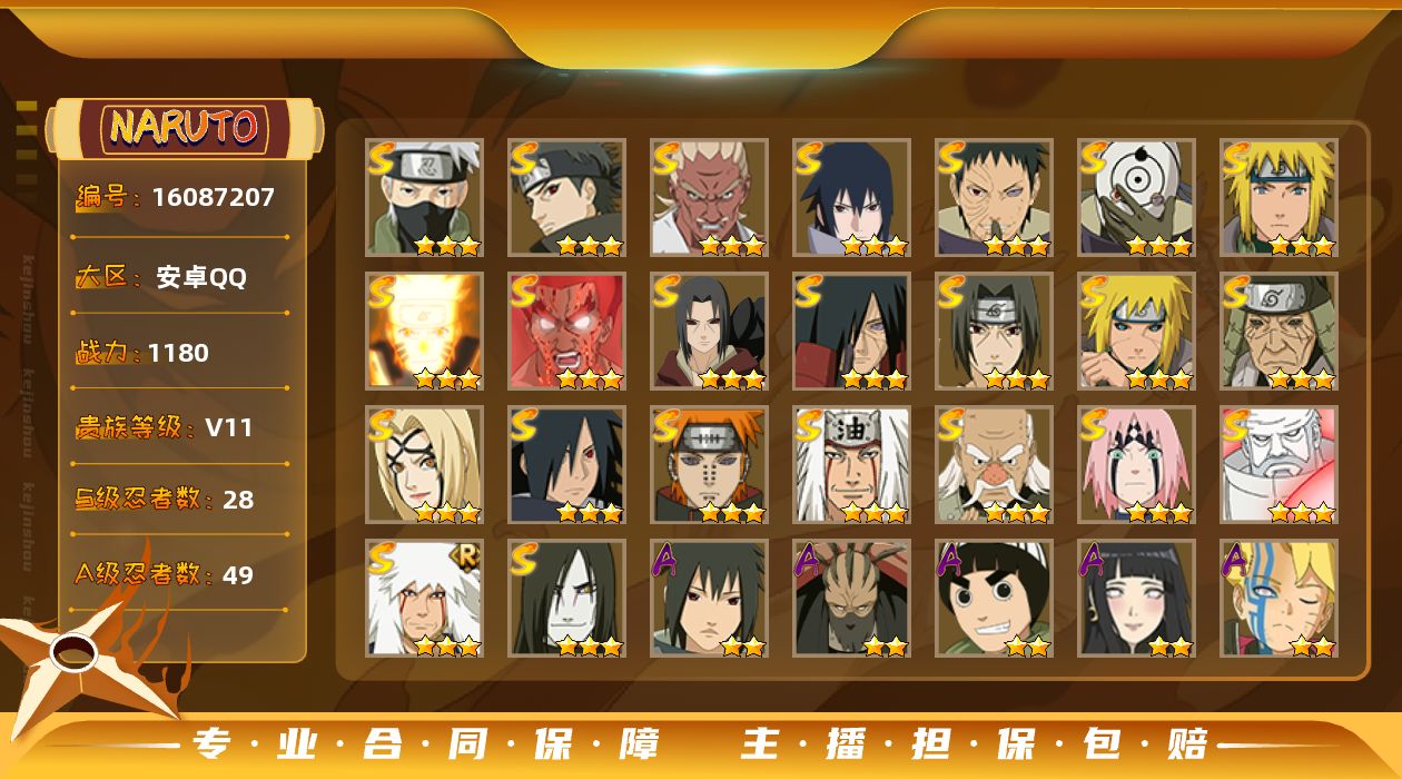 - [11701517]V9 11S忍 668.7W战力 可二次 S级忍者:宇智波斑「秽土转生·解」,宇智波佐助「永恒万花筒」,漩涡鸣人 「九喇嘛连结」,迈特凯「死门」,宇智波带土 「忍界大战」,千手柱间「秽土转生」,药师兜「仙人模式」,“宇智波斑” 「白面具」,佩恩「天道」,波风水门,大蛇丸