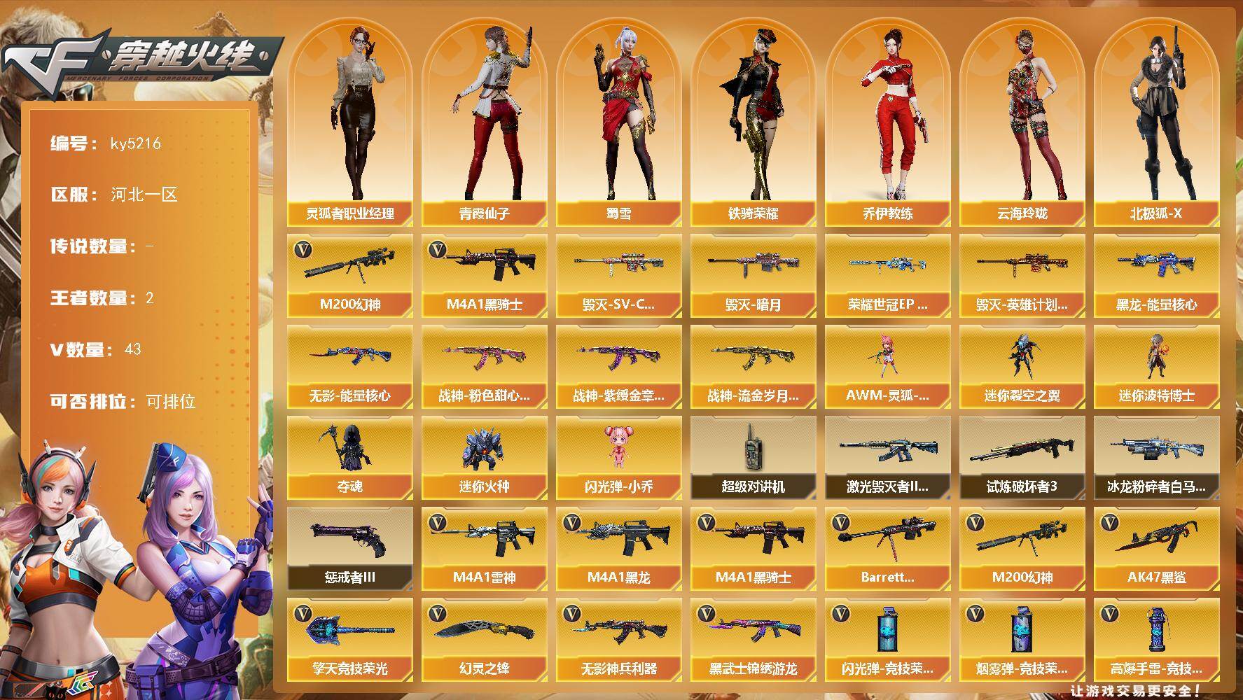 [16087652]河北一区-43V-2王者-0炫金 【热门武器】:M200-幻神,M4A1-黑骑士 【皮肤】:幻神-荣耀世冠EP 皮肤,毁灭-暗月,毁灭-SV-CFPLS16冠军,毁灭-英雄计划 皮肤,黑龙-能量核心,无影-能量核心,战神-粉色甜心皮肤*2,战神-紫绶金章皮肤*3,战神-流金岁月皮肤*2 【角色】:妮妮,乔伊教练,云海玲珑,北极狐-X,电竞少女,芳心审判者,风暴女,嘉年华灵狐,0号玩家,灵狐-花神,灵狐者-X,灵狐者-七夕宝贝,灵狐者-职业经理,曼陀罗-礼服,潘多拉-甜心教官,青霞仙子,斯沃特-X,蜀雪,铁骑荣耀,兔囡囡,新娜塔莎,雪莉杨,雪莉杨-摸金校尉,夜玫瑰-幻能朋克,夜玫瑰-宠粉,游珑儿 【人偶武器】:AWM-灵狐-15周年嘉年华,迷你裂空之翼*2,迷你波特博士*9,夺魂*7,迷你火种*5,闪光弹-小乔 【暴走生化】:超级对讲机 【挑战大师】:冰龙粉碎者-白马银枪,激光毁灭者III-白马银枪,试炼破坏者III,惩戒者III 【英雄级武器】:M4A1-黑龙,M4A1-雷神,M4A1-黑骑士,AK47-黑鲨,无影-神兵利器,黑武士-锦绣游龙,AK-47-猩红传说*5,AK47-B-战神,Barrett-毁灭*2,M200-幻神,烈龙-云海游龙,柯尔特-荣耀世冠EP,幻灵之锋*2,擎天-竞技荣光,擎天-云海游龙,高爆手雷-幻灵*2,高爆手雷-竞技荣光*2,手雷-云海游龙,闪光弹-幻灵*2,闪光弹-竞技荣光,烟雾弹-幻灵*4,烟雾弹-竞技荣光,烟雾弹-荣耀世冠EP*2 【道具】:BS战队炫彩背包,CFS限定背包,云海游龙炫彩背包,全能枪王背包,超级背包,黄金超能特工背包,哔哩哔哩名片,女皇终结者-魔龙之吻,救世主-黑桃战神,绿色巨人,灵魂忍者,迷雾幽灵,生化弹匣,夺命之镰,防化服*3,金色流光-枪王排位*2,星辰流光-枪王排位,枪王排位28赛季金色流光,云海游龙表情,防弹头盔*4,防弹衣*3,C4工具钳*4,手雷包*4 【特殊枪械】:1黑骑士