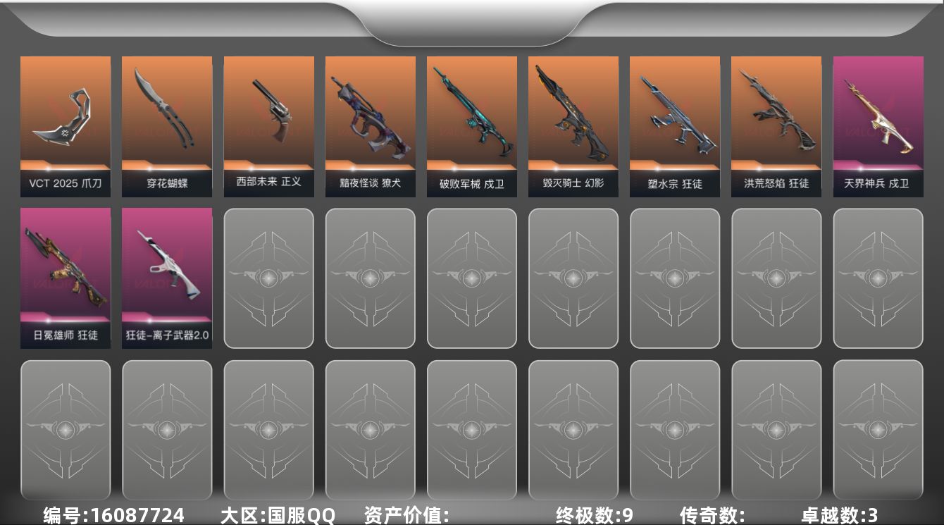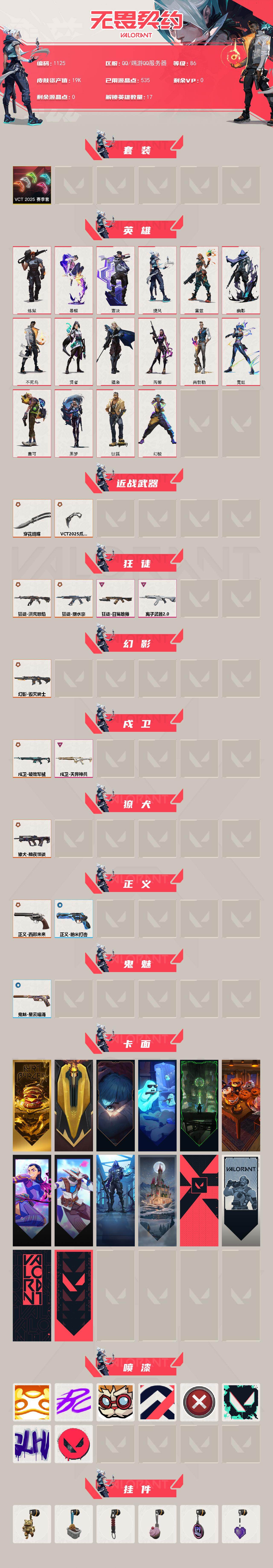 [16087724]【套装】:VCT 2025 赛季套装 【英雄】:幻棱,炼狱,暮蝶,钛狐,壹决,捷风,雷兹,幽影,不死鸟,贤者,猎枭,芮娜,尚勃勒,霓虹,盖可,黑梦 【近战武器】:近战武器-穿花蝴蝶,近战武器-VCT 2025 爪刀 【狂徒】:狂徒-洪荒怒焰,狂徒-塑水宗,狂徒-日冕雄师,狂徒-离子武器//2.0 【幻影】:幻影-毁灭骑士 【戍卫】:戍卫-破败军械,戍卫-天界神兵 【獠犬】:獠犬-黯夜怪谈 【正义】:正义-西部未来,正义-纳米打击 【鬼魅】:鬼魅-星云暗涌 【卡面】:终章:激斗汉堡 卡面,进入射程 卡面,《双城之战》拥抱 卡面,精灵大战 卡面,欢迎来到底城 卡面,南瓜盛典 卡面,无畏契约GO!第一卷:芮娜 卡面,无畏契约GO!第一卷:零 卡面,暗枪 卡面,胡桃狂想 卡面,代号红色 卡面,新兵报到 卡面,V契约 卡面,无畏契约 卡面 【喷漆】:嗨宝南瓜灯 喷漆,嘭! 喷漆,都算到了 喷漆,控场勿近 喷漆,买装还是存钱 喷漆,胜利属于无畏契约 喷漆,GLHF 喷漆,无畏契约 喷漆 【挂饰】:终章:猫猫木乃伊 挂饰,悠闲鸡块 挂饰,伞绳 挂饰,《双城之战》小蛋糕 挂饰,第九季//第三幕 纪念币 挂饰,薰衣草之心 挂饰,天外飞客 挂饰,无畏契约 纪念币 挂饰