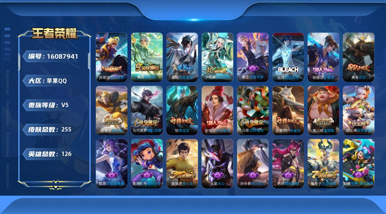 [16087941]苹果Q-V5-至尊星耀IV段位-124英雄-254皮肤-1典藏皮肤-2传说-74史诗