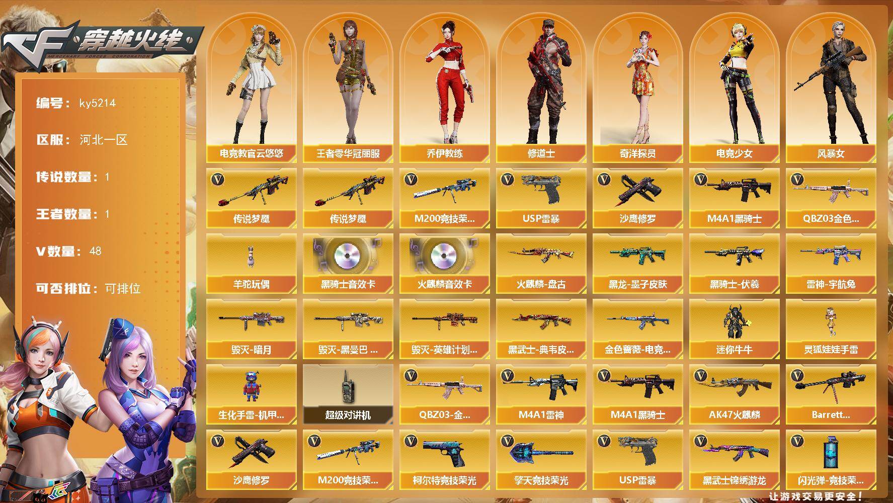 [16088385]河北一区-48V-1王者-0炫金 【传说武器】:传说梦魇 【热门武器】:传说梦魇,QBZ03-金色蔷薇,M200-竞技荣光,M4A1-黑骑士,羊驼玩偶,USP-雷暴,沙鹰-修罗 【音效卡】:AK47-火麒麟音效卡,M4A1-黑骑士音效卡 【皮肤】:金色蔷薇-电竞之星 皮肤,雷神-宇航兔皮肤,火麒麟-盘古,毁灭-暗月,毁灭-黑曼巴 皮肤,毁灭-英雄计划 皮肤,黑龙-墨子皮肤,黑骑士-伏羲,黑武士-典韦皮肤 【角色】:电竞教官-云悠悠,王者零-华冠丽服,奇洋探员,乔伊教练,修道士,电竞少女,风暴女,0号玩家,潘多拉-X,潘多拉-甜心教官,潜龙队-X,新娜塔莎,影武者-X 【人偶武器】:迷你牛牛,生化手雷-机甲核心*2,灵狐娃娃手雷 【暴走生化】:超级对讲机 【英雄级武器】:AK47-火麒麟,M4A1-雷神,M4A1-黑骑士,黑武士-锦绣游龙,超新星-热带奇洋,QBZ03-金色蔷薇,王者冰魄-觉醒版,Barrett-毁灭,M200-竞技荣光,沙鹰-修罗,USP-雷暴,柯尔特-竞技荣光*5,擎天-竞技荣光*6,龙啸-热带奇洋,高爆手雷-竞技荣光*7,手雷-热带奇洋,闪光弹-竞技荣光*7,烟雾弹-竞技荣光*7 【道具】:CFS限定背包,奇洋探员-海龟背包,热带奇洋炫彩背包,女皇终结者-魔龙之吻,绿色巨人,灵魂忍者*2,迷雾幽灵,夺命之镰,防化服*3,金色流光-枪王排位*2,星辰流光-枪王排位,流光-鎏金之域,枪王排位28赛季金色流光,枪王排位29赛季金色流光,电玩兔兔表情,热带奇洋表情,EP战队名片,EP战队喷图,EP战队击杀图标,防弹头盔*6,防弹衣*6,C4工具钳*6,手雷包*6 【特殊枪械】:1黑骑士