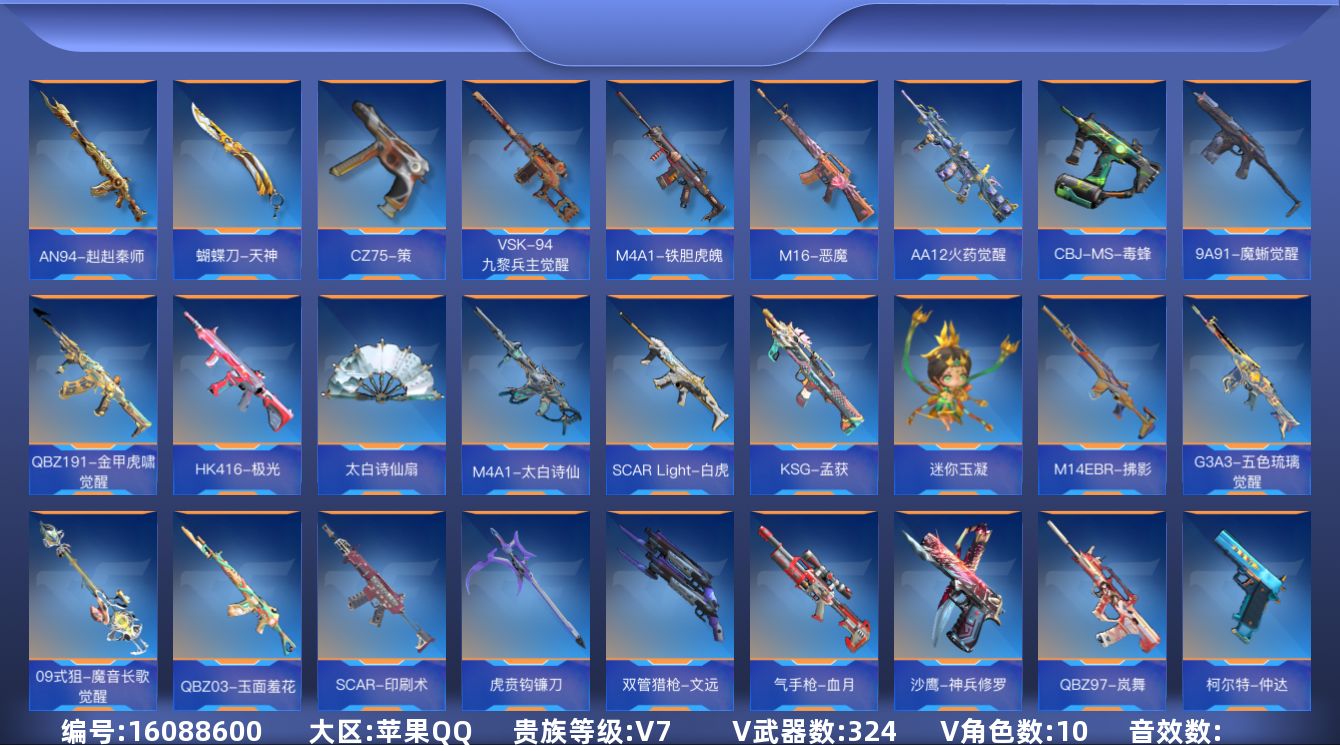 [16088600]10英雄角色数-314英雄武器数 【王者系列】:王者之影,王者之心,王者之迹,王者之蝶,王者之兽,王者之狱,王者之魂,王者之霆,王者之业,王者之誉 【热门武器】:KSG-孟获,81式-光明之神,M4A1-仲达,AK47-常胜,M4A1-星象,AK47-游骑兵,M4A1-游骑兵,TAC-慈,M200-幻神,AWM-游骑兵,VEPR12-宙斯,COP 357-赤龙,黄金COP 357,COP 357-A,COP 357-绚樱*4,CZS2-仲康,AN94-盖 【角色】:幽灵刀锋-觉醒,樱,瞳,关小雨,职场灵狐-赛事经理,零-水下丽影,炽天使-X,零-新生,步练师,罗峰&巴巴塔-X 【英雄武器】:AK47-无影,AK47-火麒麟,AK47-麒麟,AK47-角斗士,AK47-耀金伯爵,AK47-游骑兵,AK47-常胜,AK47-樱斗士-二觉,AK47-竞技战魂,AK47-猩红传说,AK47-燎天净火,AK47-雷麒麟,AK47-心动次元,AK47-血武士,AK47-华夏传说,AK47-黑鲨,AK47-木兰,AK47-谜城烟火*2,M4A1-雷神*2,M4A1-黑骑士,M4A1-黑龙,M4A1-死神*2,M4A1-玫瑰精灵,M4A1-天使,M4A1-游骑兵,M4A1-枪娘,M4A1-星象,M4A1-雷神-萝拉,M4A1-龙血,M4A1-仲达,M4A1-机械迷城,M4A1-破空冰刃,M4A1-心动次元,M4A1-运输船*2,M4A1-猎神,M4A1-夏清,M4A1-太白诗仙*2,M4A1-铁胆虎魄,SCAR-幽暗骑士,SCAR Light-白虎,SCAR-探星者,SCAR-印刷术,SCAR-心动PICK,剑齿虎-炫彩,AN94-四凶觉醒,AN94-赳赳秦师,AN94-盖,AUG-机械纪元,9A91-天神,9A91-魔蜥觉醒,M14EBR-天神,M14EBR-拂影,M14EBR-葫芦山庄*2,M16-恶魔,AK12-天启,QBZ03-湮灭*2,QBZ03-金色蔷薇,QBZ03-死神*2,QBZ03-玉面羞花,HK416-极光,HK417-炎龙铠甲,81式-光明之神,MK47-云舞,G3A3-五色琉璃觉醒,G3A3-衍神兵*2,QBZ97-岚舞,QBZ97-浩瀚征途,QBZ191-金甲虎啸觉醒,QBZ191-封神榜,AWM-天龙,AWM-游骑兵,AWM-指南针,巴雷特-毁灭*2,
