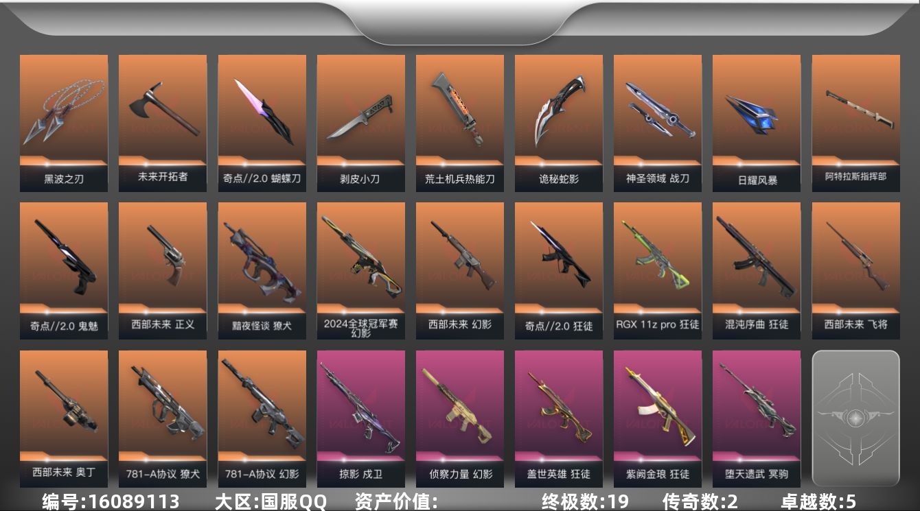 [16089113]【套装】:西部未来套装,奇点//2.0套装 【英雄】:幻棱,炼狱,维斯,暮蝶,钛狐,壹决,铁臂,捷风,雷兹,幽影,不死鸟,贤者,猎枭,蝰蛇,零,芮娜,奇乐,霓虹,斯凯,夜露,K/O,盖可,黑梦,钢锁 【近战武器】:近战武器-剥皮小刀,近战武器-奇点//2.0 蝴蝶刀,近战武器-黑波之刃,近战武器-未来开拓者,近战武器-荒土机兵 热能刀,近战武器-诡秘蛇影 军刀,近战武器-神圣领域 战刀,近战武器-日耀风暴 遗器,近战武器-阿特拉斯指挥部 甩棍 【狂徒】:狂徒-混沌序曲,狂徒-奇点//2.0,狂徒-RGX 11z Pro,狂徒-盖世英雄,狂徒-紫阙金琅,狂徒-荒土机兵,狂徒-诡秘蛇影 【幻影】:幻影-781-A协议,幻影-2024全球冠军赛,幻影-西部未来,幻影-侦察力量,幻影-神圣领域,幻影-纳米打击,幻影-末日之翼,幻影-西部未来 【戍卫】:戍卫-掠影,戍卫-逆冲蛮牛,戍卫-月球哨兵,戍卫-折光棱晶 【獠犬】:獠犬-781-A协议,獠犬-黯夜怪谈,獠犬-神圣领域,獠犬-逆冲蛮牛 【冥驹】:冥驹-堕天遗武,冥驹-荒土机兵,冥驹-星云暗涌 【飞将】:飞将-西部未来,飞将-末日之翼 【莽侠】:莽侠-诡秘蛇影,莽侠-月球哨兵 【战神】:战神-神圣领域 【奥丁】:奥丁-西部未来,奥丁-纳米打击,奥丁-末日之翼 【判官】:判官-诡秘蛇影,判官-纳米打击x 【雄鹿】:雄鹿-逆冲蛮牛,雄鹿-月球哨兵 【骇灵】:骇灵-荒土机兵,骇灵-星云暗涌 【蜂刺】:蜂刺-星云暗涌,蜂刺-折光棱晶 【标配】:标配-荒土机兵,标配-钢铁意志,标配-折光棱晶 【正义】:正义-西部未来,正义-纳米打击,正义-月球哨兵 【鬼魅】:鬼魅-奇点//2.0,鬼魅-诡秘蛇影,鬼魅-星云暗涌 【狂怒】:狂怒-神圣领域,狂怒-逆冲蛮牛 【短炮】:短炮-末日之翼 【卡面】:进入射程 卡面,分崩离析 卡面,纳米打击 卡面,抑制技术 卡面,激斗汉堡 卡面,瓦娃脸雪糕 P2 卡面,从黄昏到黎明 卡面,荒土机兵 卡面,银弹猎手 卡面,逆冲蛮牛 卡面,《双城之战》拥抱 卡面,精灵大战 卡面,欢迎来到底城 卡面,南瓜盛典 卡面,奇点//2.0 卡面,正义的化身 卡面,时间到 卡面,最高舞台 卡面,红鳞松叶 卡面,梦幻奶茶 卡面,无畏契约GO!第一卷:芮娜 卡面,无畏契约GO!第一卷:零 卡面,《双城之战》金克丝 卡面,一击全倒