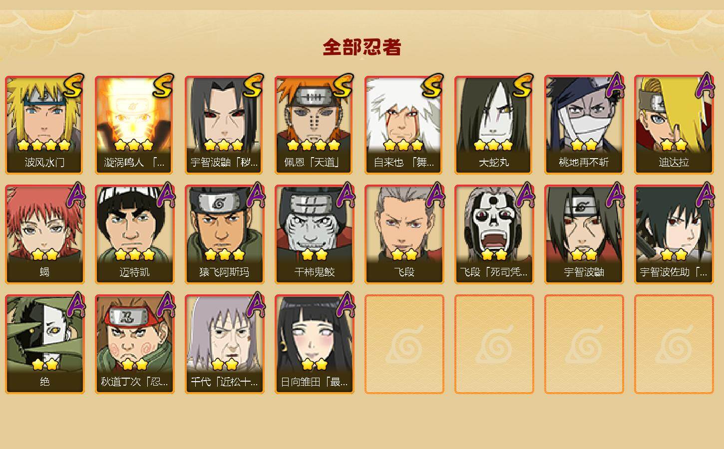 【S级忍者】:宇智波鼬「秽土转生」(3星),自来也「舞之豪杰」(3星),大蛇丸(3星),波风水门(4星),漩涡鸣人「九喇嘛连结」(3星),佩恩「天道」(4星)