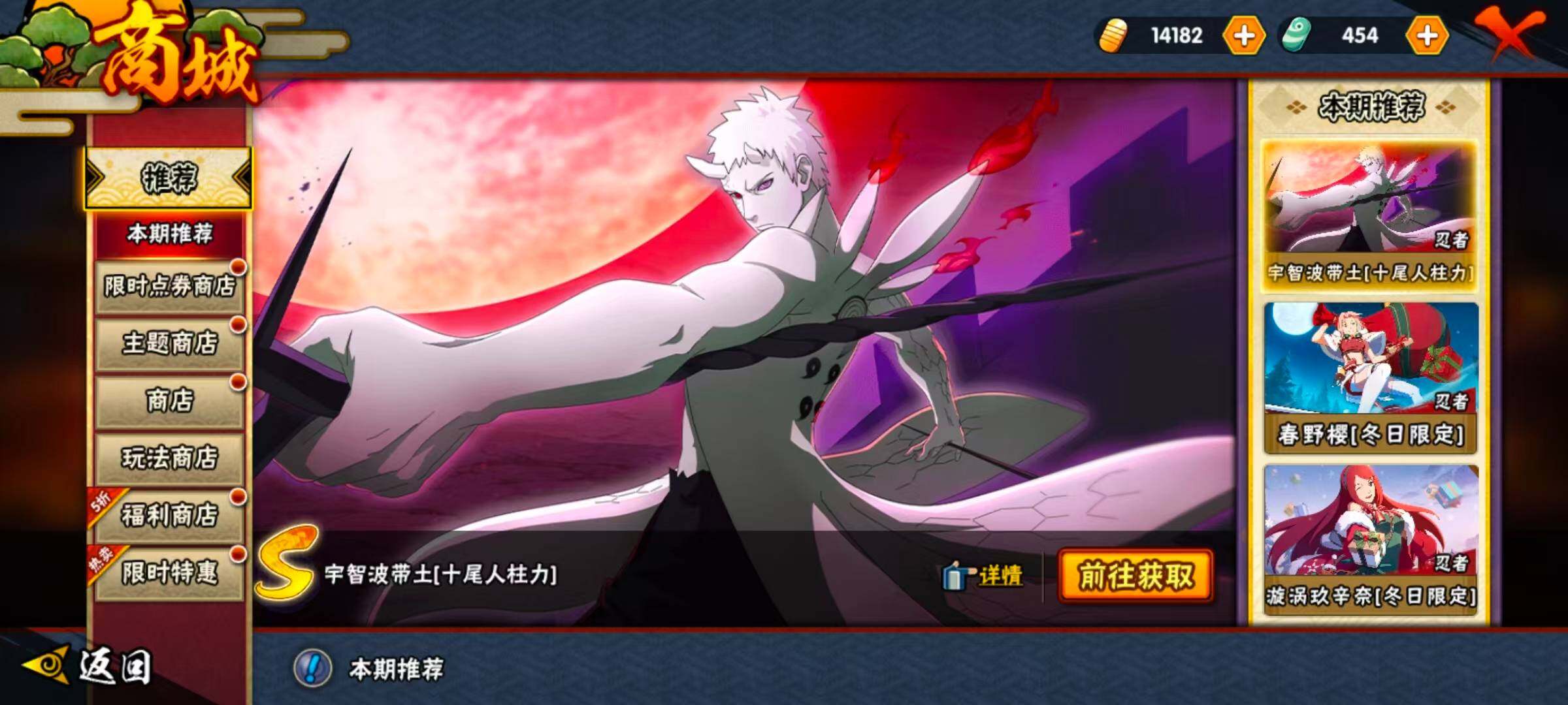 【S级忍者】:长门「秽土转生」(3星),半藏「秽土转生」(3星),金角·银角「秽土转生」(3星),猿飞日斩「秽土转生」(3星),波风水门「秽土转生」(5星),千手扉间「秽土转生」(4星),千手柱间「秽土转生」(3星),宇智波鼬「秽土转生」(4星),宇智波斑「秽土转生」(3星),宇智波斑「秽土转生·解」(3星),大野木「忍界大战」(3星),春野樱「忍界大战」(3星),宇智波带土「忍界大战」(3星),艾「忍界大战」(3星),宇智波鼬「须佐能乎」(4星),宇智波止水「须佐能乎」(3星),宇智波斑「木叶创立」(3星),千手柱间「木叶创立」(3星),无「二代目土影」(3星),艾「四代目雷影」(3星),罗砂「四代目风影」(3星),鬼灯幻月「二代目水影」(4星),大野木「三代目土影」(3星),艾「三代目雷影」(3星),自来也(4星),自来也「仙人模式」(3星),自来也「舞之豪杰」(3星),大蛇丸(4星),自来也「传说中的三忍」(3星),纲手(4星),纲手「百豪」(4星),千手柱间(3星),千手扉间(3星),猿飞日斩(4星),宇智波斑(3星),波风水门(4星),药师兜「仙人模式」(3星),神秘面具男(3星),神秘面具男「红夜之刃」(3星),漩涡鸣人「九喇嘛连结」(3星),迈特凯「死门」(3星),佩恩「天道」(4星),佩恩·天道「超」(3星),宇智波佐助「永恒万花筒」(3星),宇智波斑 「白面具」(4星宇智波斑「白面具」),大筒木金式(3星),大筒木桃式(3星),漩涡鸣人·宇智波佐助(3星)