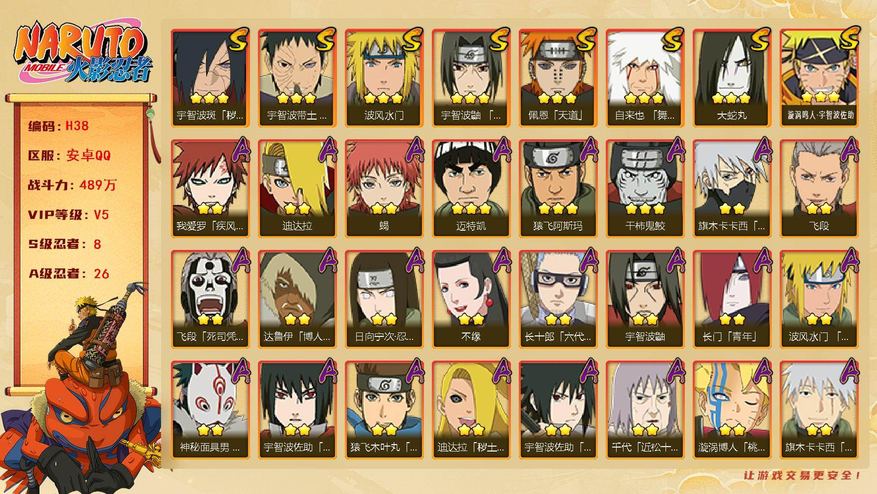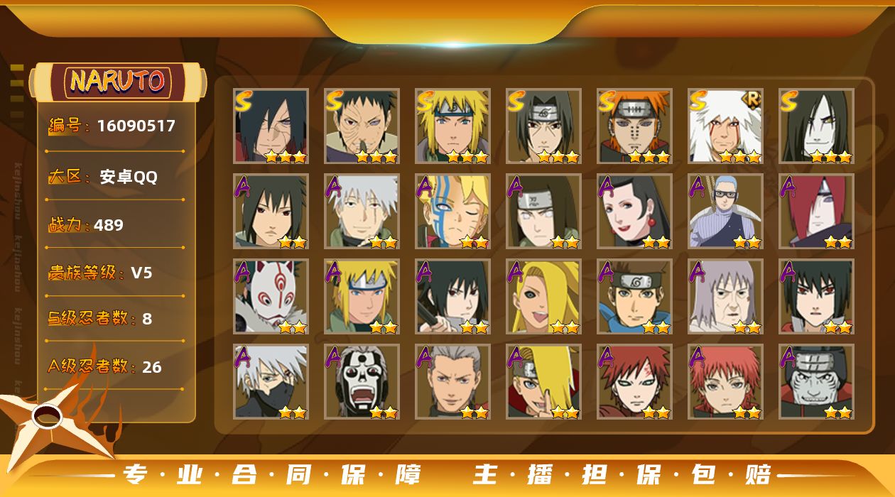 - [11843735]V11 19S忍 35A忍 19通灵 976.2W战力 可二次 可修改实名 优质装备:熊猫,猿飞日斩「秽土转生」,长门「秽土转生」,迈特凯「死门」,宇智波带土 「忍界大战」,“宇智波斑” 「白面具」,漩涡鸣人 「九喇嘛连结」,神秘面具男 「红夜之刃」,宇智波佐助「永恒万花筒」,千手柱间·木叶创立,宇智波斑「秽土转生·解」,大筒木桃式,艾「忍界大战」,大筒木舍人 「最终章」 S级忍者:自来也 「舞之豪杰」,宇智波鼬 「须佐能乎」,佩恩「天道」,波风水门,大蛇丸,自来也