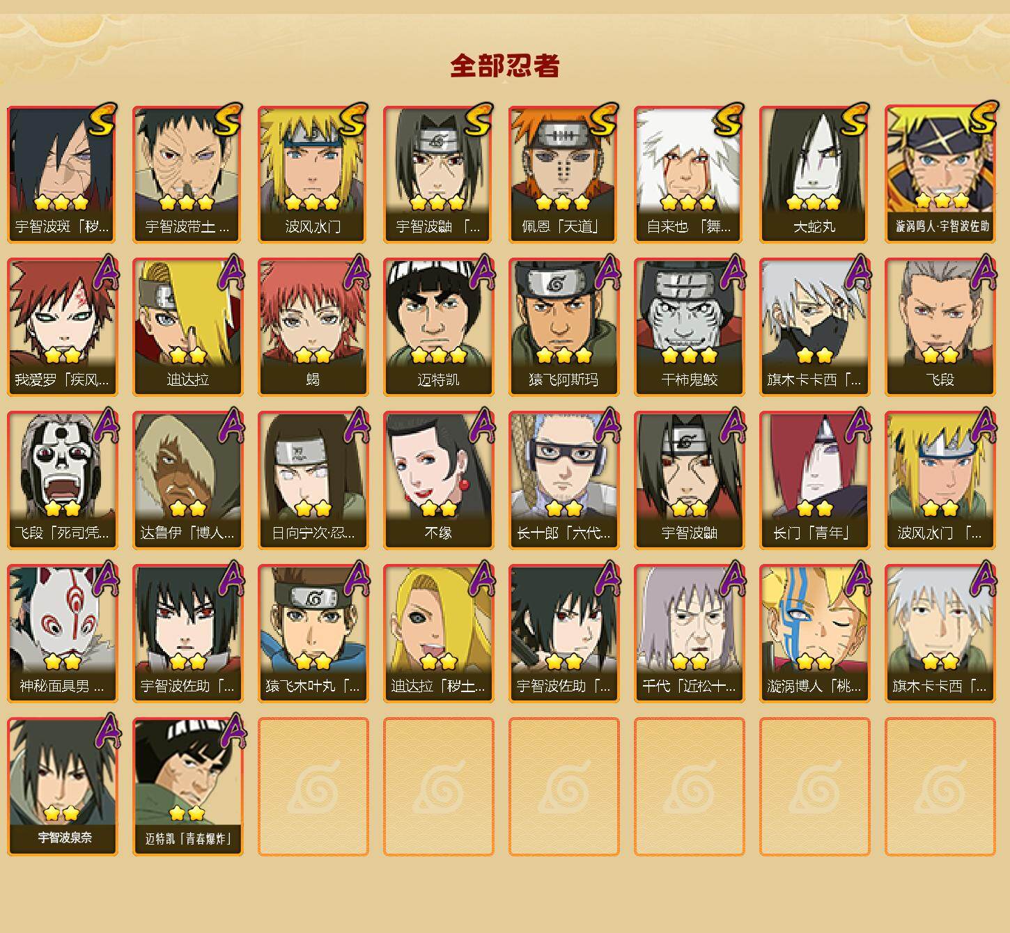 【S级忍者】:宇智波斑「秽土转生·解」(3星),宇智波带土「忍界大战」(3星),宇智波鼬「须佐能乎」(3星),自来也「舞之豪杰」(3星),大蛇丸(3星),波风水门(3星),佩恩「天道」(3星),漩涡鸣人·宇智波佐助(3星)
