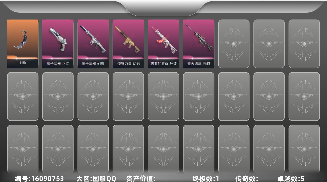 [16090753]【英雄】:炼狱,壹决,铁臂,捷风,雷兹,不死鸟,贤者,猎枭,芮娜,尚勃勒,霓虹,K/O,盖可,黑梦 【近战武器】:近战武器-影钩 【狂徒】:狂徒-盖亚的复仇 【幻影】:幻影-离子武器,幻影-侦察力量 【冥驹】:冥驹-堕天遗武 【正义】:正义-离子武器 【卡面】:南瓜盛典 卡面,先瓦为敬 - 银色 卡面,树懒大作战 卡面,Clutch 卡面,无畏契约GO!第一卷:零 卡面,《双城之战》金克丝 卡面,暗枪 卡面,代号红色 卡面,新兵报到 卡面,V契约 卡面,无畏契约 卡面 【喷漆】:蛋糕还是爆能器? 喷漆,吸一口快乐 喷漆,霓光四射 喷漆,买装还是存钱 喷漆,醒狮贺春 喷漆,关门放狗 喷漆,胜利属于无畏契约 喷漆,GLHF 喷漆,无畏契约 喷漆 【挂饰】:迷你K/O 挂饰,好运福爪 挂饰,无畏契约 纪念币 挂饰