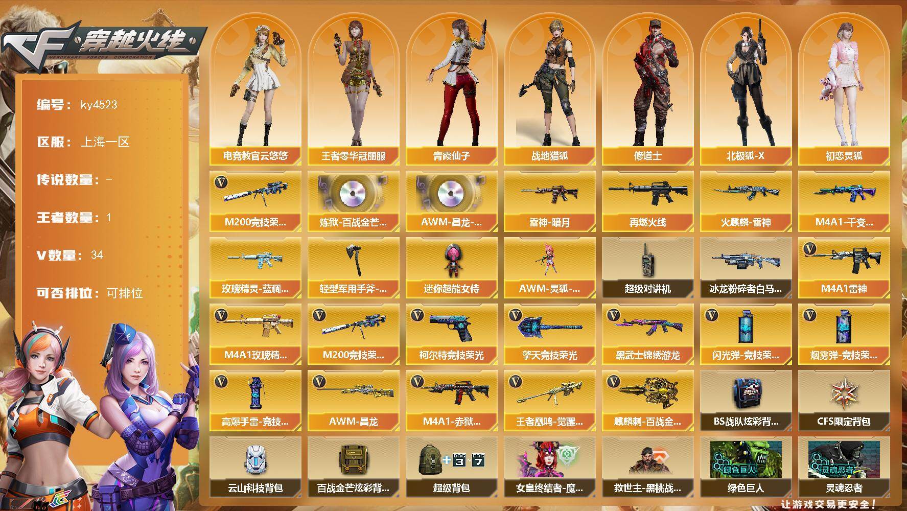 [16093347]上海一区-34V-1王者-0炫金 【传说角色】:传说星骇 【热门武器】:M200-竞技荣光 【音效卡】:炼狱-百战金芒-庆典舞曲音效卡,AWM-昌龙-怀旧音效卡 【皮肤】:雷神-暗月,M4A1-再燃火线,火麒麟-雷神,M4A1-千变-孔明皮肤,玫瑰精灵-蓝调梦幻 皮肤,轻型军用手斧-再燃火线 【角色】:电竞教官-云悠悠,战地猎狐,王者零-华冠丽服,修道士,北极狐-X,初恋灵狐,电竞少女,风暴女,嘉年华灵狐,猎狐者-追月,0号玩家,灵狐者-X,曼陀罗-X,曼陀罗-礼服,潘多拉-X,青霞仙子,蛇姬,游珑儿 【人偶武器】:AWM-灵狐-15周年嘉年华,迷你超能女侍 【暴走生化】:超级对讲机 【挑战大师】:冰龙粉碎者-白马银枪*2 【英雄级武器】:M4A1-雷神,黑武士-锦绣游龙,M4A1-玫瑰精灵,M200-竞技荣光,王者凰鸣-觉醒版,柯尔特-竞技荣光*2,擎天-竞技荣光,麒麟刺-百战金芒,高爆手雷-竞技荣光*7,闪光弹-竞技荣光*7,烟雾弹-竞技荣光*7,M4A1-赤狱骑士,AWM-昌龙 【道具】:BS战队炫彩背包,CFS限定背包,云山科技背包,百战金芒炫彩背包,超级背包,女皇终结者-魔龙之吻,救世主-黑桃战神,绿色巨人,灵魂忍者*3,变异宝贝,迷雾幽灵*2,生化弹匣,夺命之镰,防化服*3,金色流光-枪王排位,星辰流光-枪王排位,巅峰赛先锋-金色流光,枪王排位28赛季金色流光,枪王排位29赛季金色流光,语音特效-盛典烟火,萌萌小葵表情,云海游龙表情,EP战队名片,EP战队喷图,EP战队击杀图标,防弹头盔*3,防弹衣*3,C4工具钳*3,手雷包*3 【特殊枪械】: