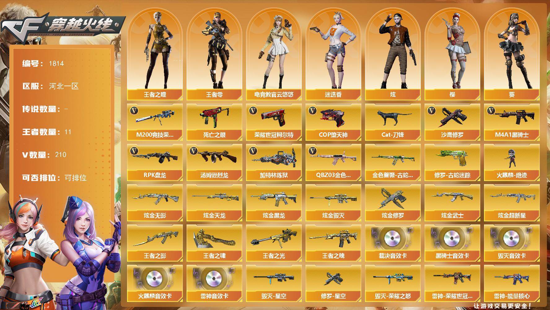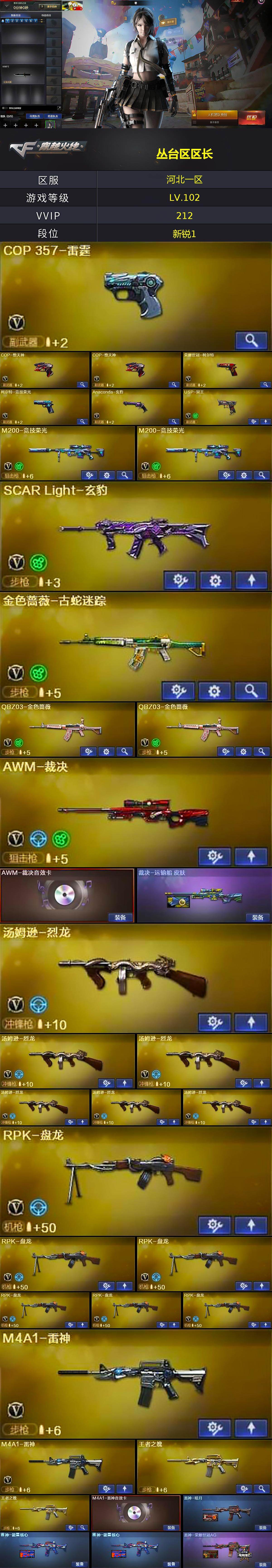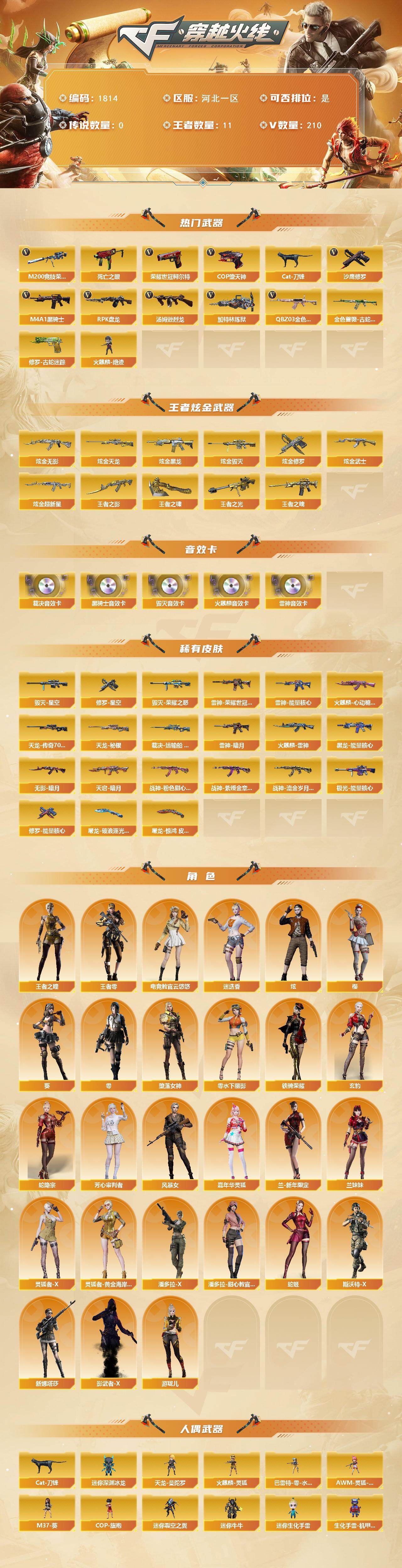 [16093633]河北一区-210V-11王者-10炫金 【热门武器】:QBZ03-金色蔷薇*2,金色蔷薇-古蛇迷踪,修罗-古蛇迷踪,M200-竞技荣光*2,死亡之眼,荣耀世冠-柯尔特,Cat-刀锋,M4A1-黑骑士*2,汤姆逊-烈龙*6,RPK-盘龙*6,加特林-炼狱*2,火麒麟-绝迹,COP-堕天神*2,沙鹰-修罗*5 【王者炫金武器】:王者之影*3,王者之魄*2,王者之光,王者之啸*2,炫金无影,炫金黑龙,炫金武士,炫金超新星*2,炫金毁灭*2,炫金天龙,炫金修罗*2 【音效卡】:AK47-火麒麟音效卡,M4A1-雷神音效卡,M4A1-黑骑士音效卡,Barrett-毁灭音效卡,AWM-裁决音效卡 【皮肤】:裁决-运输船 皮肤,雷神-暗月,雷神-能量核心*2,雷神-荣耀世冠AG,火麒麟-雷神,火麒麟-心动糖果,毁灭-荣耀之怒,毁灭-星空,黑龙-能量核心,无影-暗月,天启-暗月,战神-粉色甜心皮肤*2,战神-紫绶金章皮肤*6,战神-流金岁月皮肤*6,天龙-秘银,AWM-天龙-传奇70KG,极光-能量核心,修罗-能量核心,修罗-星空*3,屠龙-破浪逐光 皮肤,屠龙-惊鸿 皮肤 【角色】:零,葵,樱,炫,迷迭香,电竞教官-云悠悠,玄豹,王者-零,王者之瞳,堕落女神,蛇隐宗,芳心审判者,风暴女,嘉年华灵狐,兰-新年限定,兰妹妹,零-水下丽影,灵狐者-X,灵狐者-黄金海岸,潘多拉-X,潘多拉-甜心教官,蛇姬,斯沃特-X,铁骑荣耀,新娜塔莎,影武者-X,游珑儿 【人偶武器】:火麒麟-绝迹,天龙-曼陀罗,火麒麟-灵狐,异变清道夫-蛇影双骄,巴雷特-零-水下丽影,迷你地狱终结者,AWM-灵狐-15周年嘉年华,M37-葵,COP-旗袍,Cat-刀锋,迷你深渊冰龙,迷你裂空之翼*2,迷你牛牛,迷你生化手雷,生化手雷-机甲核心*4,闪光弹-小乔 【暴走生化】:死亡之眼,超级对讲机 【挑战大师】:AK47-冰龙粉碎者,激光毁灭者III-白马银枪,VEPR-12-金魔,激光毁灭者III,机甲撕裂者III,试炼破坏者III,KAC-圣炎切割者III,神圣爆裂者-末日III,阐释者III*2,惩戒者III 【英雄级武器】:AK47-火麒麟*7,M4A1-黑龙*2,M4A1-雷神*2,M4A1-黑骑士*2,AK47-无影,M4A1-死神*2,AK47-黑武士*2,AK12-天启*2,AN94-超新星*3,M4