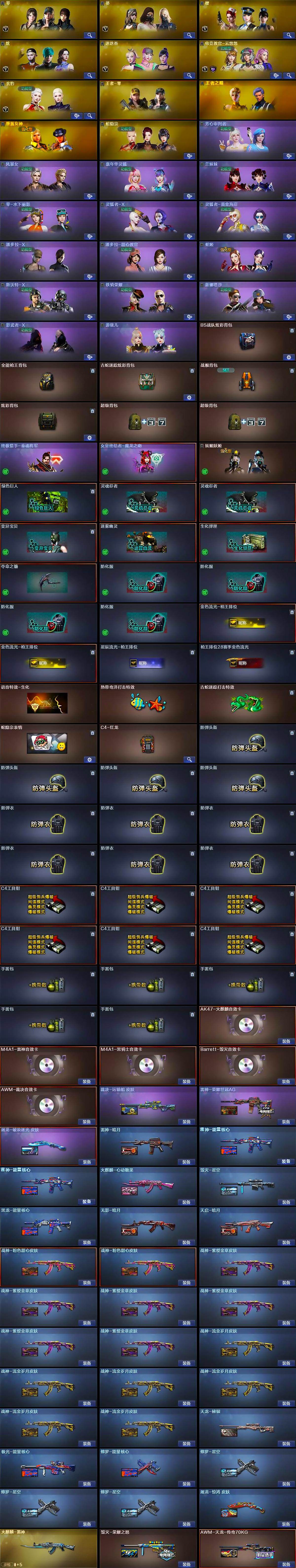 【皮肤】:裁决-运输船 皮肤,雷神-暗月,雷神-能量核心*2,雷神-荣耀世冠AG,火麒麟-雷神,火麒麟-心动糖果,毁灭-荣耀之怒,毁灭-星空,黑龙-能量核心,无影-暗月,天启-暗月,战神-粉色甜心皮肤*2,战神-紫绶金章皮肤*6,战神-流金岁月皮肤*6,天龙-秘银,AWM-天龙-传奇70KG,极光-能量核心,修罗-能量核心,修罗-星空*3,屠龙-破浪逐光 皮肤,屠龙-惊鸿 皮肤