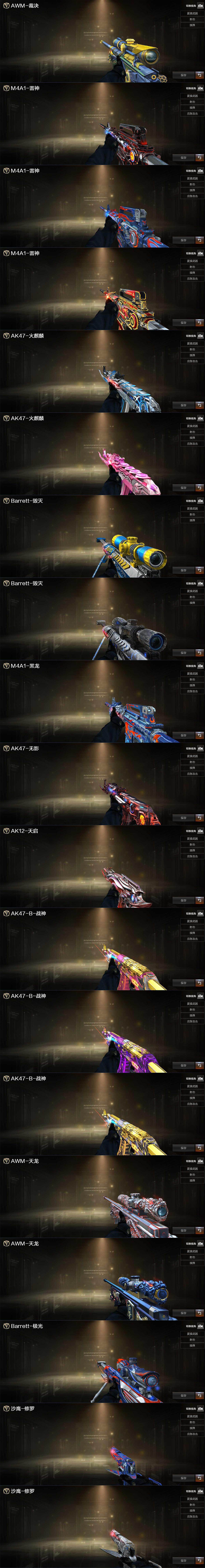 【音效卡】:AK47-火麒麟音效卡,M4A1-雷神音效卡,M4A1-黑骑士音效卡,Barrett-毁灭音效卡,AWM-裁决音效卡