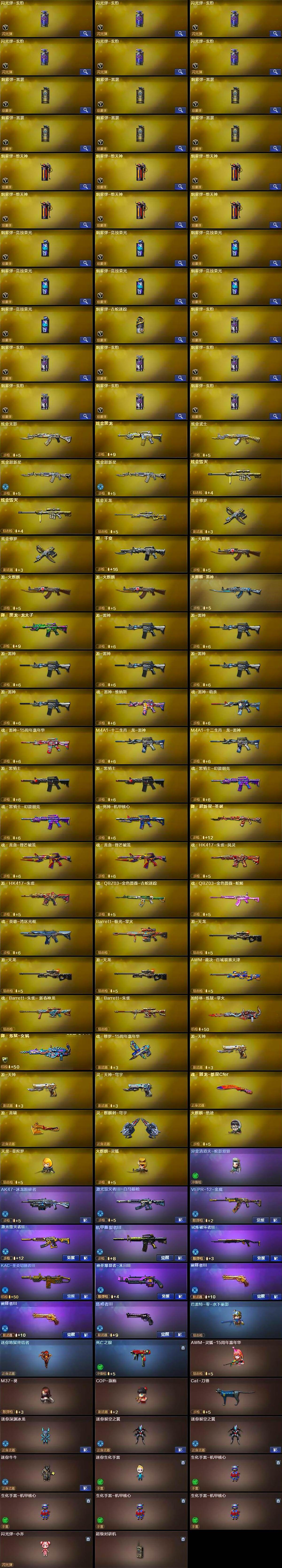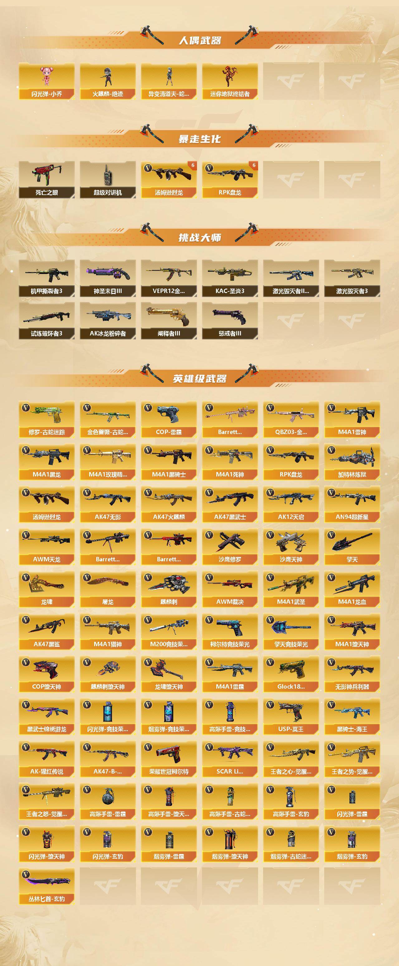 【英雄级武器】:AK47-火麒麟*7,M4A1-黑龙*2,M4A1-雷神*2,M4A1-黑骑士*2,AK47-无影,M4A1-死神*2,AK47-黑武士*2,AK12-天启*2,AN94-超新星*3,M4
