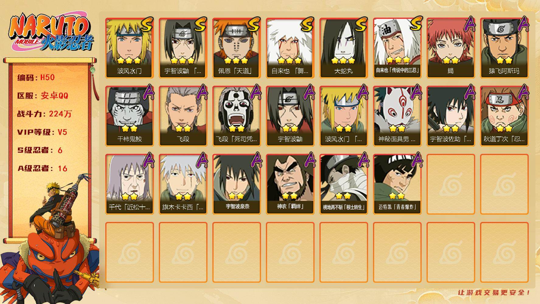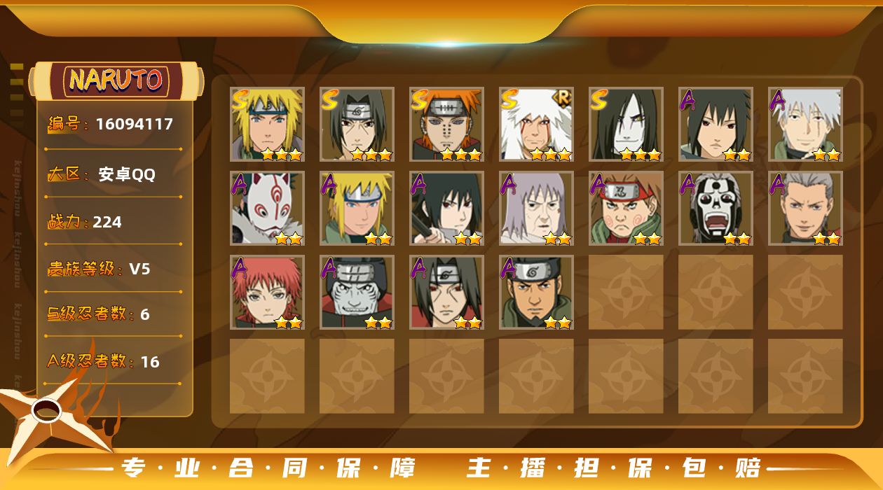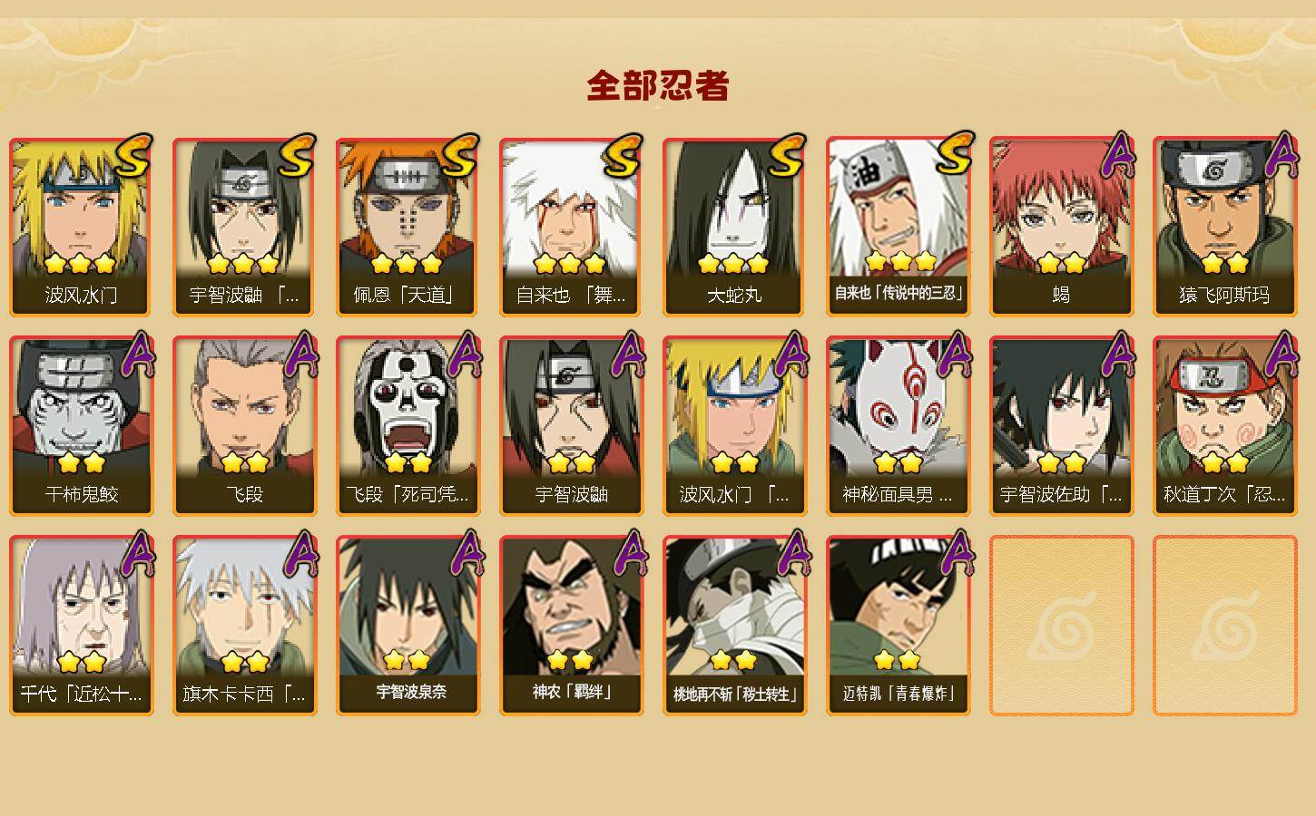 【S级忍者】:宇智波鼬「须佐能乎」(3星),自来也「舞之豪杰」(3星),大蛇丸(3星),自来也「传说中的三忍」(3星),波风水门(3星),佩恩「天道」(3星)