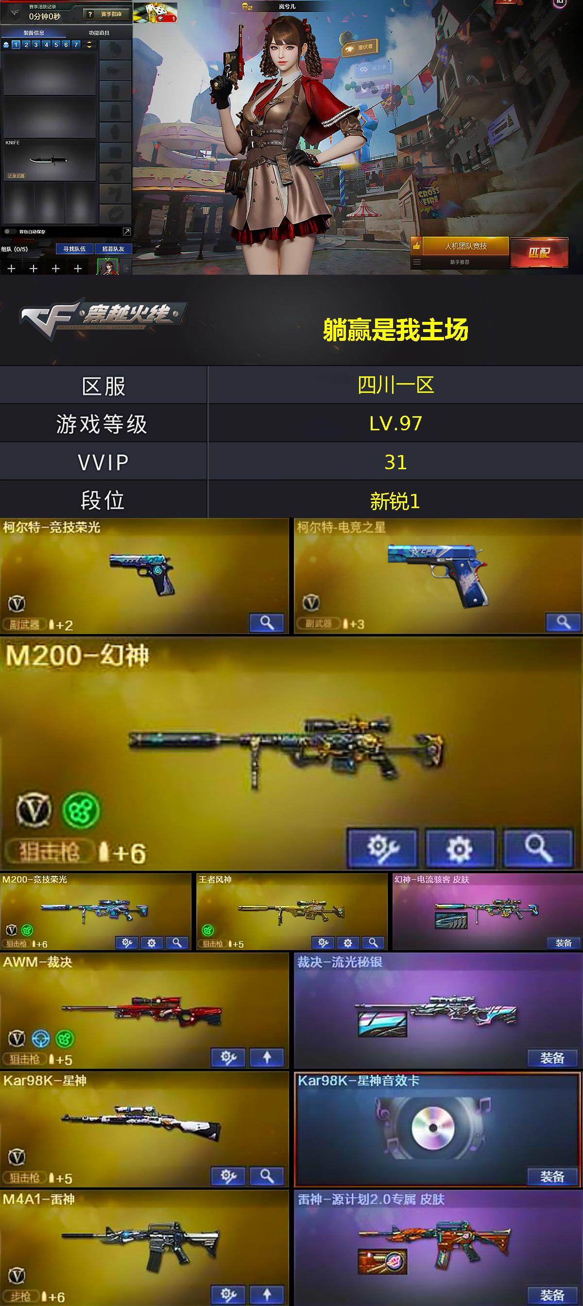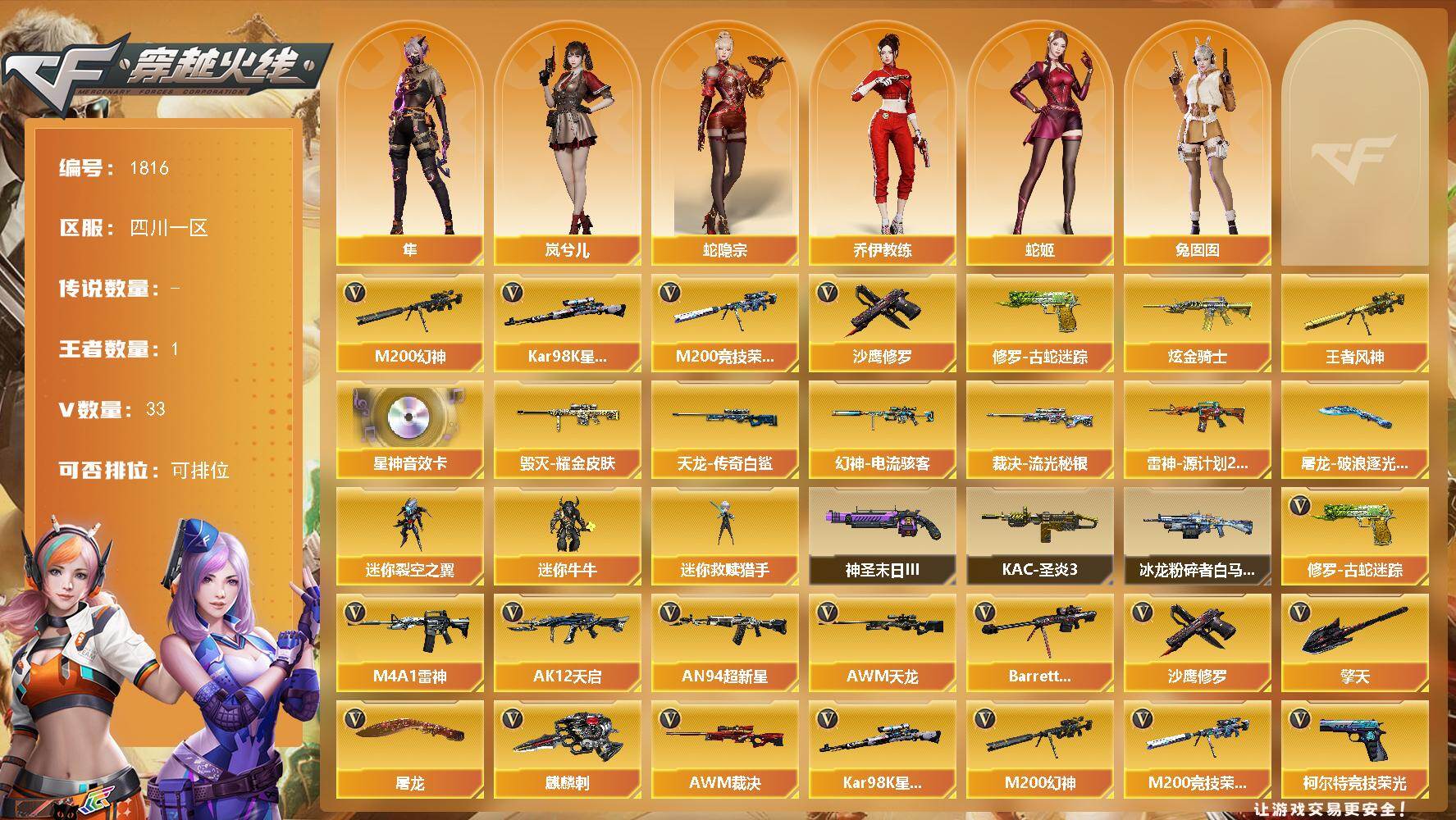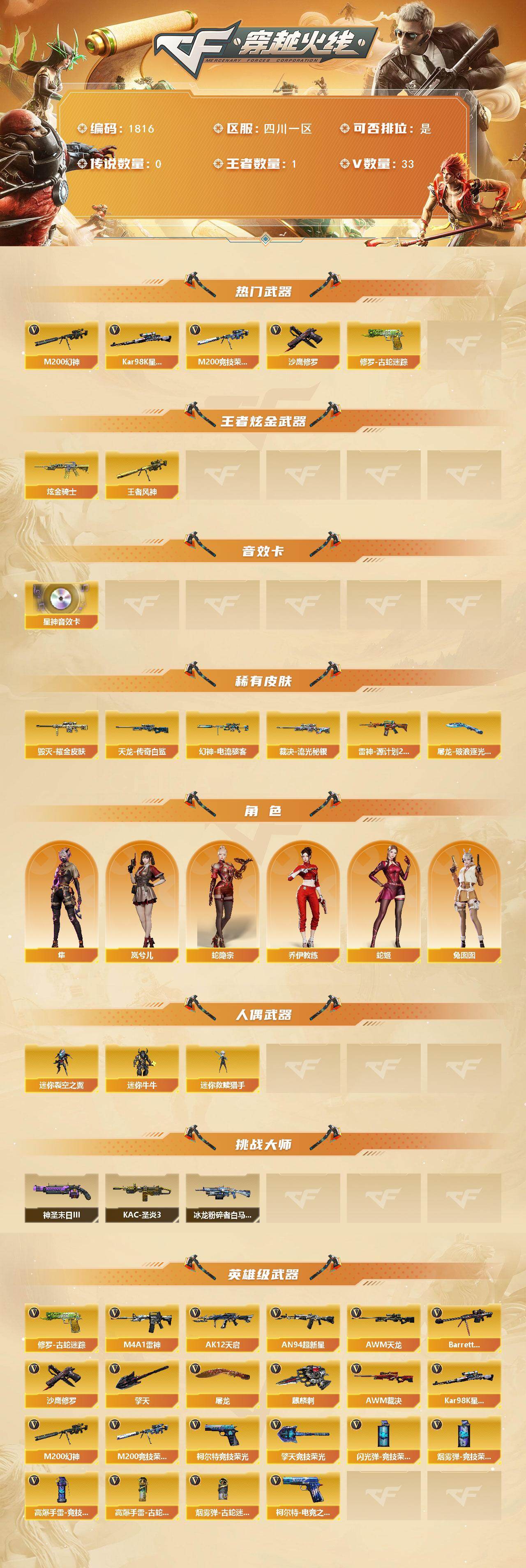 [16094201]四川一区-33V-1王者-1炫金 【热门武器】:M200-幻神,修罗-古蛇迷踪,M200-竞技荣光,Kar98K-星神,沙鹰-修罗 【王者炫金武器】:王者风神,炫金骑士 【音效卡】:Kar98K-星神音效卡 【皮肤】:幻神-电流骇客 皮肤,裁决-流光秘银,雷神-源计划2.0专属 皮肤,毁灭耀金皮肤,AWM-天龙-传奇白鲨,屠龙-破浪逐光 皮肤 【角色】:岚兮儿,隼,蛇隐宗,乔伊教练,蛇姬,兔囡囡 【人偶武器】:迷你救赎猎手,迷你裂空之翼*2,迷你牛牛 【挑战大师】:冰龙粉碎者-白马银枪,KAC-圣炎切割者III,神圣爆裂者-末日III 【英雄级武器】:M4A1-雷神,AK12-天启,AN94-超新星,AWM-天龙,Barrett-毁灭,AWM-裁决,M200-幻神,Kar98K-星神,M200-竞技荣光,沙鹰-修罗,柯尔特-竞技荣光,柯尔特-电竞之星,修罗-古蛇迷踪,屠龙*3,擎天,麒麟刺,擎天-竞技荣光,高爆手雷-竞技荣光*2,高爆手雷-古蛇迷踪,闪光弹-竞技荣光*2,烟雾弹-竞技荣光*2,烟雾弹-古蛇迷踪 【道具】:亚洲杯纪念炫彩背包,古蛇迷踪炫彩背包,迷你冰龙背包,绿色巨人,灵魂忍者,迷雾幽灵,夺命之镰,防化服*2,枪王排位29赛季金色流光,古蛇迷踪打击特效,蛇隐宗表情,C4-红龙,防弹头盔*2,防弹衣*2,C4工具钳*2,手雷包*2 【特殊枪械】: