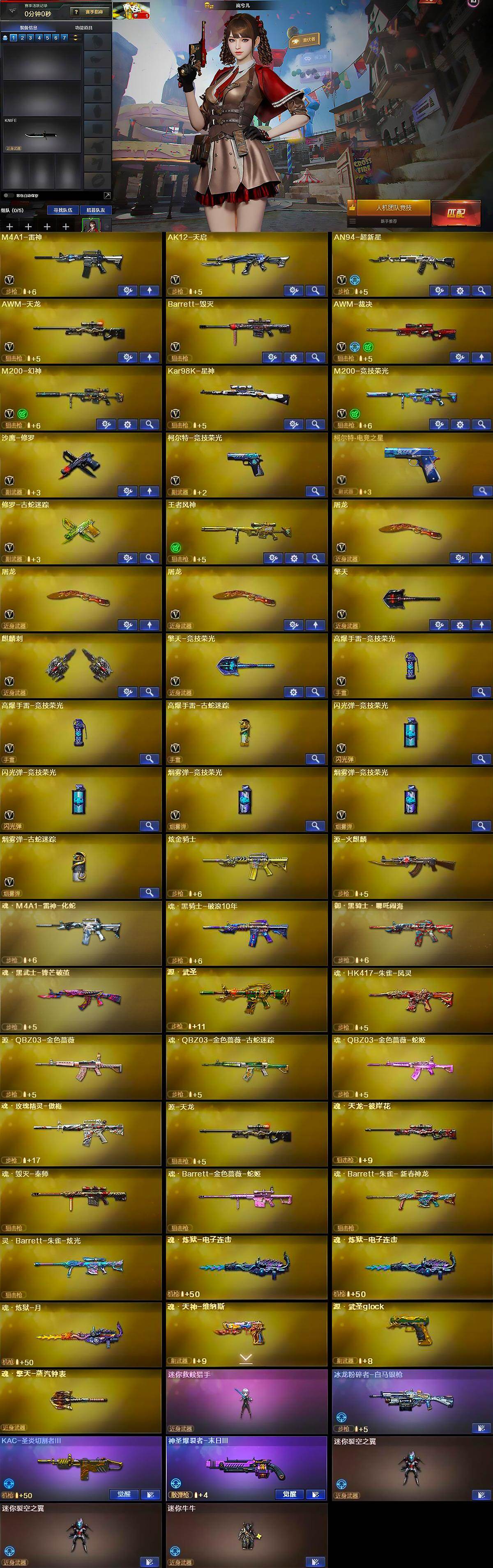 【英雄级武器】:M4A1-雷神,AK12-天启,AN94-超新星,AWM-天龙,Barrett-毁灭,AWM-裁决,M200-幻神,Kar98K-星神,M200-竞技荣光,沙鹰-修罗,柯尔特-竞技荣光,柯尔特-电竞之星,修罗-古蛇迷踪,屠龙*3,擎天,麒麟刺,擎天-竞技荣光,高爆手雷-竞技荣光*2,高爆手雷-古蛇迷踪,闪光弹-竞技荣光*2,烟雾弹-竞技荣光*2,烟雾弹-古蛇迷踪