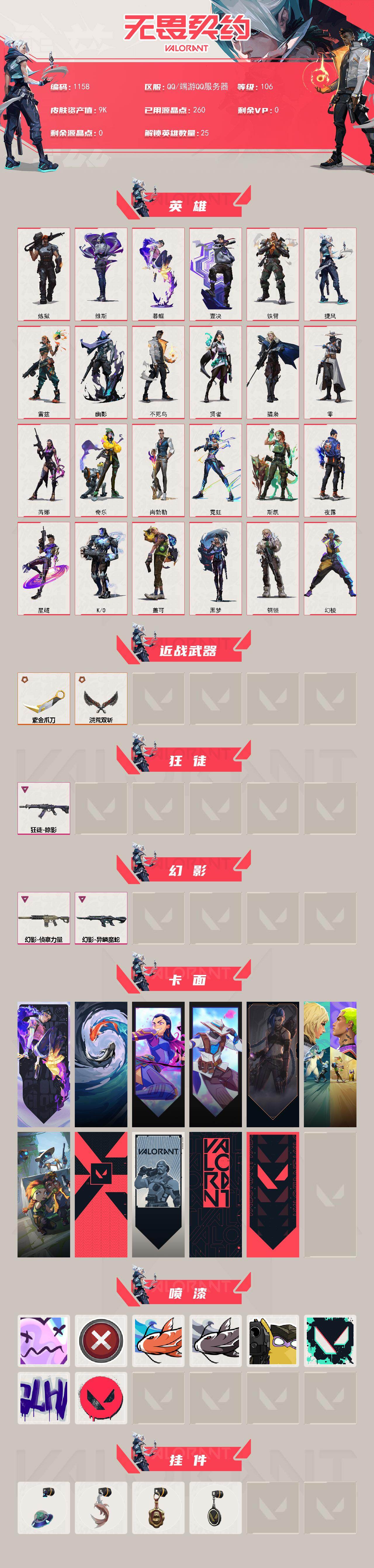 [16094505]【英雄】:幻棱,炼狱,维斯,暮蝶,壹决,铁臂,捷风,雷兹,幽影,不死鸟,贤者,猎枭,零,芮娜,奇乐,尚勃勒,霓虹,斯凯,夜露,星礈,K/O,盖可,黑梦,钢锁 【近战武器】:近战武器-紫金爪刀,近战武器-洪荒双斩 【狂徒】:狂徒-掠影 【幻影】:幻影-侦察力量,幻影-异鳞魔蛇 【卡面】:无畏契约:暮蝶 卡面,红鳞松叶 卡面,无畏契约GO!第一卷:芮娜 卡面,无畏契约GO!第一卷:零 卡面,《双城之战》金克丝 卡面,钢锁vs盖可 卡面,别冒尖 卡面,代号红色 卡面,新兵报到 卡面,V契约 卡面,无畏契约 卡面 【喷漆】:伤心心 喷漆,买装还是存钱 喷漆,红鳞 喷漆,松叶 喷漆,放下武器 喷漆,胜利属于无畏契约 喷漆,GLHF 喷漆,无畏契约 喷漆 【挂饰】:V25第六幕:超凡 挂饰,天外飞客 挂饰,红鳞松叶 挂饰,海豹的认可 挂饰,无畏契约 纪念币 挂饰