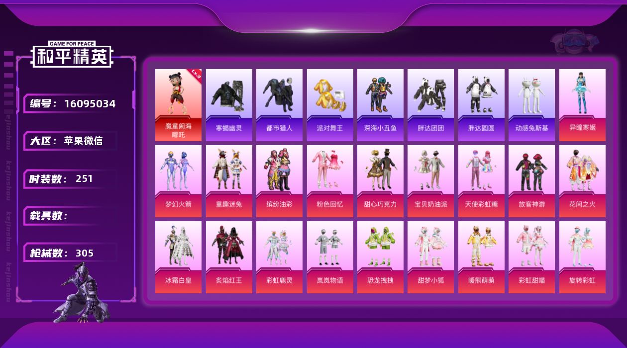 [16095034]苹果 微信-1神装-32粉装-14特效枪-0载具-10粉色飞行器-119523热力值-18王牌印记-251套装-305枪皮【红色神装等级】:魔童闹海-哪吒(三级)【红色角色神装】:魔童闹海-哪吒【热门品类】:粉装-梦幻火箭,粉装-童趣迷兔,粉装-缤纷油彩,套装-寒蝎幽灵,套装-浪漫天命,套装-都市猎人,套装-派对舞王,套装-深海小丑鱼,套装-小丑鱼,套装-胖达团团,套装-胖达圆圆,套装-动感兔斯基人偶服,角色-2B战斗服款,套装-龟仙人,套装-潮萌小黄鸭,套装-暗影哥特,套装-糯粉咩咩,角色-8号机,角色-Mark.06【粉色套装】:粉装-粉色回忆,粉装-甜心巧克力,粉装-宝贝奶油派,粉装-天使彩虹糖,粉装-梦幻火箭,粉装-缤纷油彩,粉装-放客神游,粉装-花间之火,粉装-冰霜白皇,粉装-童趣迷兔,粉装-炙焰红王,粉装-彩虹鹿灵,粉装-岚岚物语,粉装-恐龙拽拽,粉装-甜梦小狐,粉装-暖熊萌萌,粉装-彩虹甜喵,粉装-旋转彩虹,粉装-冰川幽秘,粉装-冰川红玫,粉装-第五大道,粉装-仲夏莫吉托,角色-白勺歌姬,粉装-炫光之旅,角色-蔷薇星,角色-水仙星,角色-星梦奇缘,角色-初号机 觉醒Ver.,角色-千金淑猫,角色-萨利娅,粉装-幻彩电音,角色-异瞳寒姬【粉色枪皮等级】:SCAR-L-青春物语(一级),SCAR-L-纯梦嫁纱(四级),M416-五爪金龙(七级),GROZA-旋转彩虹(六级),UMP45-相思残雪(二级),UMP45-恐龙拽拽(七级),AKS-74U-星穹咏叹调(六级),P90-魔童闹海 敖丙(三级),Kar98K-巳巳如意(五级),Mk14-盛世惊鸿(三级),M417-第五大道(五级),M249-彩虹甜喵(四级),DP-28-豹影疾电(五级),MG3-洛神天依(二【粉色枪皮】:SCAR-L-青春物语,SCAR-L-纯梦嫁纱,M416-五爪金龙,GROZA-旋转彩虹,UMP45-相思残雪,UMP45-恐龙拽拽,AKS-74U-星穹咏叹调,P90-魔童闹海 敖丙,Kar98K-巳巳如意,Mk14-盛世惊鸿,M417-第五大道,M249-彩虹甜喵,DP-28-豹影疾电,MG3-洛神天依【粉色飞行器】:相思残雪飞行器,超新星飞行器,镜域双华-灵镜之阶,龙翔九天飞行器,圣域金龙飞行器,雀灵庇佑飞行器,灵珠游龙飞行器,暮色之舞飞行器