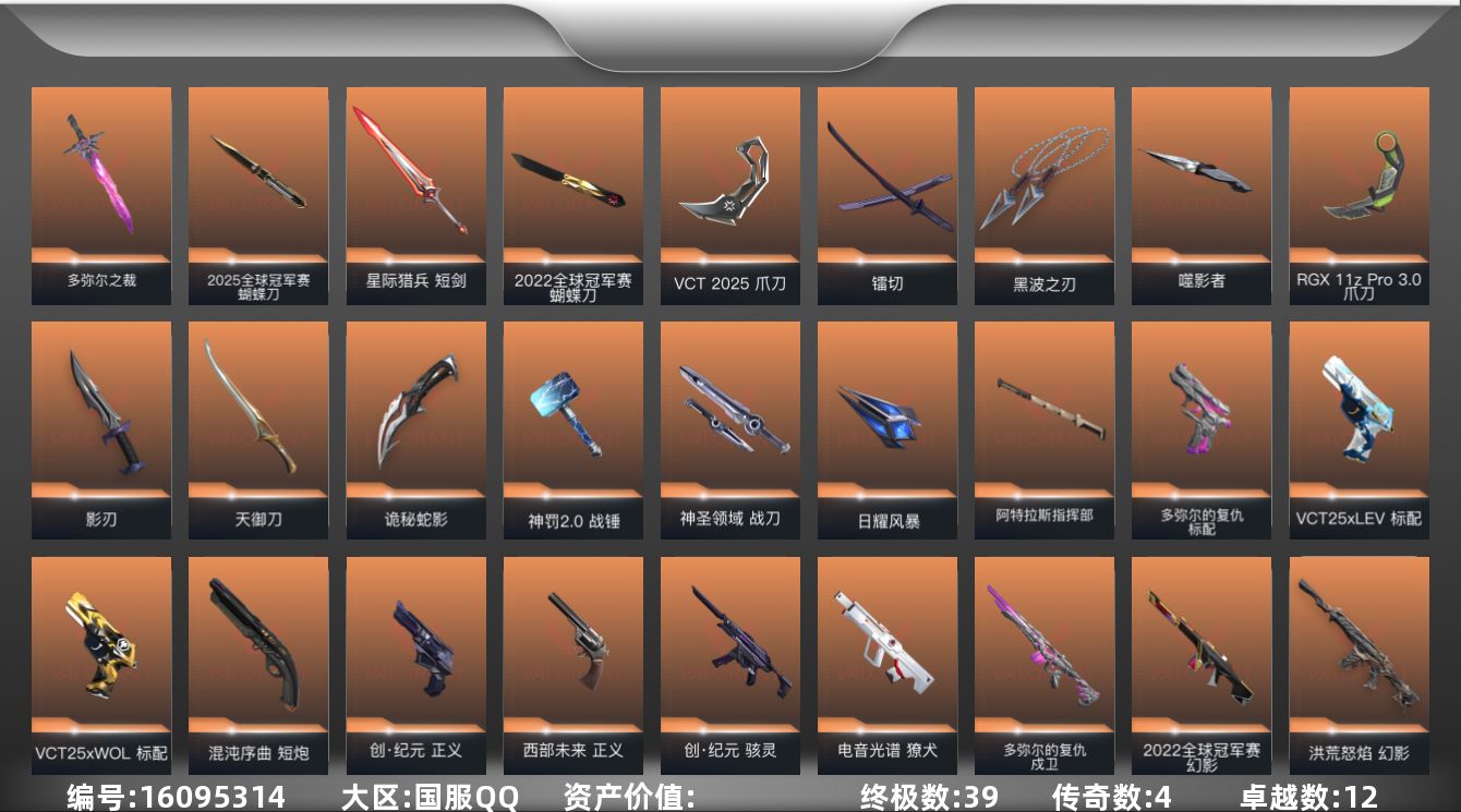 [16095314]【套装】:2025全球冠军赛套装,2022全球冠军赛套装,多弥尔的复仇套装,VCT 2025 赛季套装,创·纪元套装 【英雄】:幻棱,炼狱,维斯,暮蝶,钛狐,壹决,捷风,雷兹,幽影,不死鸟,贤者,猎枭,蝰蛇,零,芮娜,奇乐,尚勃勒,霓虹,盖可,钢锁 【近战武器】:近战武器-2025全球冠军赛 蝴蝶刀,近战武器-2022全球冠军赛 蝴蝶刀,近战武器-多弥尔之裁,近战武器-VCT 2025 爪刀,近战武器-RGX 11z Pro//3.0 爪刀,近战武器-黑波之刃,近战武器-噬影者 簇刃,近战武器-镭切,近战武器-天御刀,近战武器-影刃,近战武器-诡秘蛇影 军刀,近战武器-神罚//2.0 战锤,近战武器-神圣领域 战刀,近战武器-日耀风暴 遗器,近战武器-阿特拉斯指挥部 甩棍,近战武器-星际猎兵 短剑 【狂徒】:狂徒-艾沃莉的梦之翼,狂徒-2025全球冠军赛,狂徒-洪荒怒焰,狂徒-创·纪元,狂徒-虚空遗器,狂徒-RGX 11z Pro,狂徒-光荣异象,狂徒-多弥尔的复仇,狂徒-ORA x 颗秒,狂徒-掠影,狂徒-起源,狂徒-紫阙金琅,狂徒-离子武器//2.0,狂徒-荒土机兵,狂徒-永恒之砂,狂徒-诡秘蛇影,狂徒-神罚//2.0 【幻影】:幻影-源能者娱乐系统,幻影-2022全球冠军赛,幻影-洪荒怒焰,幻影-千灵华绽,幻影-侦察力量,幻影-神圣领域,幻影-神罚,幻影-末日之翼 【戍卫】:戍卫-多弥尔的复仇,戍卫-天界神兵,戍卫-紫阙金琅,戍卫-逆冲蛮牛,戍卫-月球哨兵,戍卫-折光棱晶 【獠犬】:獠犬-电音光谱,獠犬-神圣领域,獠犬-逆冲蛮牛,獠犬-电音光谱 【冥驹】:冥驹-偃月苍龙,冥驹-堕天遗武,冥驹-荒土机兵,冥驹-星云暗涌 【飞将】:飞将-末日之翼 【莽侠】:莽侠-创·纪元,莽侠-诡秘蛇影,莽侠-月球哨兵 【战神】:战神-盖亚的复仇//2.0,战神-神圣领域 【奥丁】:奥丁-多弥尔的复仇,奥丁-纳米打击,奥丁-神罚,奥丁-末日之翼 【判官】:判官-诡秘蛇影,判官-纳米打击x,判官-神罚 【雄鹿】:雄鹿-逆冲蛮牛,雄鹿-月球哨兵,雄鹿-神罚//2.0 【骇灵】:骇灵-创·纪元,骇灵-荒土机兵,骇灵-无限竞技,骇灵-星云暗涌 【蜂刺】:蜂刺-天界神兵,蜂刺-星云暗涌,蜂刺-折光棱晶 【标配】:标配-多弥尔的复仇,标配-堕天遗武,标配-荒土机兵,标配-折光棱晶 【VCT