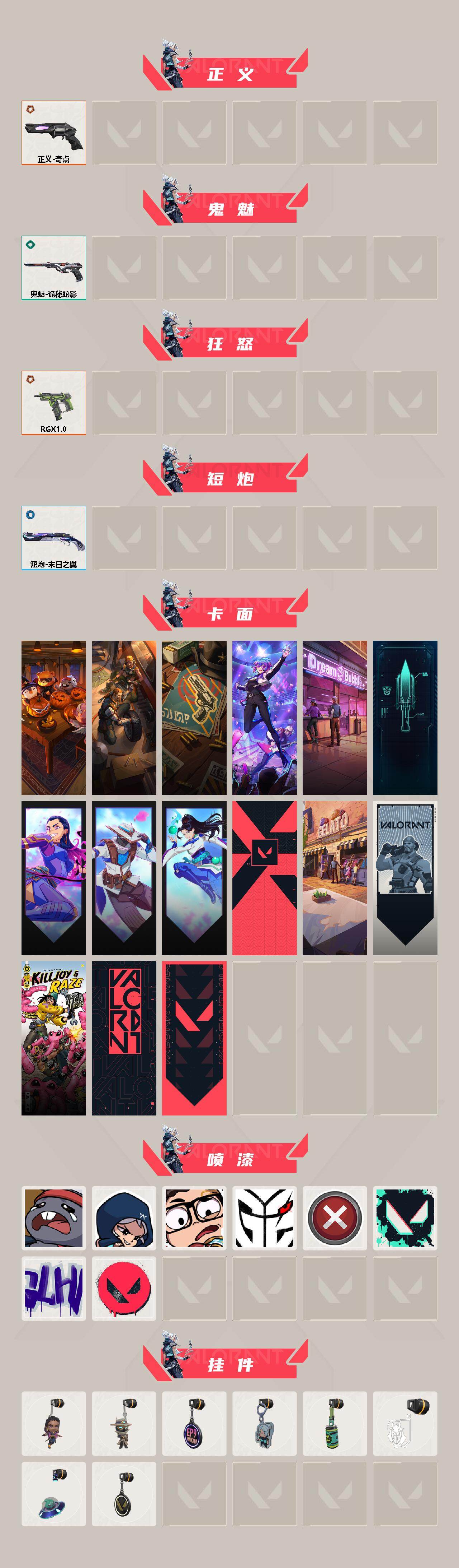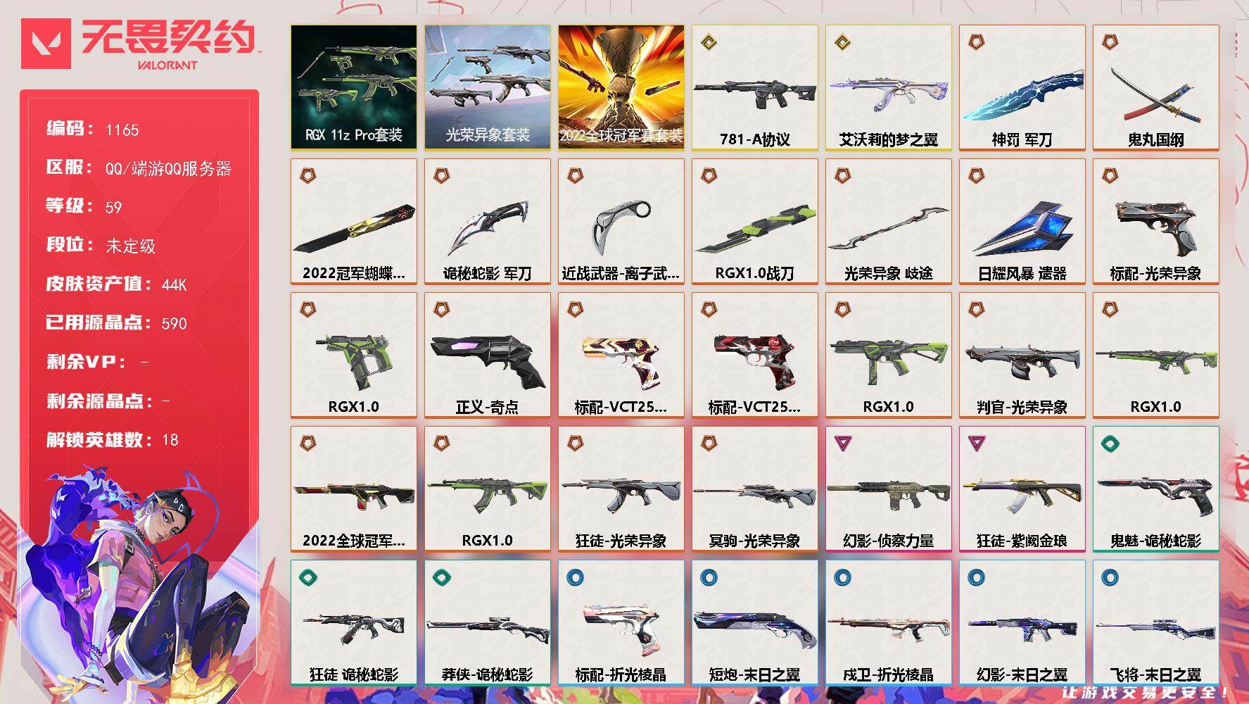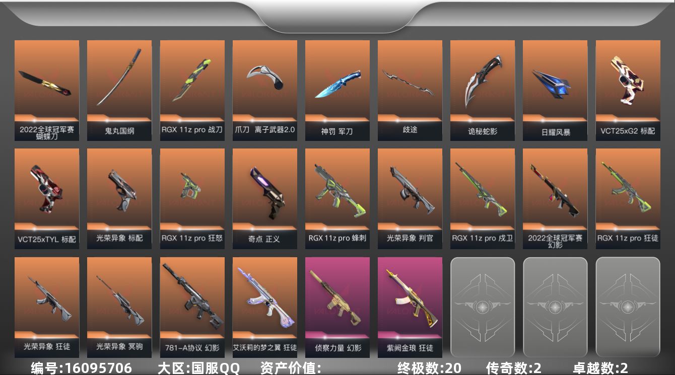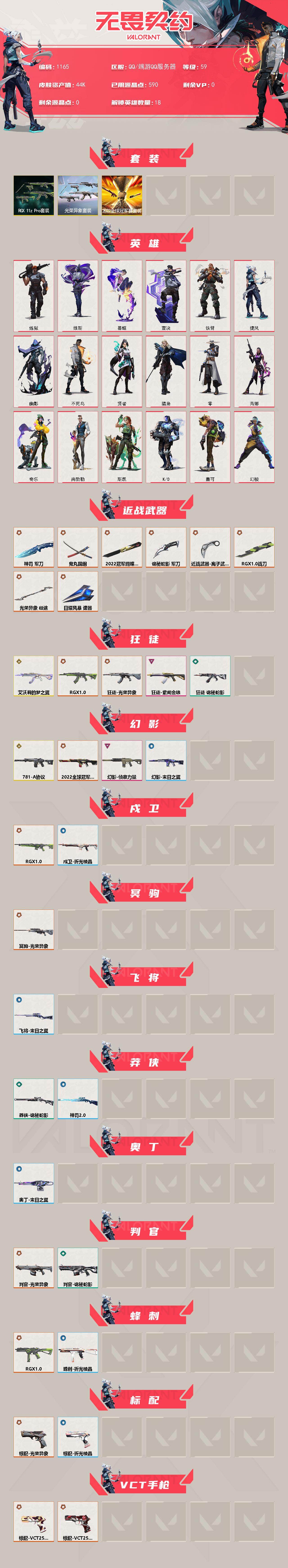 [16095706]【套装】:2022全球冠军赛套装,光荣异象套装,RGX 11z Pro套装 【英雄】:幻棱,炼狱,维斯,暮蝶,壹决,铁臂,捷风,幽影,不死鸟,贤者,猎枭,零,芮娜,奇乐,尚勃勒,斯凯,K/O,盖可 【近战武器】:近战武器-2022全球冠军赛 蝴蝶刀,近战武器-光荣异象 歧途,近战武器-RGX 11z Pro 战刀,近战武器-鬼丸国纲,近战武器-离子武器//2.0 爪刀,近战武器-神罚 军刀,近战武器-诡秘蛇影 军刀,近战武器-日耀风暴 遗器 【狂徒】:狂徒-艾沃莉的梦之翼,狂徒-RGX 11z Pro,狂徒-光荣异象,狂徒-紫阙金琅,狂徒-诡秘蛇影 【幻影】:幻影-781-A协议,幻影-2022全球冠军赛,幻影-侦察力量,幻影-末日之翼 【戍卫】:戍卫-RGX 11z Pro,戍卫-折光棱晶 【冥驹】:冥驹-光荣异象 【飞将】:飞将-末日之翼 【莽侠】:莽侠-诡秘蛇影,莽侠-神罚//2.0 【奥丁】:奥丁-末日之翼 【判官】:判官-光荣异象,判官-诡秘蛇影 【蜂刺】:蜂刺-RGX 11z Pro,蜂刺-折光棱晶 【标配】:标配-光荣异象,标配-折光棱晶 【VCT手枪】:标配-VCT25 x G2,标配-VCT25 x TYL 【正义】:正义-奇点 【鬼魅】:鬼魅-诡秘蛇影 【狂怒】:狂怒-RGX 11z Pro 【短炮】:短炮-末日之翼 【卡面】:南瓜盛典 卡面,修车达人 卡面,正义的化身 卡面,超能偶像 卡面,梦幻奶茶 卡面,零点嗅探设计图 卡面,无畏契约GO!第一卷:芮娜 卡面,无畏契约GO!第一卷:零 卡面,无畏契约GO!第一卷:贤者 卡面,代号红色 卡面,冰淇淋店 卡面,新兵报到 卡面,友军火力 卡面,V契约 卡面,无畏契约 卡面 【喷漆】:熊抱 喷漆,捷风差距 喷漆,新潮流 喷漆,VCT x G2 喷漆,买装还是存钱 喷漆,胜利属于无畏契约 喷漆,GLHF 喷漆,无畏契约 喷漆 【挂饰】:无畏契约GO!第一卷 芮娜 挂饰,无畏契约GO!第一卷 零 挂饰,第九季//第二幕 纪念币 挂饰,袖珍捷风 挂饰,Z世代特饮 挂饰,VCT x G2 挂饰,天外飞客 挂饰,无畏契约 纪念币 挂饰