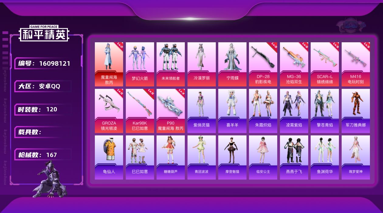 [16098121]【店主推荐捡漏号!可直接换绑】地铁满天赋 安卓 手Q-1神装-5粉装-7特效枪-0载具-4粉色飞行器-48820热力值-9王牌印记-120套装-167枪皮