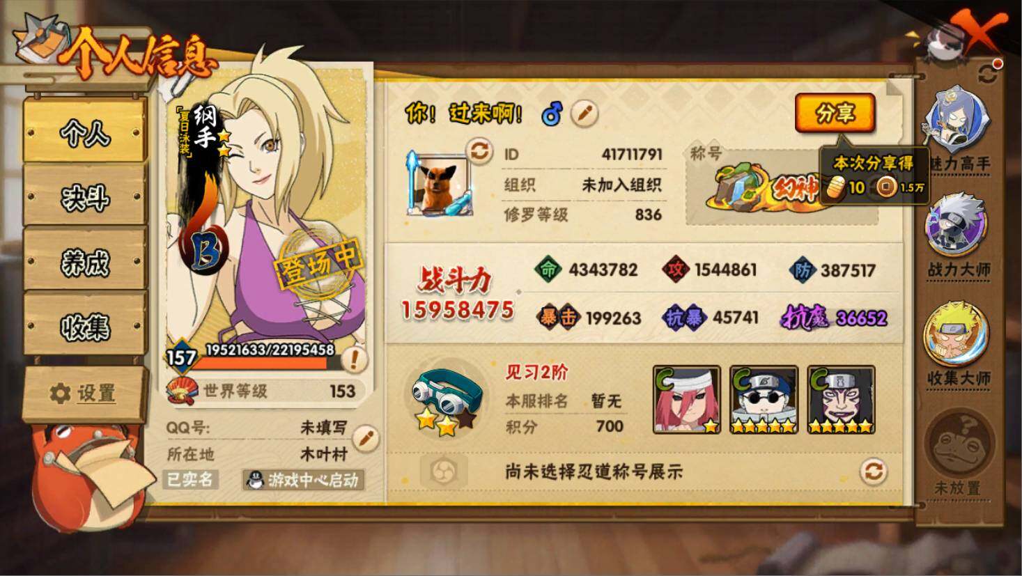 [16090235]41S级忍者数-61A级忍者数 QQ1皇冠 战力1600w,V12 880点券2.5W金币