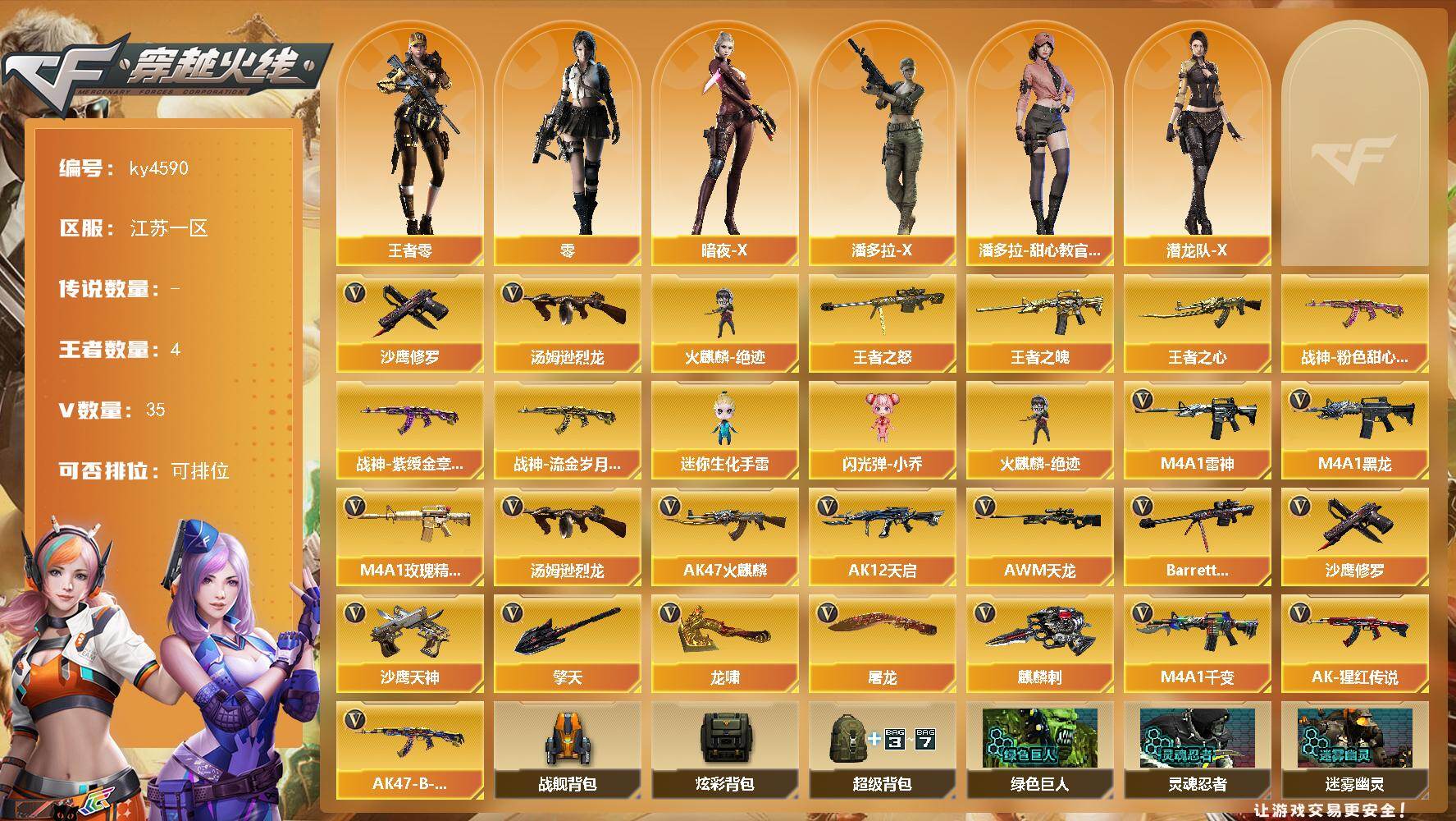 [16099633]江苏一区-35V-4王者-0炫金 【热门武器】:汤姆逊-烈龙*2,火麒麟-绝迹,沙鹰-修罗*6 【王者炫金武器】:王者之魄*2,王者之心,王者之怒 【皮肤】:战神-粉色甜心皮肤,战神-紫绶金章皮肤*2,战神-流金岁月皮肤 【角色】:零,王者-零,暗夜-X,潘多拉-X,潘多拉-甜心教官,潜龙队-X 【人偶武器】:火麒麟-绝迹,迷你生化手雷,闪光弹-小乔 【英雄级武器】:M4A1-千变*2,AK47-火麒麟,M4A1-黑龙,M4A1-雷神*2,AK12-天启*2,M4A1-玫瑰精灵,AK-47-猩红传说*4,AK47-B-战神,AWM-天龙,Barrett-毁灭,汤姆逊-烈龙*2,沙鹰-修罗*6,沙鹰-天神,屠龙*3,龙啸,擎天*2,麒麟刺*2 【道具】:战舰背包,炫彩背包,超级背包,绿色巨人,灵魂忍者,迷雾幽灵,夺命之镰,防化服*2,防弹头盔*2,防弹衣*2,C4工具钳*2,手雷包*2 【特殊枪械】:2烈龙
