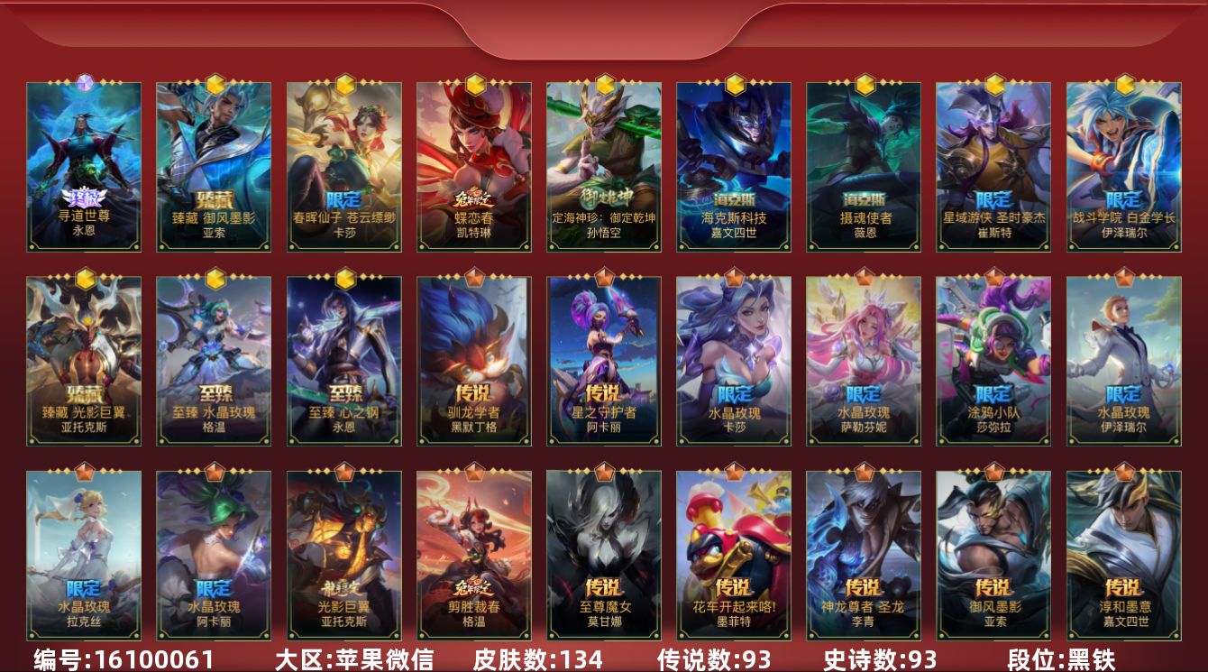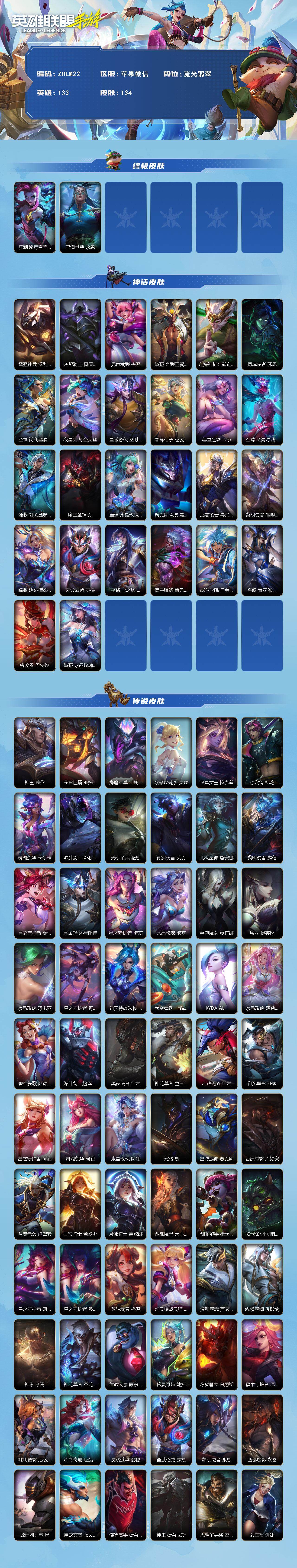 - [16286283]【店主推荐捡漏号】未定级段位-160英雄-303皮肤-12炫彩-0终极-3神话-40限定-24传说-80史诗 【珍稀头像】:红包头像 【热门头像】:卡特琳娜的匕首头像 【年限皮肤】:定海神珍孙悟空,你看见过我的熊猫吗安妮,美猴王孙悟空,司马懿仲达 【海克斯皮肤】:海克斯科技安妮 【情人节限定】:甜心宝贝安妮,觅心猎手薇恩 【冰雪限定】:幸福女神乐芙兰,圣诞开心鬼提莫,圣诞狂欢努努和威朗普,阿木木“主人不要我了”,平安夜女神娑娜,喜庆之树茂凯,雪默丁格,圣诞老人古拉加斯,圣诞驯鹿克格莫,冰雪节辛吉德,冰雪节玛尔扎哈 【神话皮肤】:十周年纪念安妮,源代码乐芙兰,海克斯科技安妮 【限定皮肤】:诺斯费拉图弗拉基米尔,冠军典狱长锤石,Fnatic嘉文四世,暗杀星蒙多,SKTT1李青,SSW辛吉德,胜利女神伊莉丝,胜利女神莫甘娜,胜利女神希维尔,胜利之树茂凯,胜利枪神格雷福斯,海贼瑞兹,南瓜头费德提克,鬼影重重魔腾,鬼影森森茂凯,蓝色忧郁崔斯特,女猎手希维尔,外星装甲库奇,暗影沃里克,都铎王朝图奇,防暴士兵辛吉德,防暴天使凯尔,警用试作体K9内瑟斯 【传说皮肤】:魔幻卡牌崔斯特,血石领主弗拉基米尔,大天使长米迦勒凯尔,约德尔国队长提莫,女皇艾希,绅士科加斯,律政大亨蒙多,电玩女神娑娜,女主播迦娜,红色男爵库奇,最终BOSS维迦,女警狙击凯特琳,陆地王者4WD布里茨,苹果机器人布里茨,冰川巨兽墨菲特,丧尸布兰德,第三类接触黑默丁格,炼狱魔犬内瑟斯,死亡骑士盖伦,枯萎之壤泽拉斯,焰尾妖狐阿狸,符文战熊沃利贝尔,苍穹之光韦鲁斯,泳池派对吉格斯 【史诗皮肤】:安伯斯与提妮,科学怪熊的新娘安妮,铁钩船长费德提克,重生之沙费德提克,圣光审判凯尔,战争机器赛恩,战场公主希维尔,钢铁之心希维尔,月光女神阿忒弥斯索拉卡,兔宝宝提莫,火箭达人崔丝塔娜,荒野豺狼沃里克,女船长厄运小姐,国王泰达米尔,百夫长贾克斯,黑色荆棘莫甘娜,炼金狂士辛吉德,死神卡尔萨斯,小小骑士阿木木,熔火之心拉莫斯,贵族血统萨科,飞越疯人院萨科,武动巅峰萨科,战争血统蒙多,掠星魔刃卡萨丁,海克斯科技迦娜,寒冰女皇迦娜,血石诅咒塔里克,穿着正装的恶魔维迦,北领前线斯维因,抵抗军天使凯特琳,黑曜石守护者墨菲特,无畏号墨菲特,蓝焰梦魔魔腾,枯萎之壤雷克顿,龙骑统帅嘉文四世,凯旋英雄嘉文四世,灵骨工匠奥莉安娜,V字仇杀者布兰德,防弹