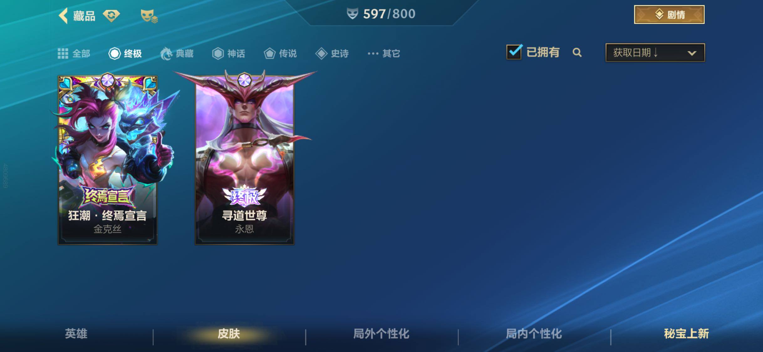 [16100061]【终极皮肤】:狂潮·终焉宣言 金克丝,寻道世尊 永恩 【神话皮肤】:星域游侠 圣时豪杰 崔斯特,魔王圣铠 劫,无声裁影 格温,摄魂使者 薇恩,至臻 深海奇域 莫甘娜,此志凌云 嘉文四世,臻藏 御风墨影 亚索,雷霆神兵 沃利贝尔,暮星追影 卡莎,灰烬骑士 莫德凯撒,至臻 锐利墨痕 薇恩,至臻 水晶玫瑰 格温,臻藏 水晶玫瑰 凯特琳,海克斯科技 嘉文四世,臻藏 光影巨翼 亚托克斯,蝶恋春 凯特琳,战斗学院 白金学长 伊泽瑞尔,夜星流火 金克丝,定海神珍:御定乾坤 孙悟空,春晖仙子 苍云缥缈 卡莎,满弓镇魂 箭无虚发 韦鲁斯,至臻 心之钢 永恩,臻藏 跳跳倩影 厄运小姐,黎明使者 破晓之殇 佛耶戈,至臻 青花瓷 丽桑卓,天命豪赌 瑟提 【传说皮肤】:跳跳倩影 厄运小姐,西部魔影 大小姐 蕾欧娜,至尊魔女 莫甘娜,幻灵特战灵猫 格温,秘灵奇境 婕拉,未来战士 凯特琳,驯龙学者 黑默丁格,神龙尊者 圣龙 李青,神王 德莱厄斯,花车开起来咯! 墨菲特,暗星女王 拉克丝,K/DA ALL OUT 萨勒芬妮,星之守护者 金克丝,双城之战:殊途 杰斯,源计划:毁灭 派克,星之守护者 落 霞,光影巨翼 亚托克斯,斗魂觉醒 莎弥拉,女主播 迦娜,北极星神 黛安娜,斗魂无双 亚索,灵魂莲华 瑟提,星之守护者 陨 洛,深海奇域 厄运小姐,真实伤害 艾克,星之守护者 阿卡丽,涂鸦小队 莎弥拉,神王 盖伦,西部魔影 卢锡安,灵魂莲华 卡尔玛,御风墨影 亚索,淳和墨意 嘉文四世,月蚀骑士 蕾欧娜,纵横墨澜 佛耶戈,神拳 李青,西部魔影 永恩,水晶玫瑰 卡莎,水晶玫瑰 凯特琳,水晶玫瑰 阿狸,水晶玫瑰 伊泽瑞尔,水晶玫瑰 萨勒芬妮,水晶玫瑰 阿卡丽,水晶玫瑰 拉克丝,源计划:林 易,律政大亨 蒙多医生,碧空长歌 萨勒芬妮,驯龙炮手 崔丝塔娜,源计划:泯灭 雷克顿,幻灵特战队长 菲奥娜,灵魂莲华 阿狸,神龙尊者 昼日真龙 亚索,灵魂莲华 锤石,剪胜裁春 格温,最终BOSS 维迦,星之守护者 卡莎,霸天零式 赛恩,源计划:联合 艾希,斗魂无双 卢锡安,光明哨兵 格雷福斯,太空律动 “猫猫”布里和里茨 布里茨,光明哨兵 薇恩,日蚀骑士 蕾欧娜,星域武神 贾克斯,魔女 伊芙琳,黎明使者 赵信,战斗学院 伊泽瑞尔,星之守护者 阿狸,心之钢 凯隐,源计划:超体 莫德凯撒,凝辉黯刃 泰隆,奋武昭威 瑟提,海魔至