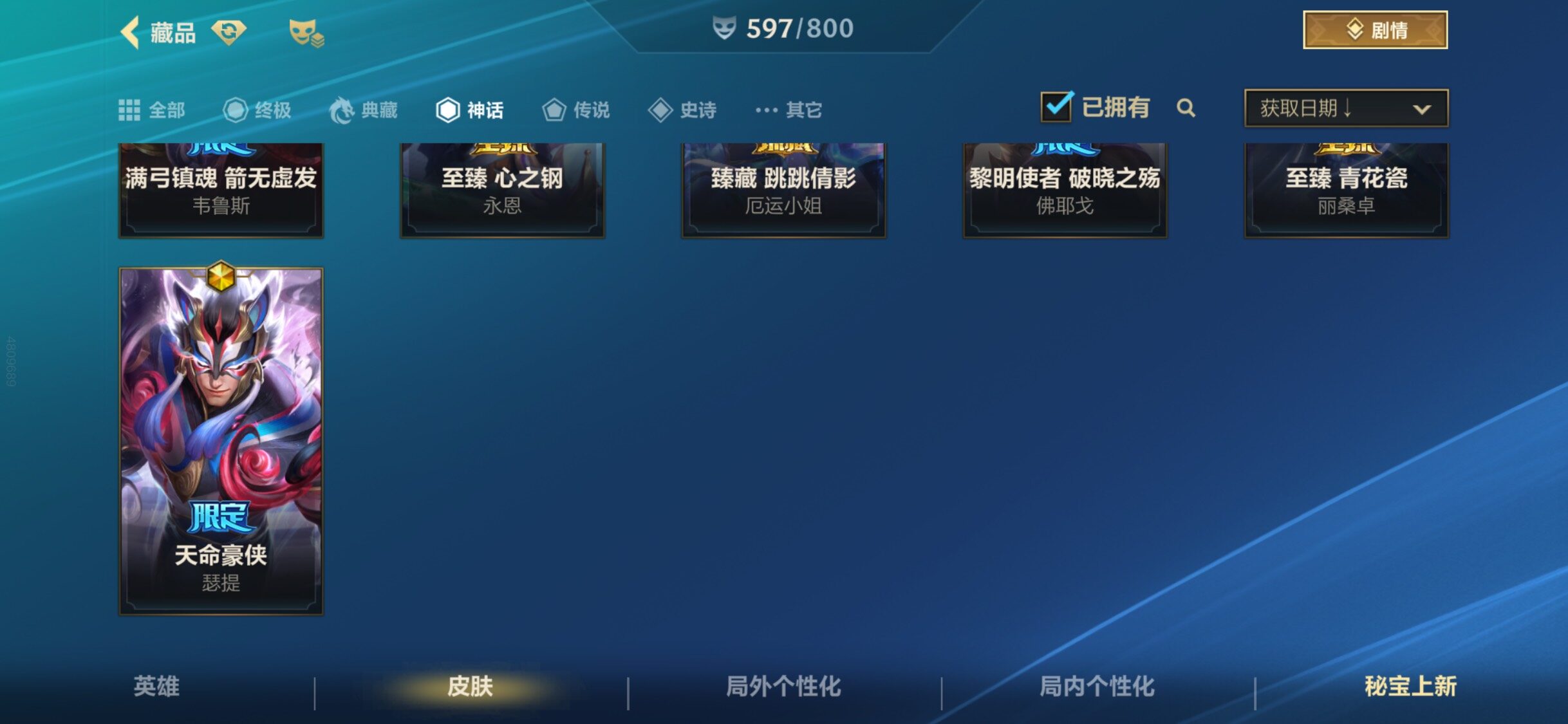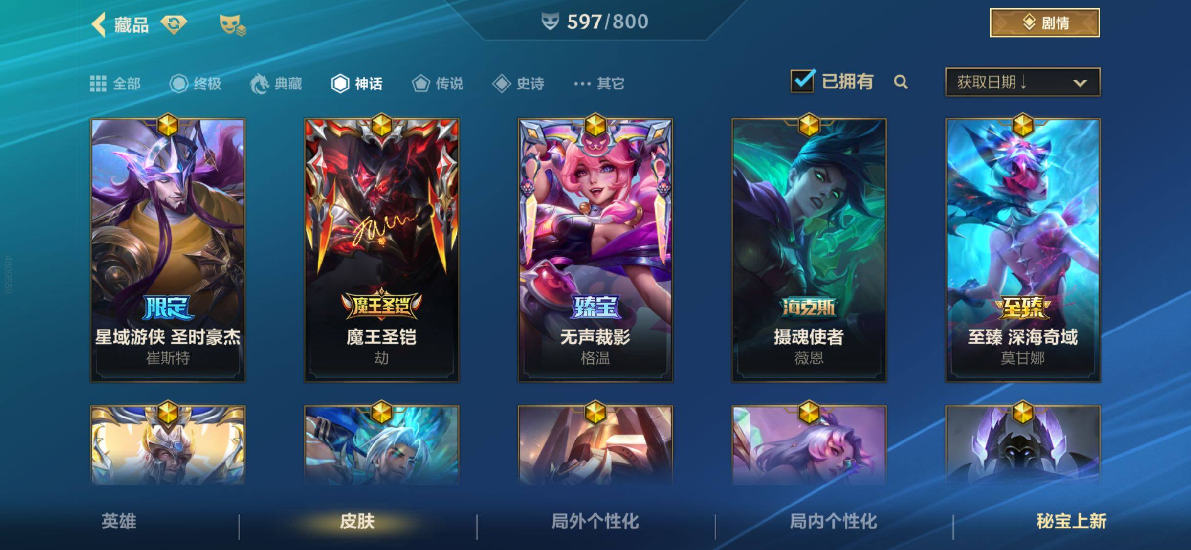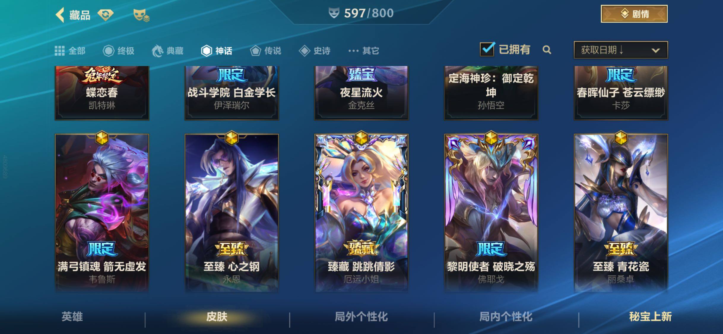 【神话皮肤】:星域游侠 圣时豪杰 崔斯特,魔王圣铠 劫,无声裁影 格温,摄魂使者 薇恩,至臻 深海奇域 莫甘娜,此志凌云 嘉文四世,臻藏 御风墨影 亚索,雷霆神兵 沃利贝尔,暮星追影 卡莎,灰烬骑士 莫德凯撒,至臻 锐利墨痕 薇恩,至臻 水晶玫瑰 格温,臻藏 水晶玫瑰 凯特琳,海克斯科技 嘉文四世,臻藏 光影巨翼 亚托克斯,蝶恋春 凯特琳,战斗学院 白金学长 伊泽瑞尔,夜星流火 金克丝,定海神珍:御定乾坤 孙悟空,春晖仙子 苍云缥缈 卡莎,满弓镇魂 箭无虚发 韦鲁斯,至臻 心之钢 永恩,臻藏 跳跳倩影 厄运小姐,黎明使者 破晓之殇 佛耶戈,至臻 青花瓷 丽桑卓,天命豪赌 瑟提