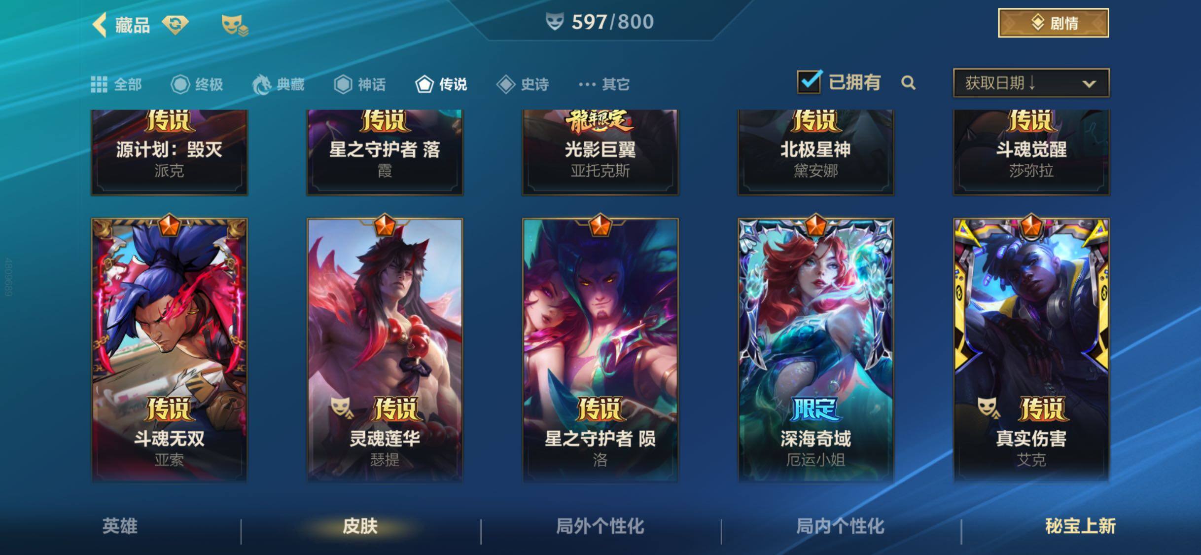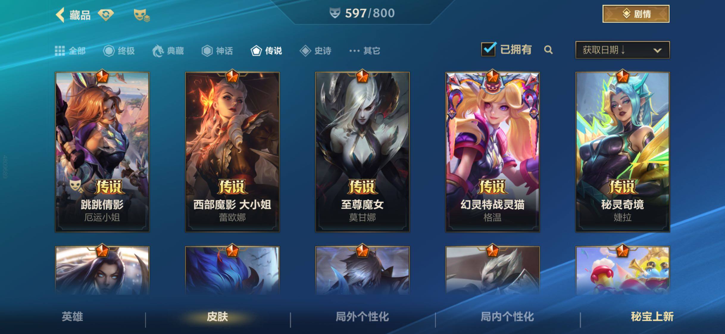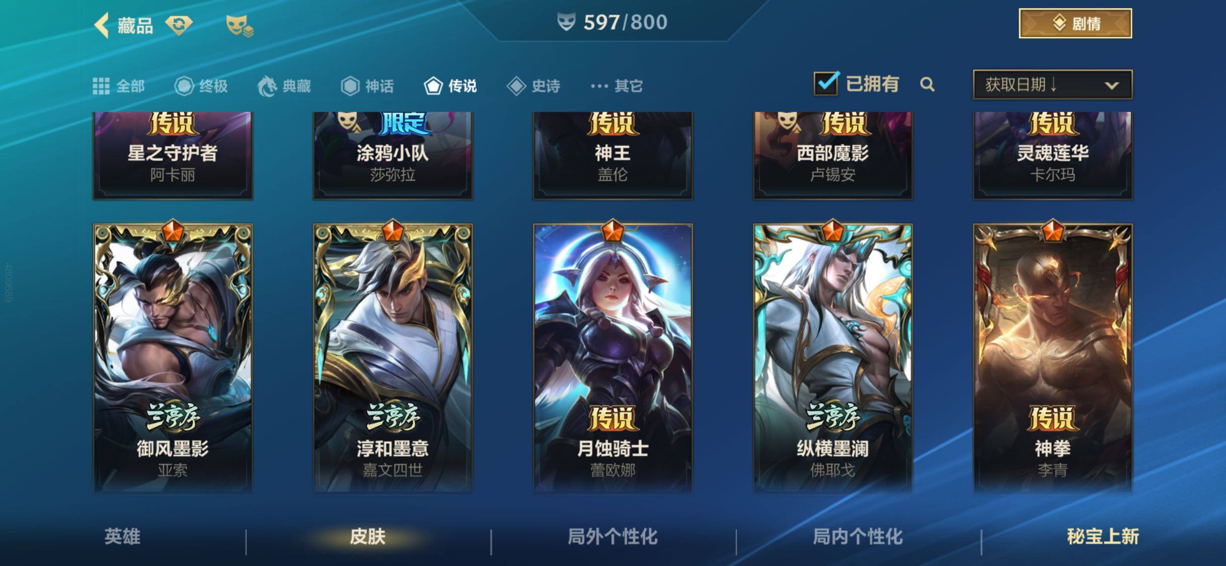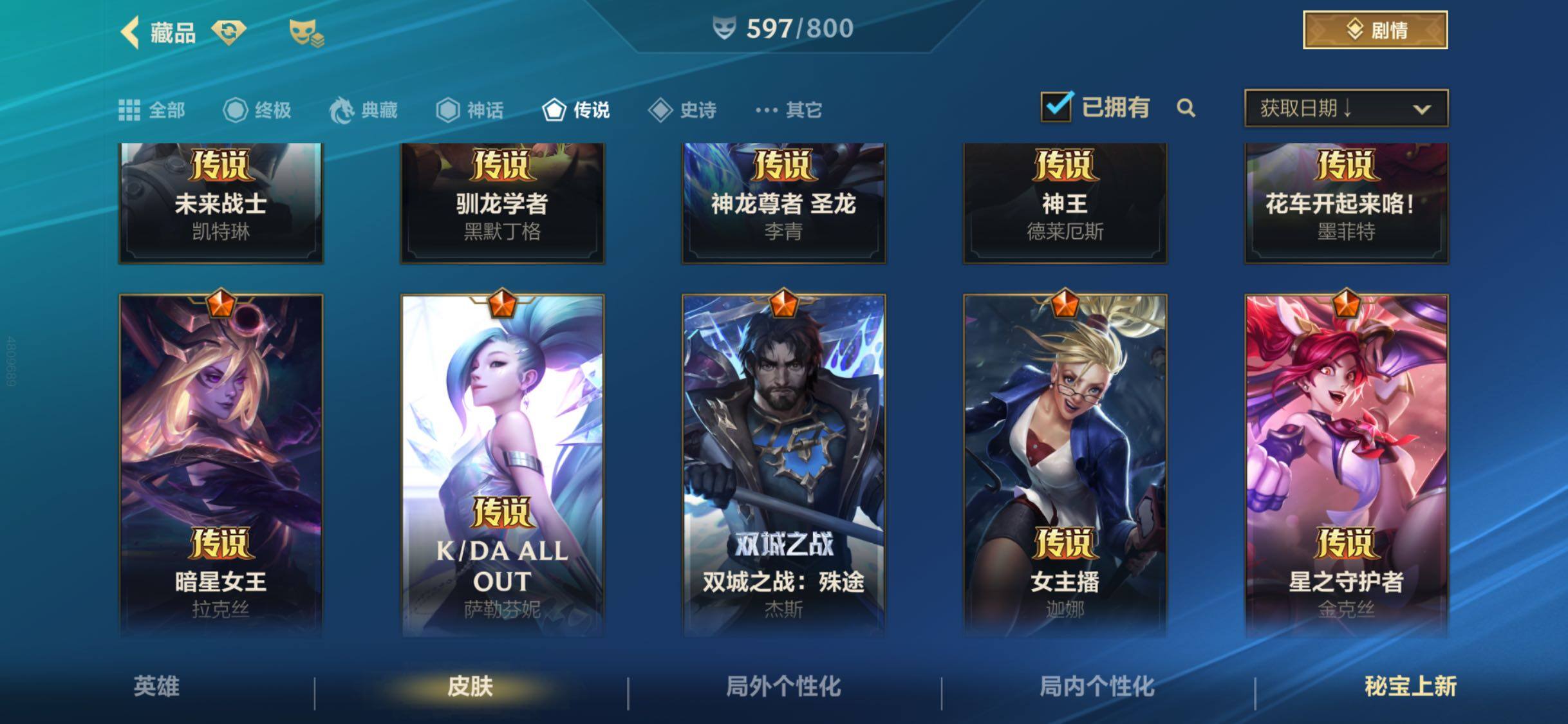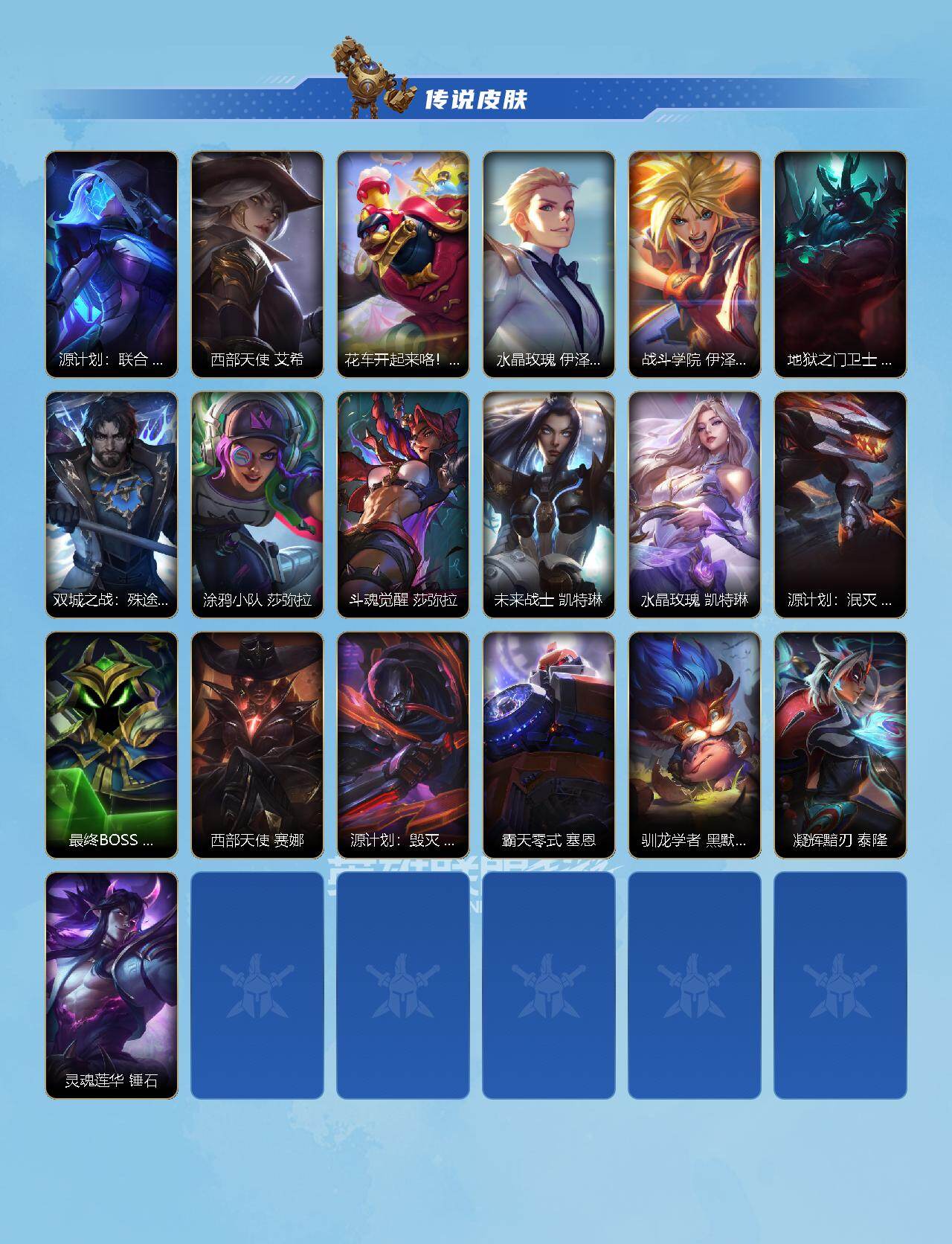 【传说皮肤】:跳跳倩影 厄运小姐,西部魔影 大小姐 蕾欧娜,至尊魔女 莫甘娜,幻灵特战灵猫 格温,秘灵奇境 婕拉,未来战士 凯特琳,驯龙学者 黑默丁格,神龙尊者 圣龙 李青,神王 德莱厄斯,花车开起来咯! 墨菲特,暗星女王 拉克丝,K/DA ALL OUT 萨勒芬妮,星之守护者 金克丝,双城之战:殊途 杰斯,源计划:毁灭 派克,星之守护者 落 霞,光影巨翼 亚托克斯,斗魂觉醒 莎弥拉,女主播 迦娜,北极星神 黛安娜,斗魂无双 亚索,灵魂莲华 瑟提,星之守护者 陨 洛,深海奇域 厄运小姐,真实伤害 艾克,星之守护者 阿卡丽,涂鸦小队 莎弥拉,神王 盖伦,西部魔影 卢锡安,灵魂莲华 卡尔玛,御风墨影 亚索,淳和墨意 嘉文四世,月蚀骑士 蕾欧娜,纵横墨澜 佛耶戈,神拳 李青,西部魔影 永恩,水晶玫瑰 卡莎,水晶玫瑰 凯特琳,水晶玫瑰 阿狸,水晶玫瑰 伊泽瑞尔,水晶玫瑰 萨勒芬妮,水晶玫瑰 阿卡丽,水晶玫瑰 拉克丝,源计划:林 易,律政大亨 蒙多医生,碧空长歌 萨勒芬妮,驯龙炮手 崔丝塔娜,源计划:泯灭 雷克顿,幻灵特战队长 菲奥娜,灵魂莲华 阿狸,神龙尊者 昼日真龙 亚索,灵魂莲华 锤石,剪胜裁春 格温,最终BOSS 维迦,星之守护者 卡莎,霸天零式 赛恩,源计划:联合 艾希,斗魂无双 卢锡安,光明哨兵 格雷福斯,太空律动 “猫猫”布里和里茨 布里茨,光明哨兵 薇恩,日蚀骑士 蕾欧娜,星域武神 贾克斯,魔女 伊芙琳,黎明使者 赵信,战斗学院 伊泽瑞尔,星之守护者 阿狸,心之钢 凯隐,源计划:超体 莫德凯撒,凝辉黯刃 泰隆,奋武昭威 瑟提,海魔至